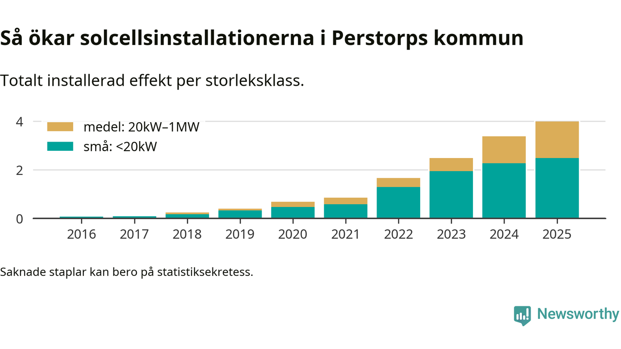 Totalt finns 252 nätanslutna anläggningar, om sammanlagt 4 megawatt i kommunen. Det motsvarar, i runda tal, en elproduktion på någonstans mellan 23 och 24 procent av vad hushållen i Perstorp förbrukar per år.1