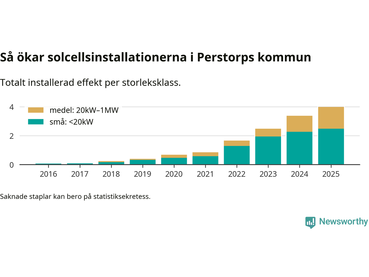 Det är framför allt de stora anläggningarna som driver tillväxten. Småskalig solel dominerar fortfarande produktionen – mer än hälften av effekten finns i anläggningar under 20 kilowatt – men det är bland de stora anläggningarna vi ser den största ökningstakten.
