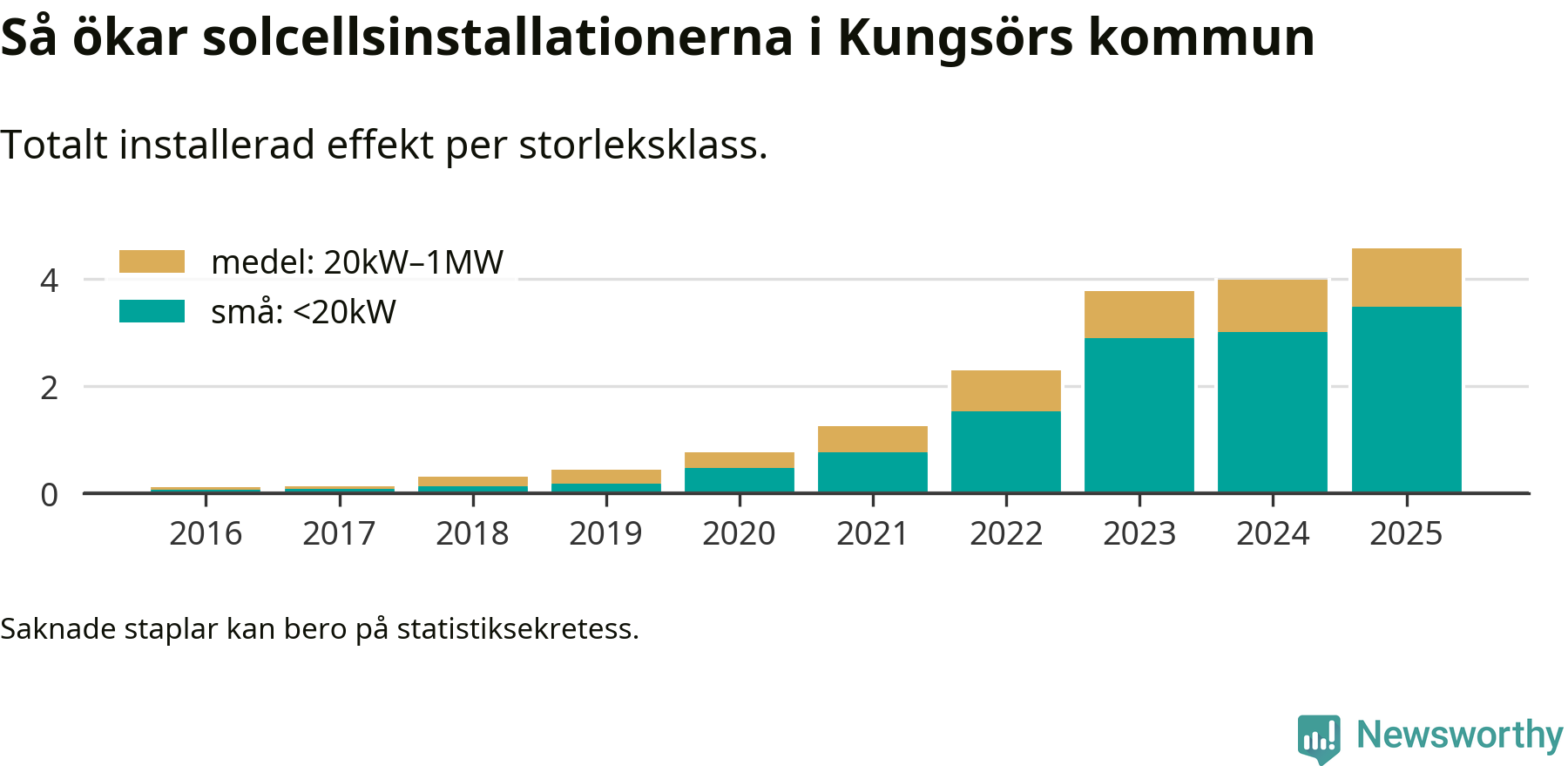 Det är framför allt de stora anläggningarna som driver tillväxten. Småskalig solel dominerar fortfarande produktionen – mer än hälften av effekten finns i anläggningar under 20 kilowatt – men det är bland de stora anläggningarna vi ser den största ökningstakten.