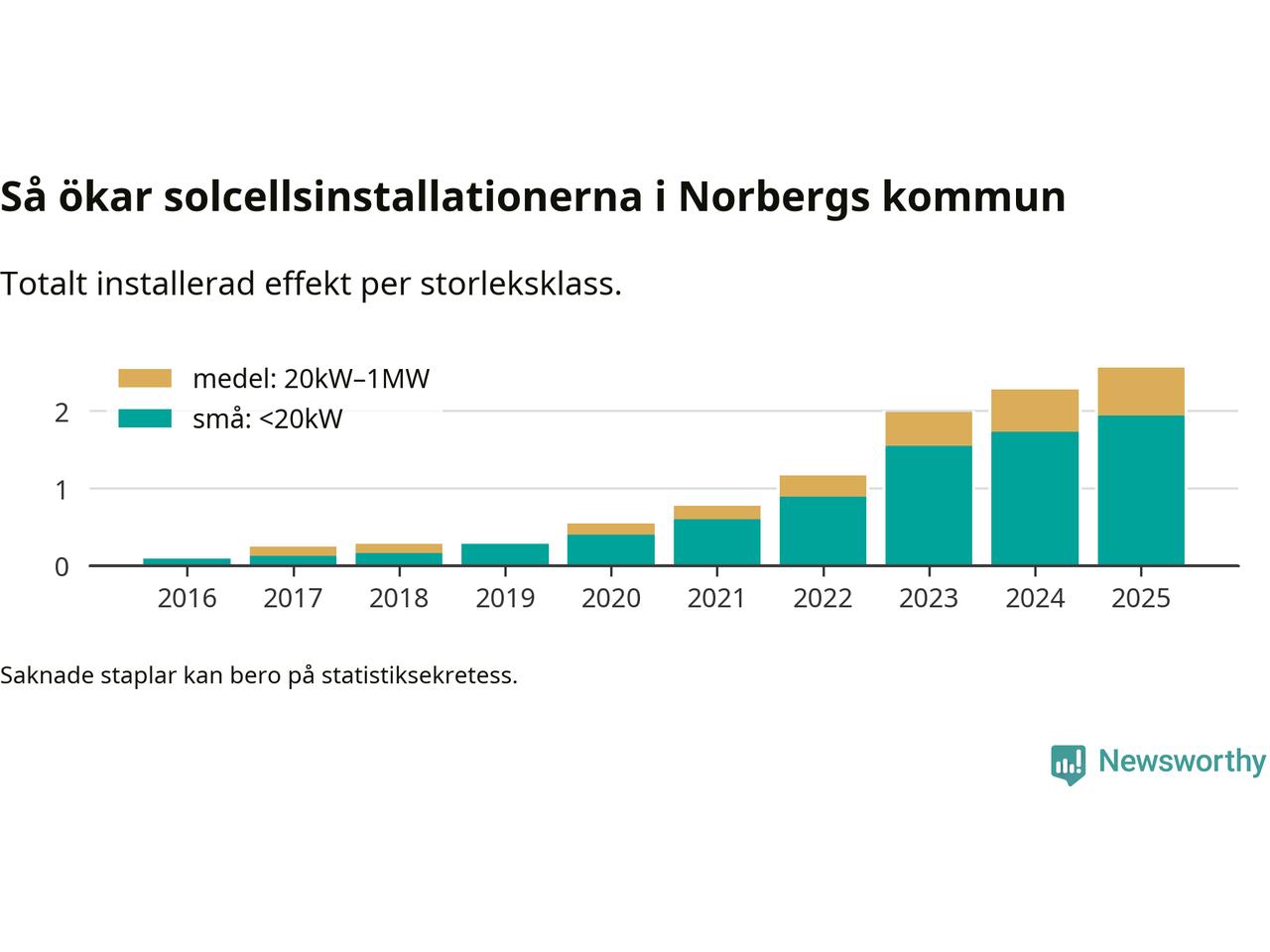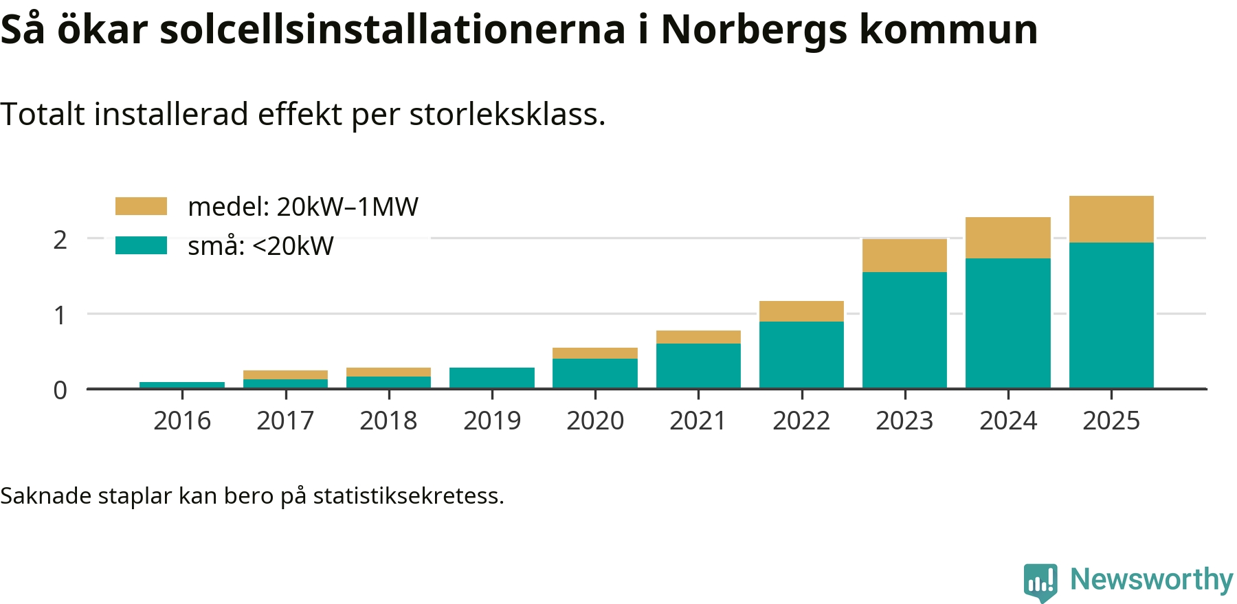 Det är framför allt de stora anläggningarna som driver tillväxten. Småskalig solel dominerar fortfarande produktionen – mer än hälften av effekten finns i anläggningar under 20 kilowatt – men det är bland de stora anläggningarna vi ser den största ökningstakten.