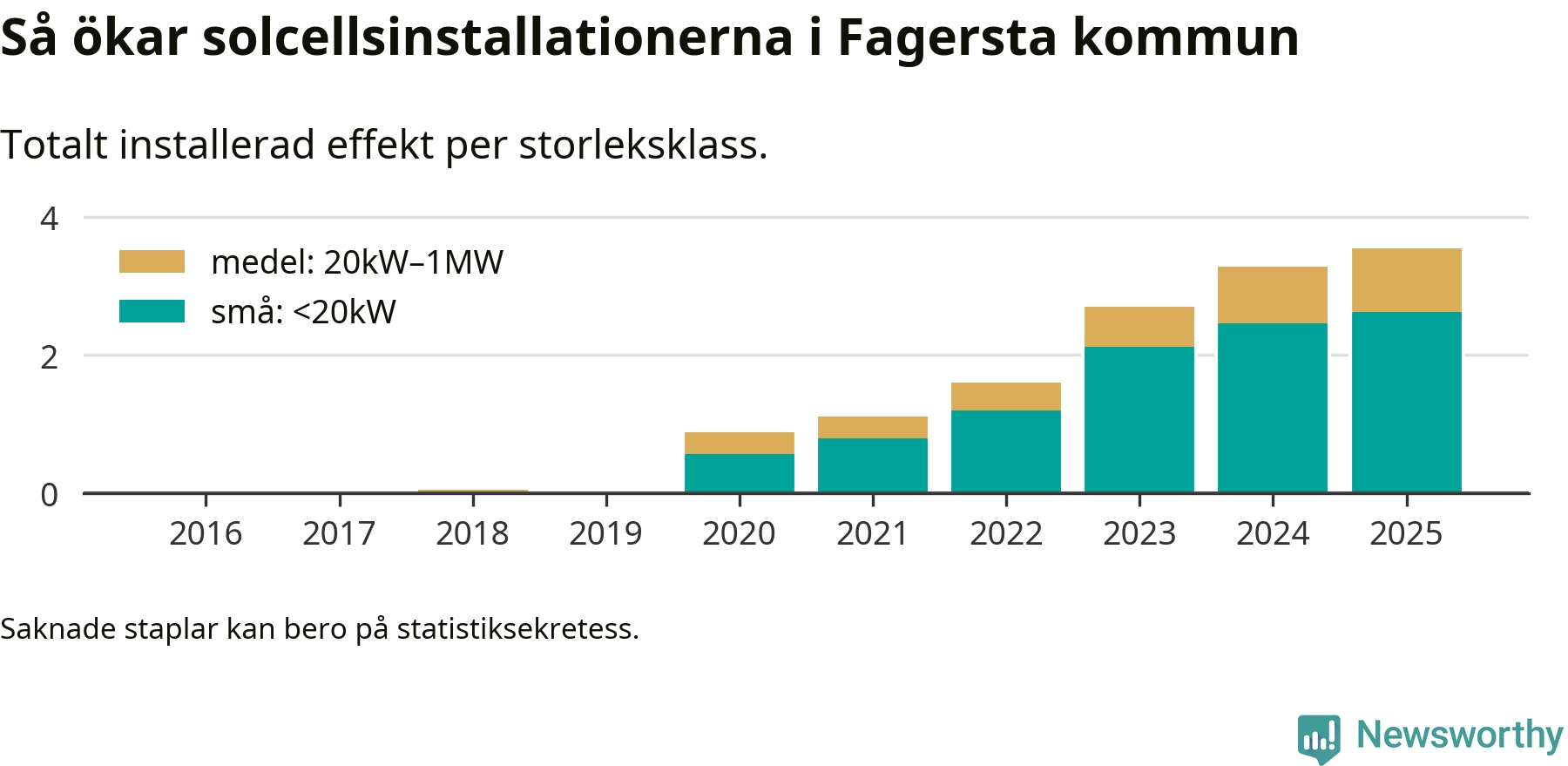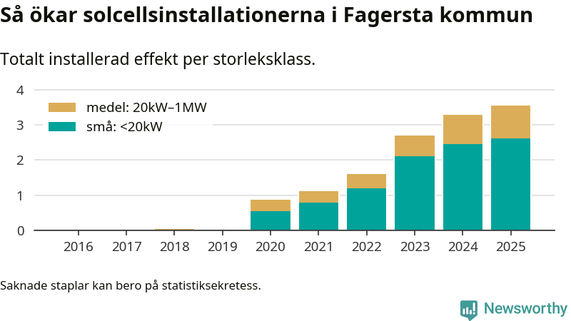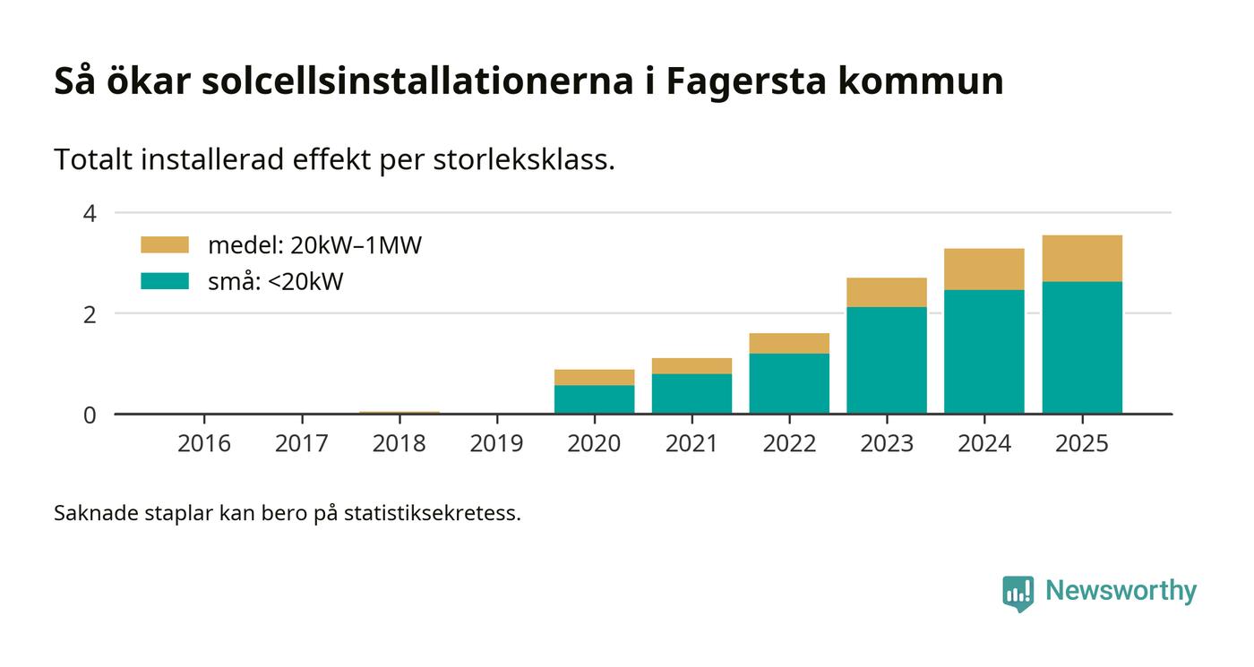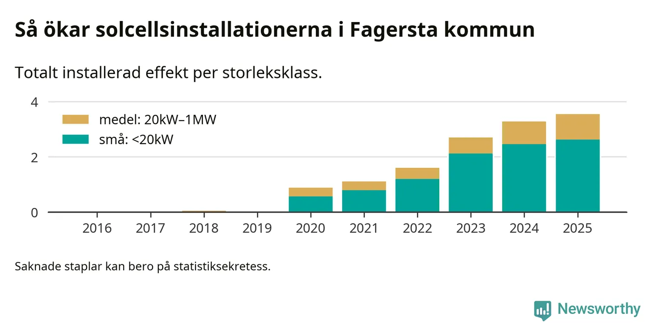 Det är framför allt de stora anläggningarna som driver tillväxten. Småskalig solel dominerar fortfarande produktionen – mer än hälften av effekten finns i anläggningar under 20 kilowatt – men det är bland de stora anläggningarna vi ser den största ökningstakten.