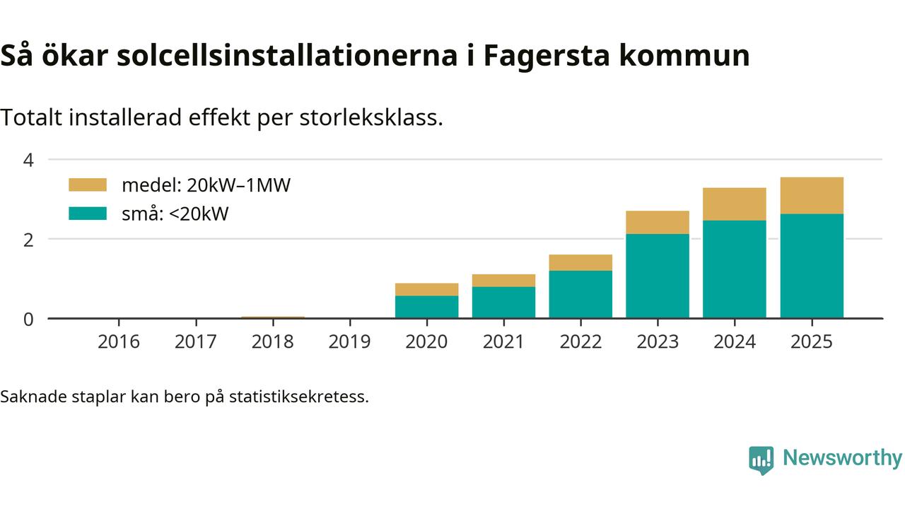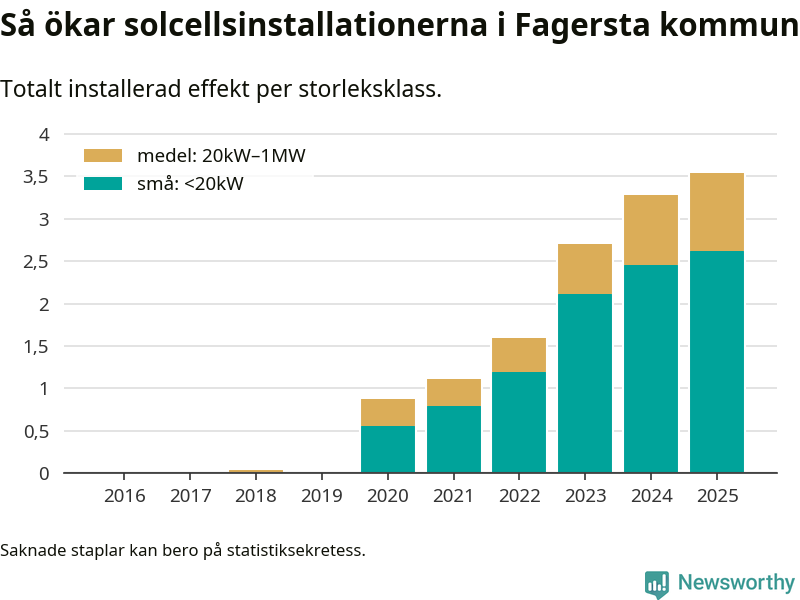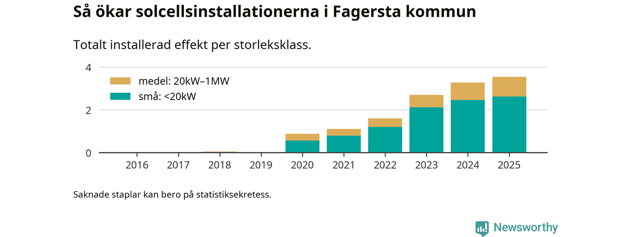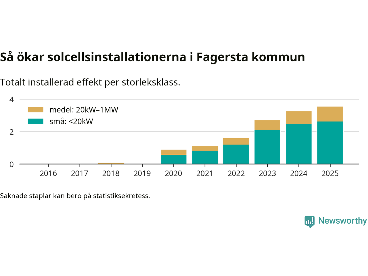 Det är framför allt de stora anläggningarna som driver tillväxten. Småskalig solel dominerar fortfarande produktionen – mer än hälften av effekten finns i anläggningar under 20 kilowatt – men det är bland de stora anläggningarna vi ser den största ökningstakten.