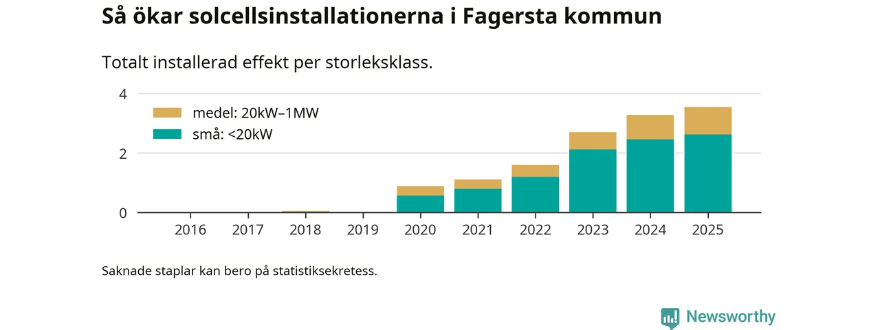 Den största delen av solelen i Fagersta, 74 procent, kommer från småskaliga anläggningar, totalt 244 stycken. Det påminner om hur det ser ut i riket som helhet. I hela Sverige står anläggningar under 20 kilowatt för mer än hälften av den installerade effekten. Generellt är deras andel störst i kommuner med många villahushåll, medan större anläggningar dominerar i tätbefolkade kommuner med fler flerfamiljsbostäder – och förstås i de småkommuner som har någon av landets stora markanläggningar för solel.