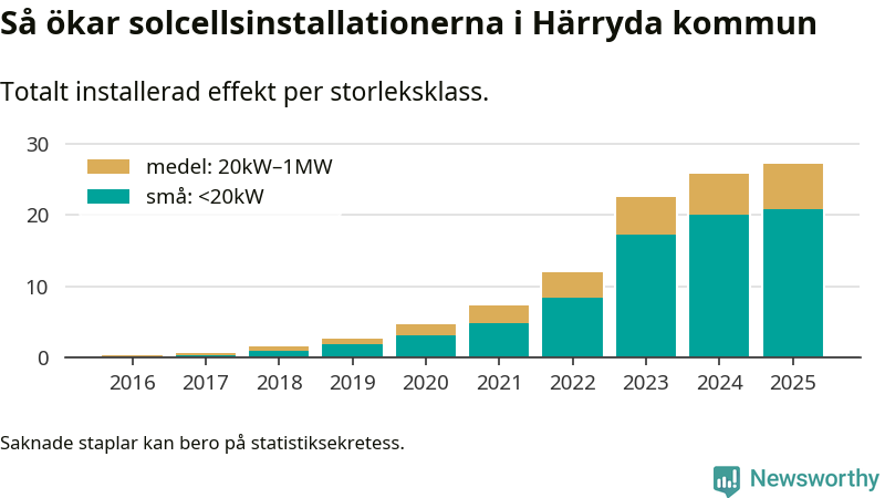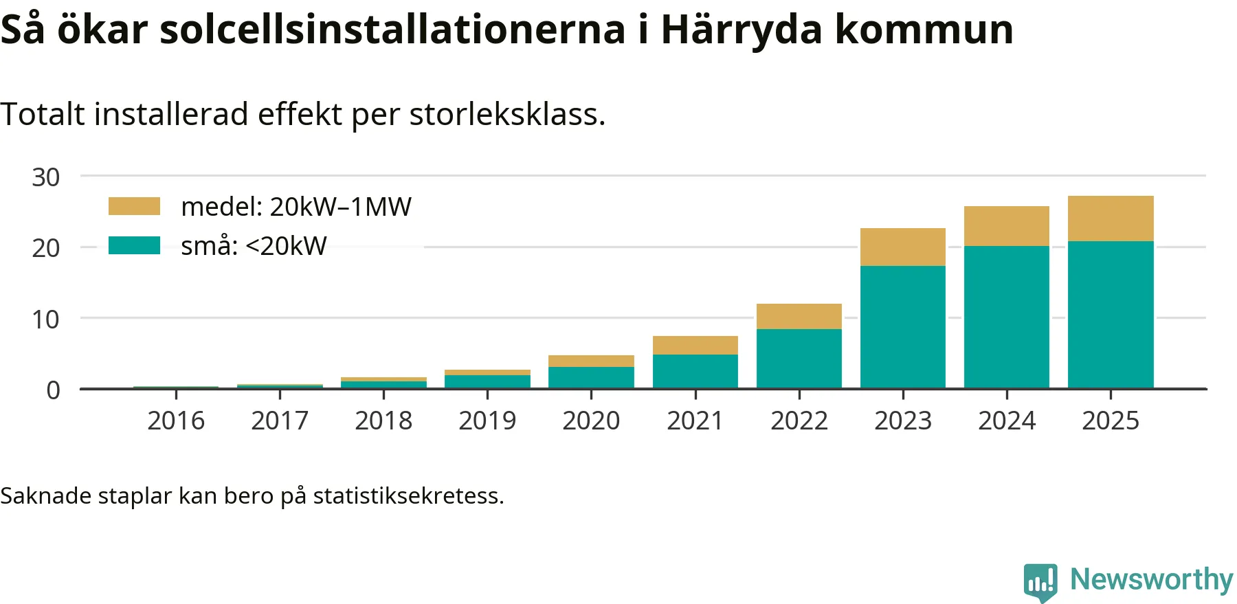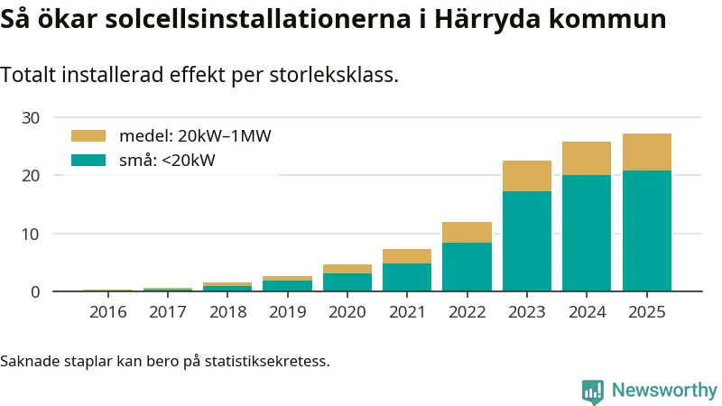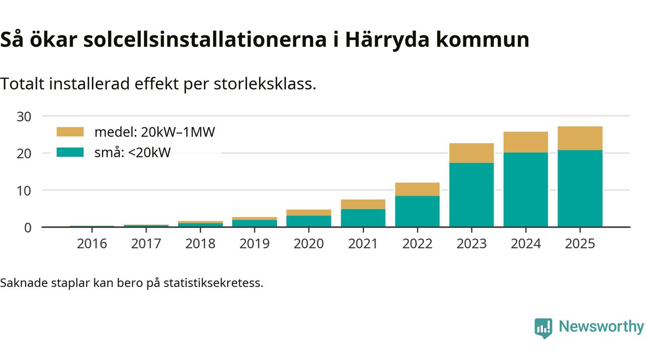 Den största delen av solelen i Härryda, 77 procent, kommer från småskaliga anläggningar, totalt 1 944 stycken. Det påminner om hur det ser ut i riket som helhet. I hela Sverige står anläggningar under 20 kilowatt för mer än hälften av den installerade effekten. Generellt är deras andel störst i kommuner med många villahushåll, medan större anläggningar dominerar i tätbefolkade kommuner med fler flerfamiljsbostäder – och förstås i de småkommuner som har någon av landets stora markanläggningar för solel.