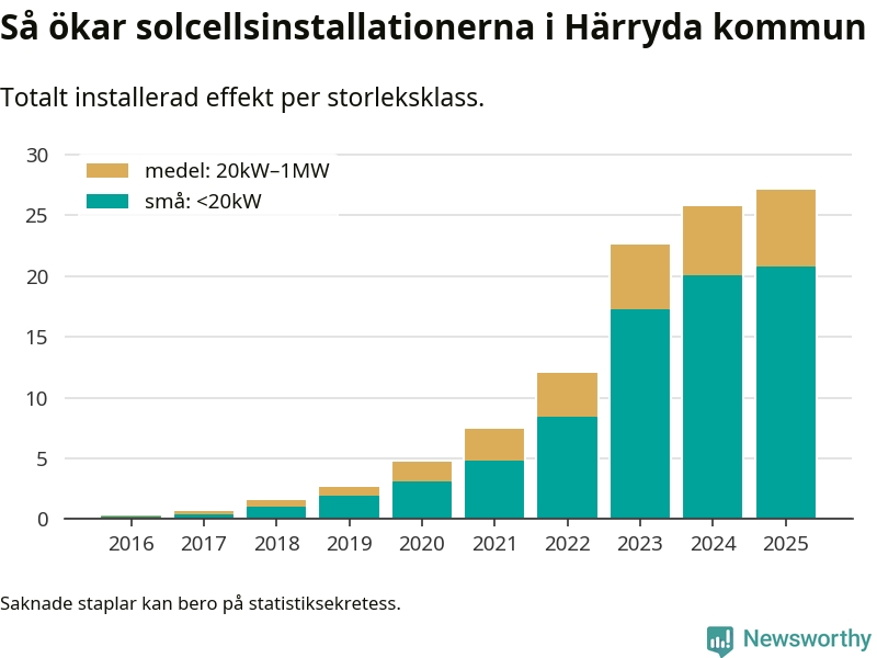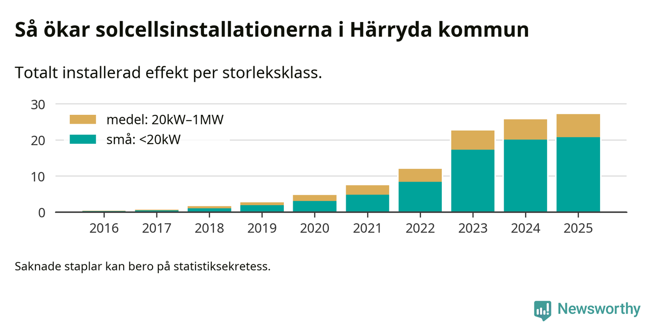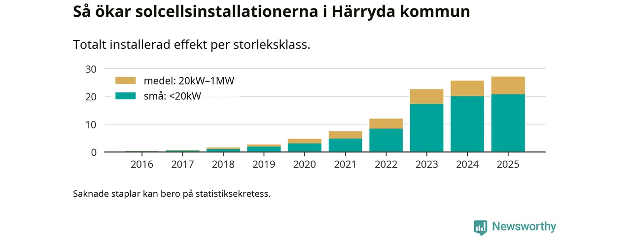 Under 2025 anslöts 1,4 megawatt ny solel till elnätet i Härryda kommun, en ökning med 5 procent jämfört med året innan.