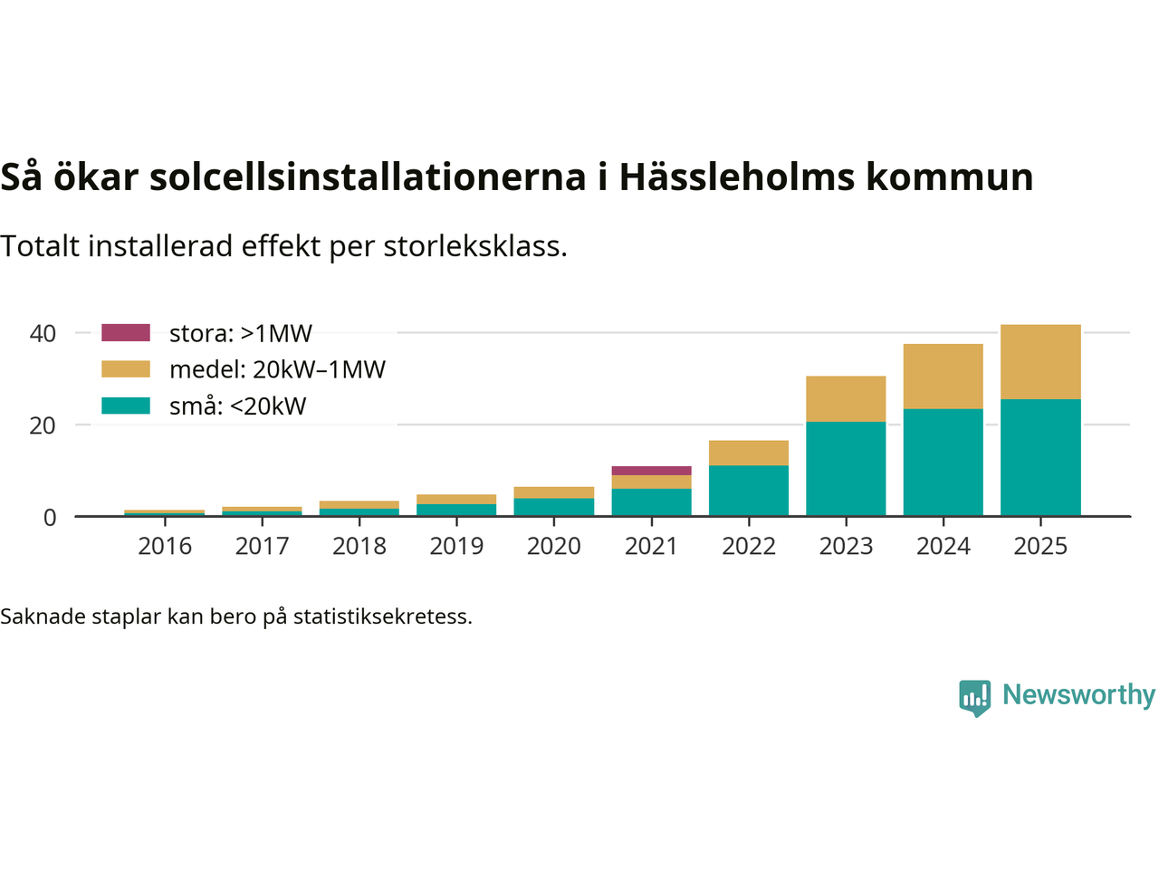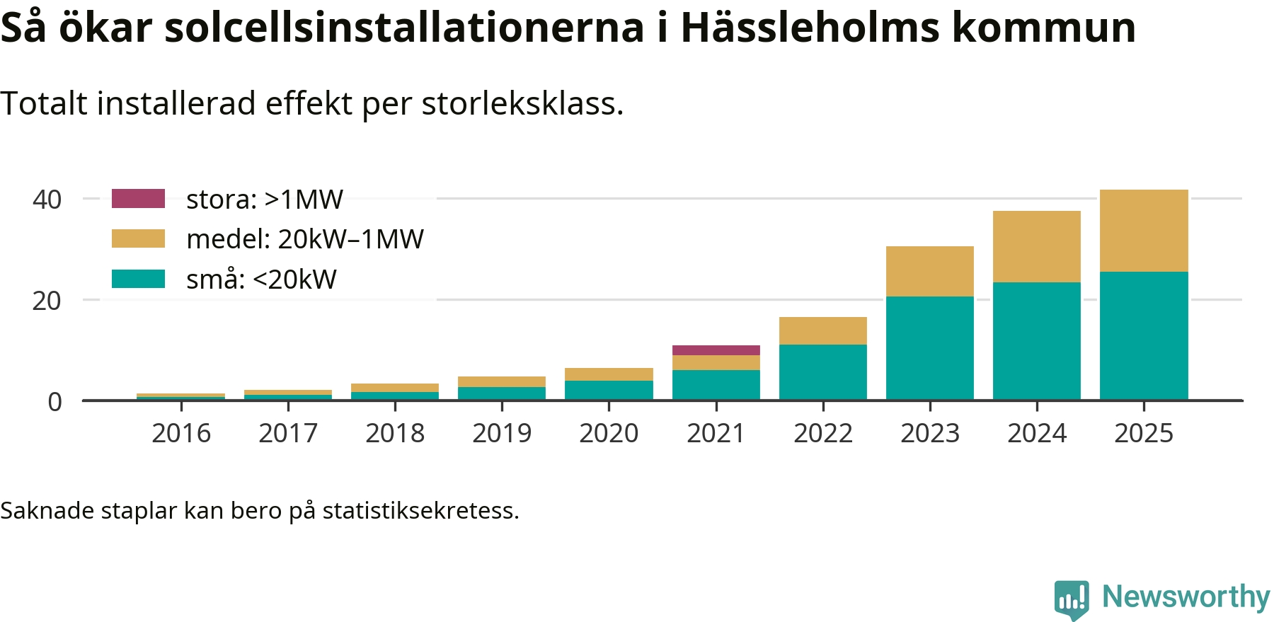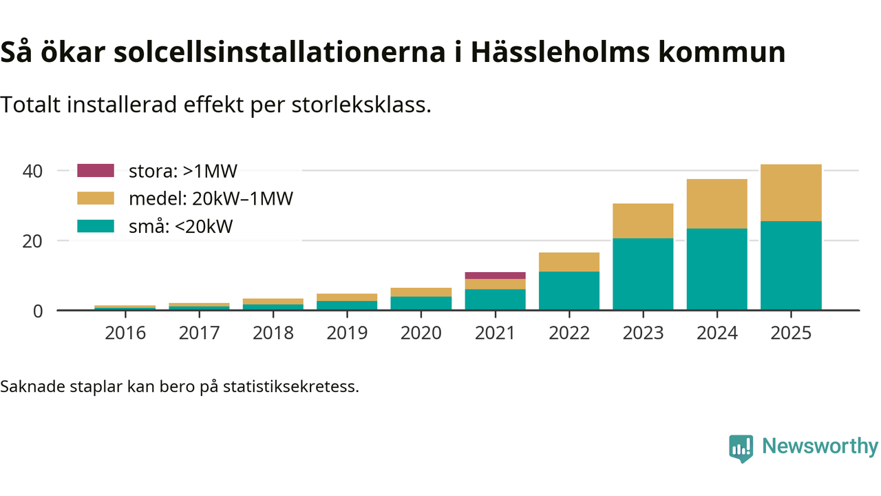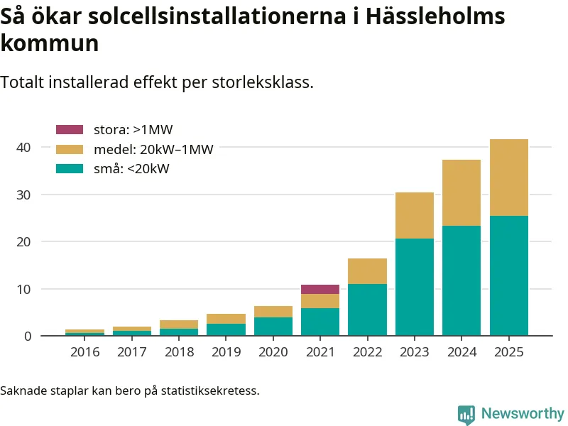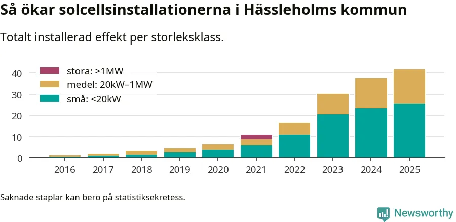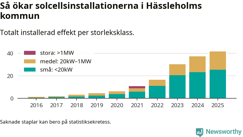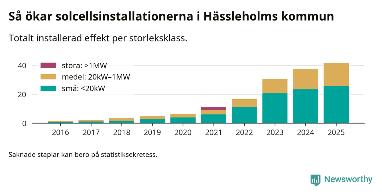 Det är framför allt de stora anläggningarna som driver tillväxten. Småskalig solel dominerar fortfarande produktionen – mer än hälften av effekten finns i anläggningar under 20 kilowatt – men det är bland de stora anläggningarna vi ser den största ökningstakten.