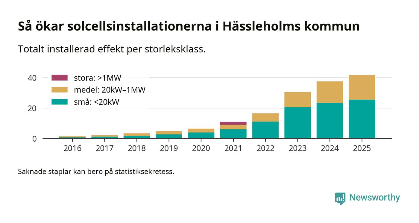 Den största delen av solelen i Hässleholm, 61 procent, kommer från småskaliga anläggningar, totalt 2 319 stycken. Det påminner om hur det ser ut i riket som helhet. I hela Sverige står anläggningar under 20 kilowatt för mer än hälften av den installerade effekten. Generellt är deras andel störst i kommuner med många villahushåll, medan större anläggningar dominerar i tätbefolkade kommuner med fler flerfamiljsbostäder – och förstås i de småkommuner som har någon av landets stora markanläggningar för solel.