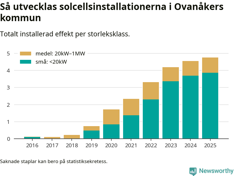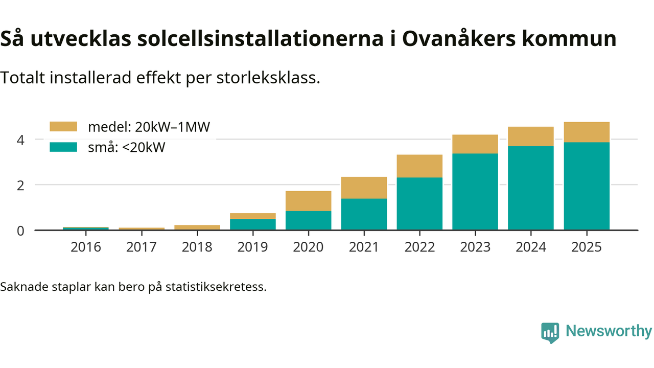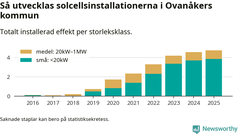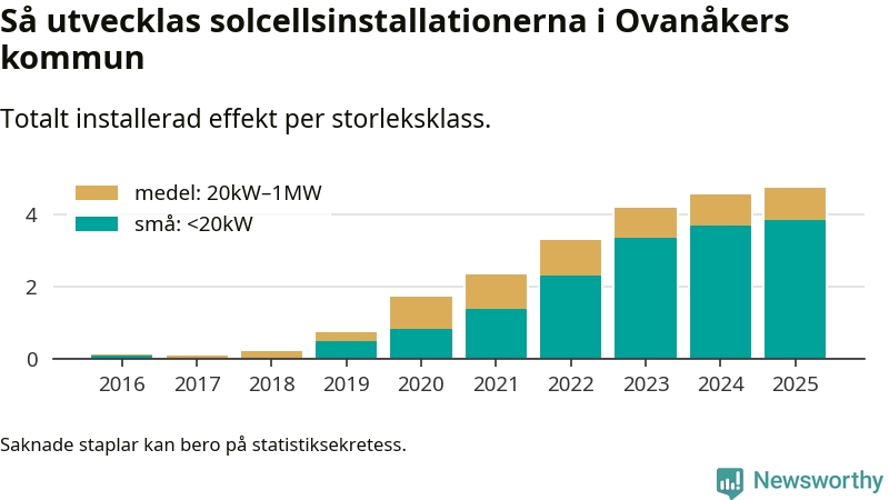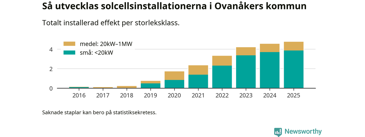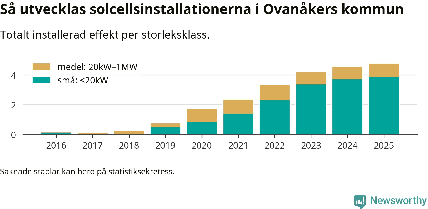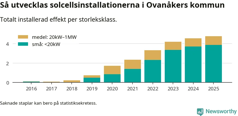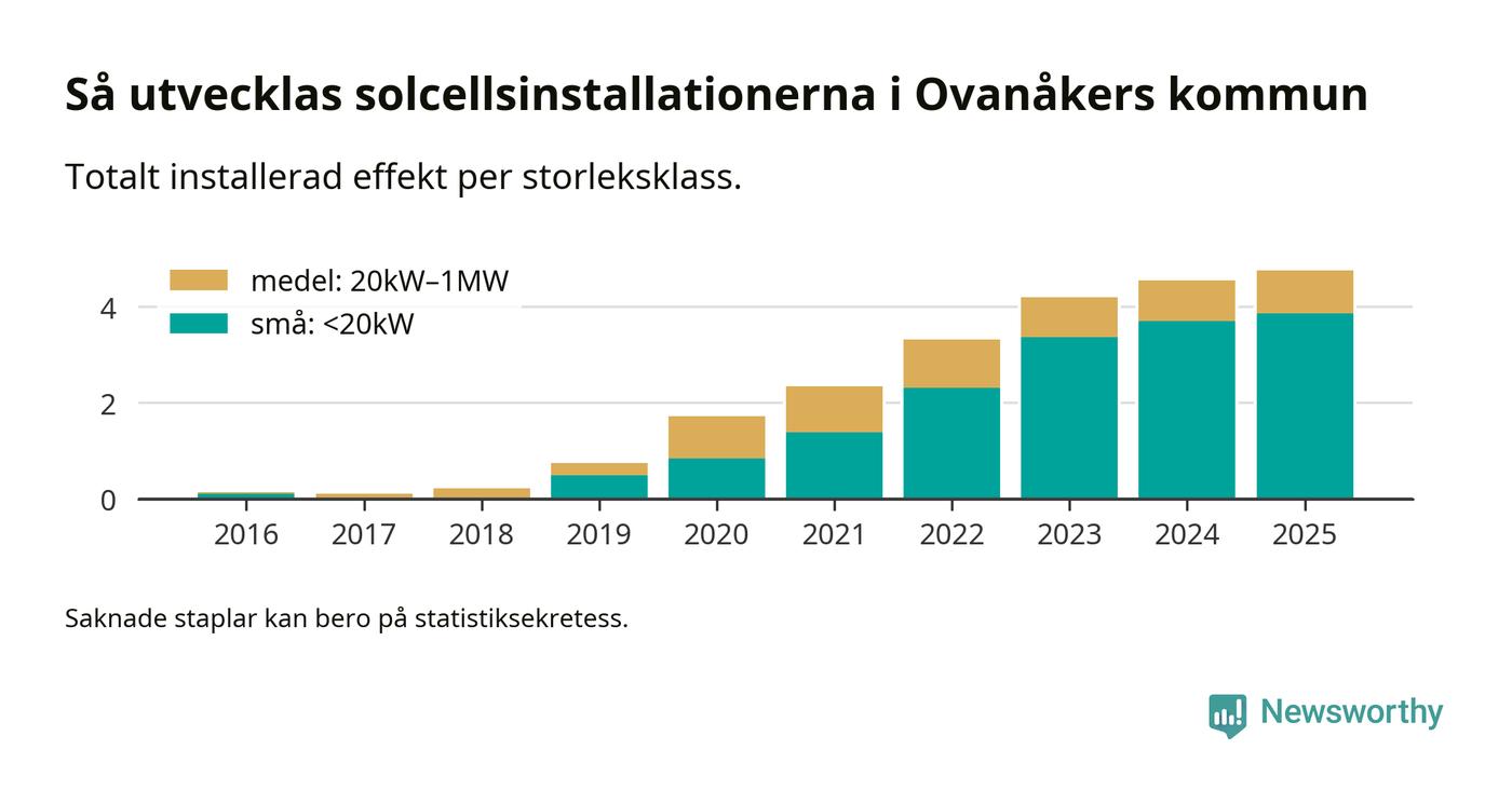 Den största delen av solelen i Ovanåker, 81 procent, kommer från småskaliga anläggningar, totalt 362 stycken. Det påminner om hur det ser ut i riket som helhet. I hela Sverige står anläggningar under 20 kilowatt för mer än hälften av den installerade effekten. Generellt är deras andel störst i kommuner med många villahushåll, medan större anläggningar dominerar i tätbefolkade kommuner med fler flerfamiljsbostäder – och förstås i de småkommuner som har någon av landets stora markanläggningar för solel.