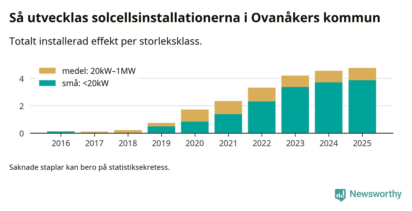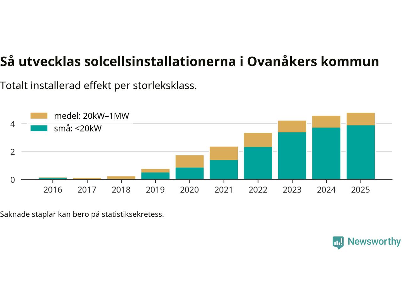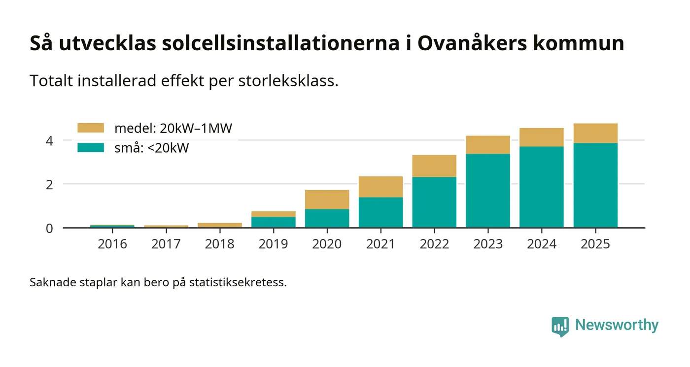 Under 2025 anslöts 200 kilowatt ny solel till elnätet i Ovanåkers kommun, en ökning med 4 procent jämfört med året innan.