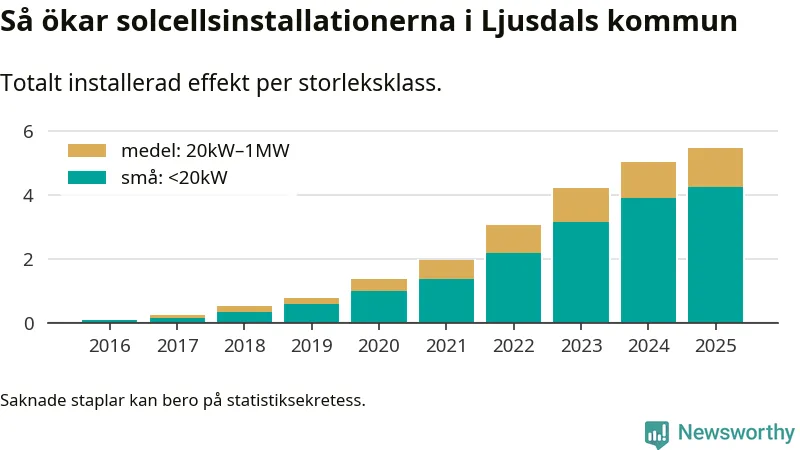 Det är framför allt de stora anläggningarna som driver tillväxten. Småskalig solel dominerar fortfarande produktionen – mer än hälften av effekten finns i anläggningar under 20 kilowatt – men det är bland de stora anläggningarna vi ser den största ökningstakten.