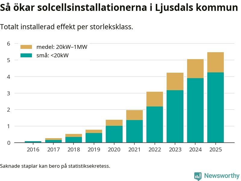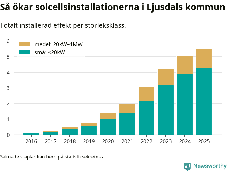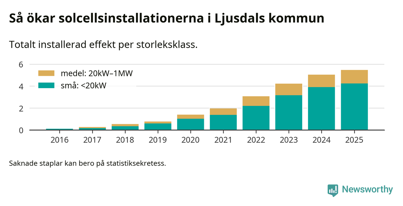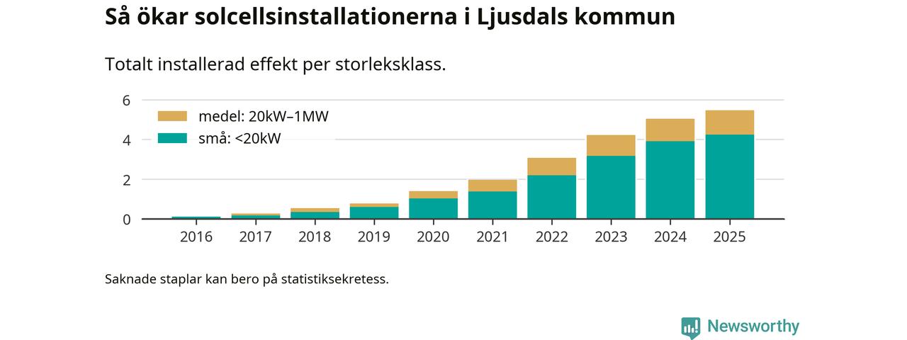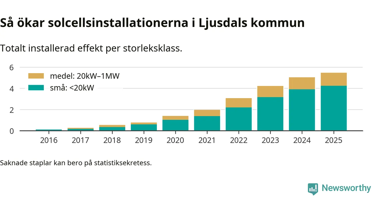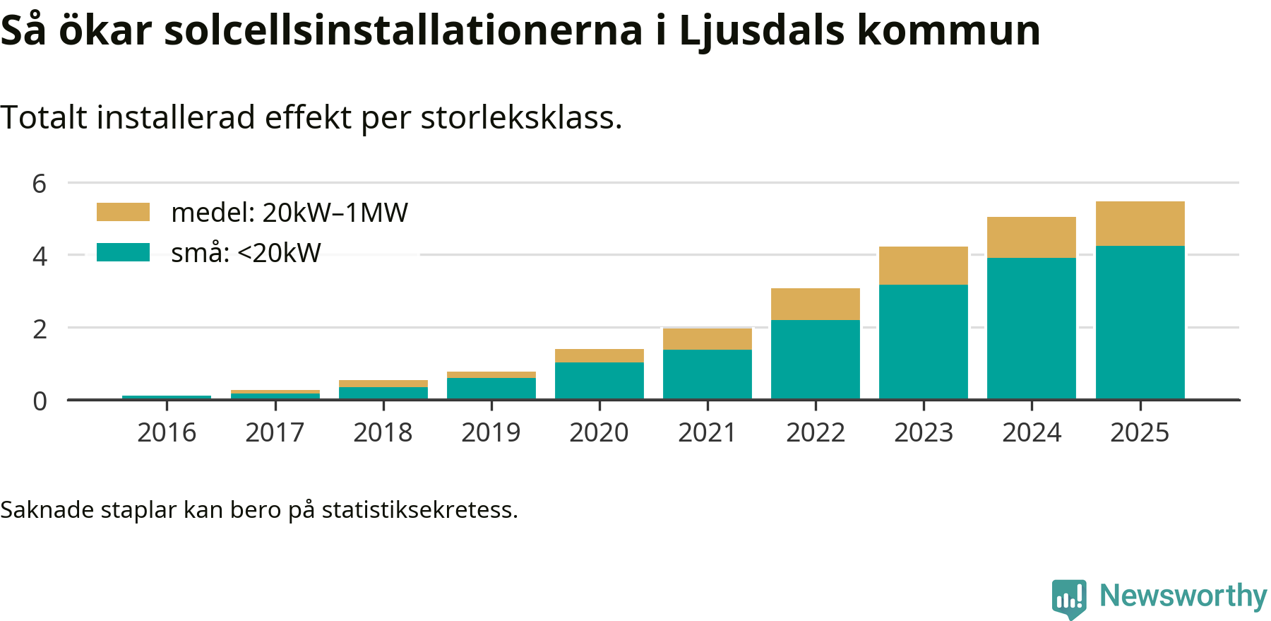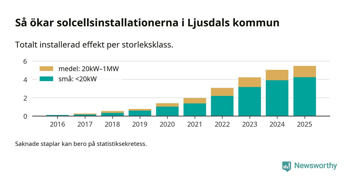 Totalt finns 451 nätanslutna anläggningar, om sammanlagt 5,5 megawatt i kommunen. Det motsvarar, i runda tal, en elproduktion på någonstans mellan fyra och fem procent av vad hushållen i Ljusdal förbrukar per år.1