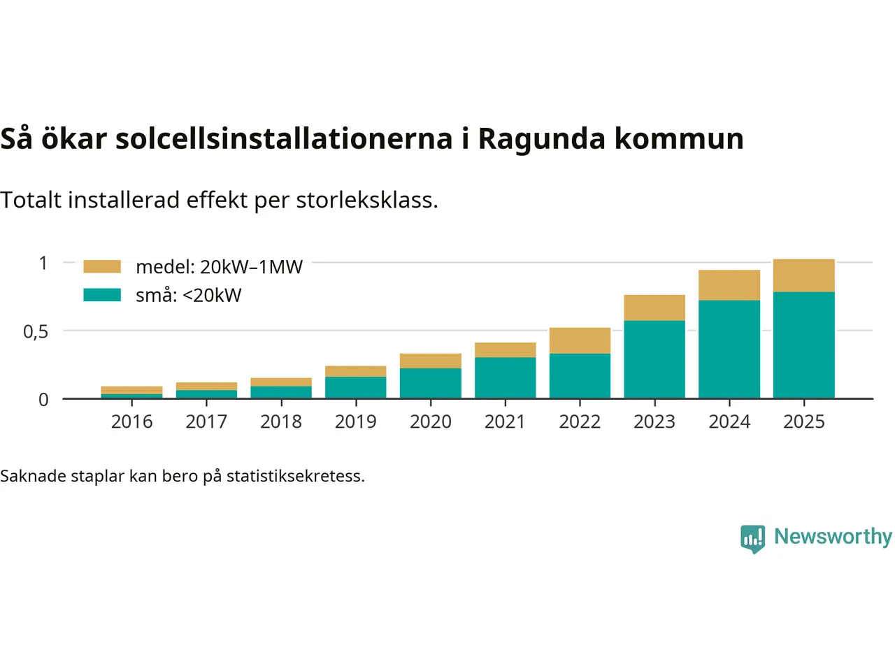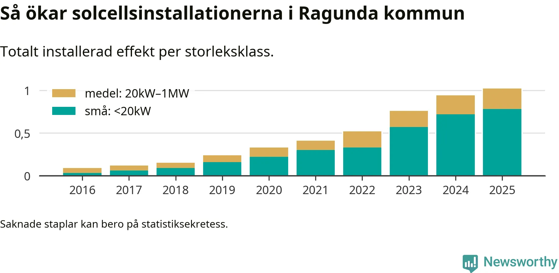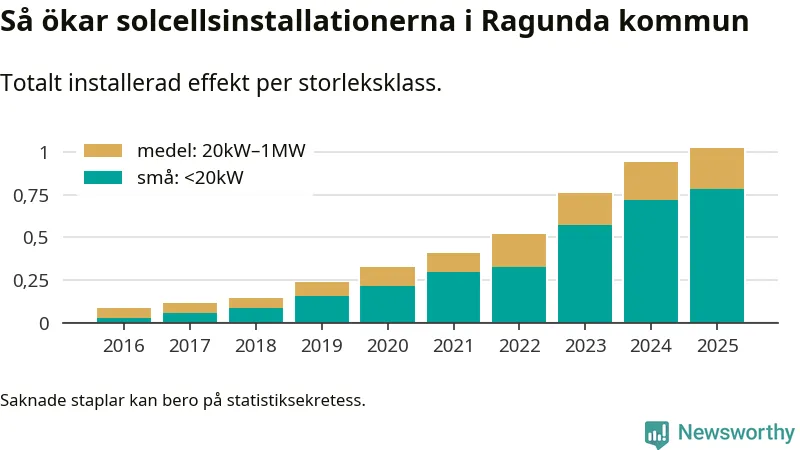 Det är framför allt de stora anläggningarna som driver tillväxten. Småskalig solel dominerar fortfarande produktionen – mer än hälften av effekten finns i anläggningar under 20 kilowatt – men det är bland de stora anläggningarna vi ser den största ökningstakten.