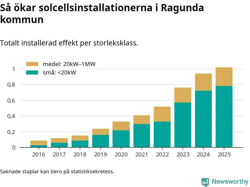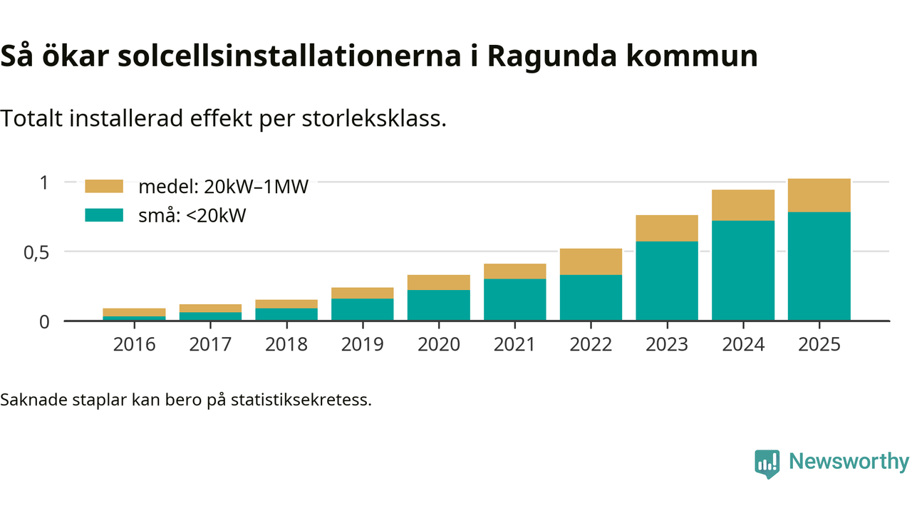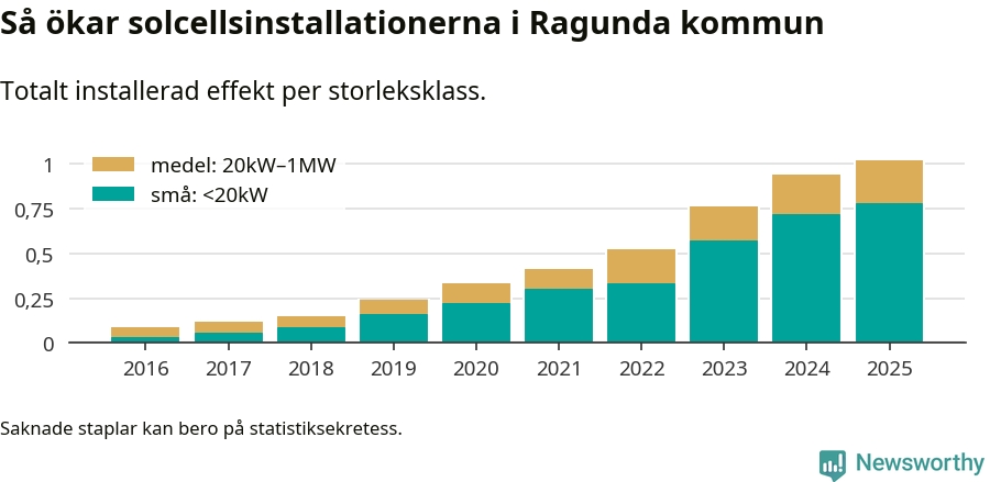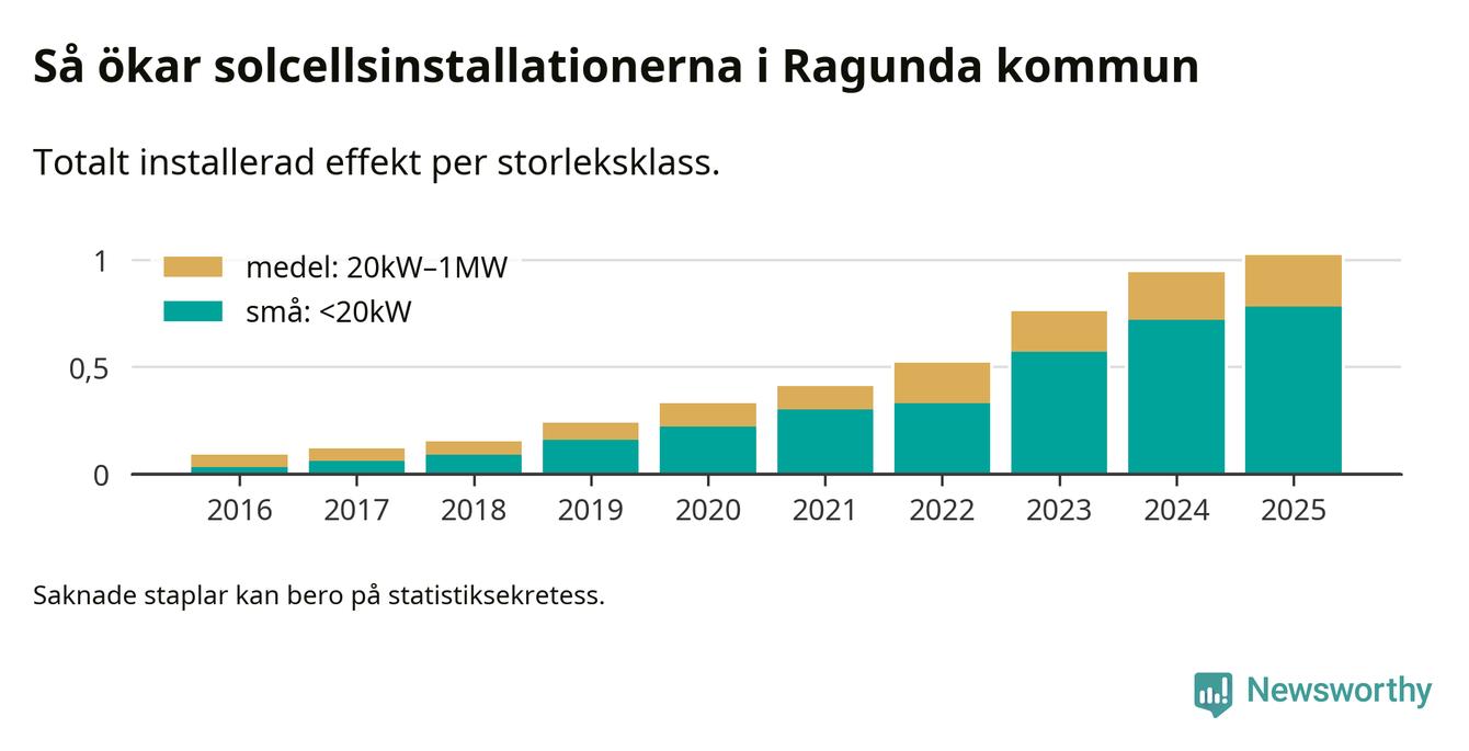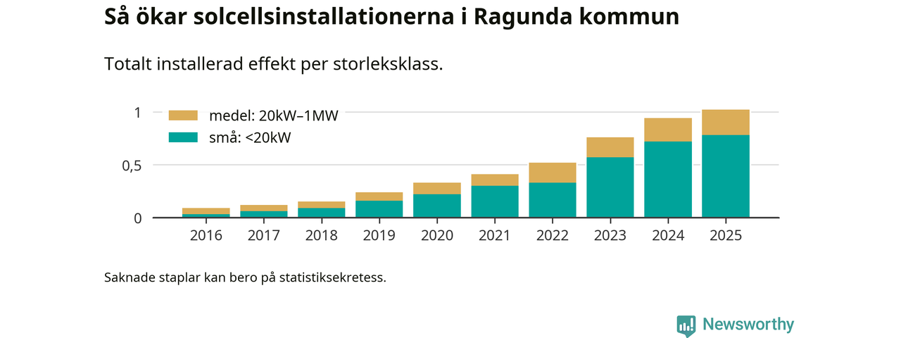 Den största delen av solelen i Ragunda, 76 procent, kommer från småskaliga anläggningar, totalt 75 stycken. Det påminner om hur det ser ut i riket som helhet. I hela Sverige står anläggningar under 20 kilowatt för mer än hälften av den installerade effekten. Generellt är deras andel störst i kommuner med många villahushåll, medan större anläggningar dominerar i tätbefolkade kommuner med fler flerfamiljsbostäder – och förstås i de småkommuner som har någon av landets stora markanläggningar för solel.
