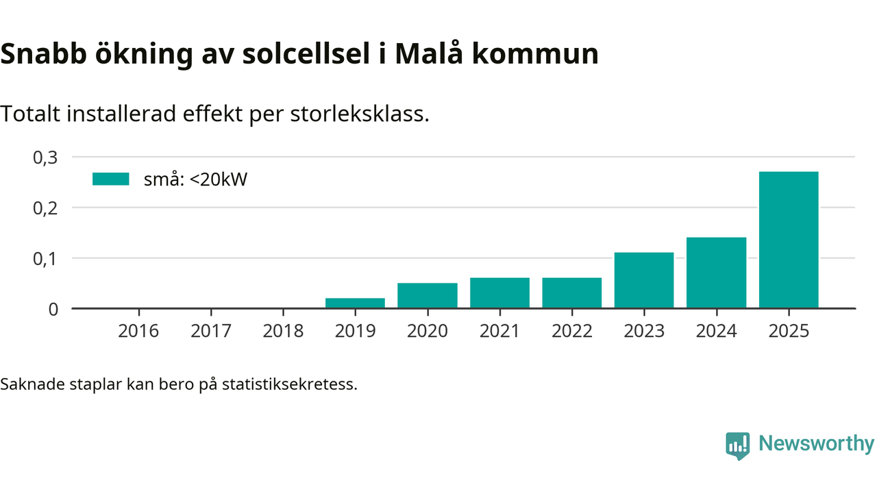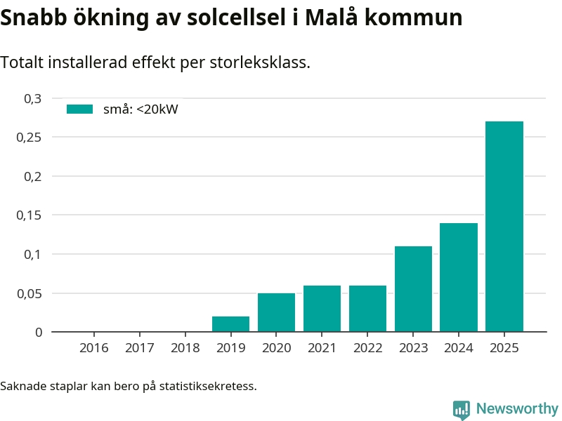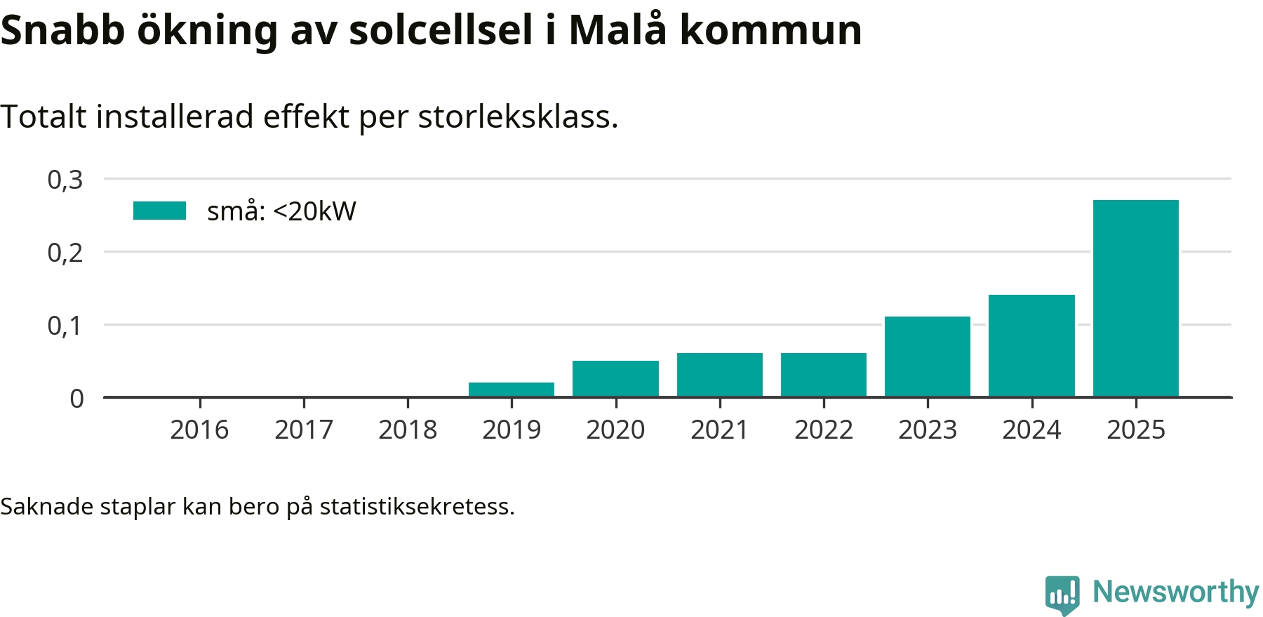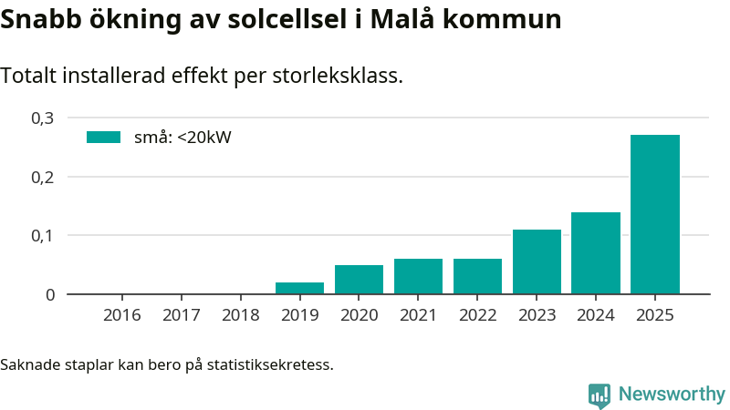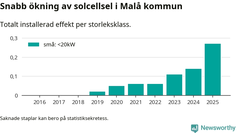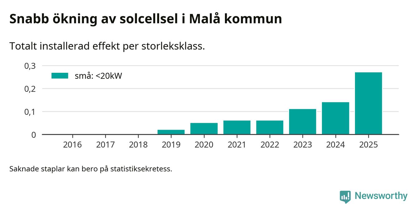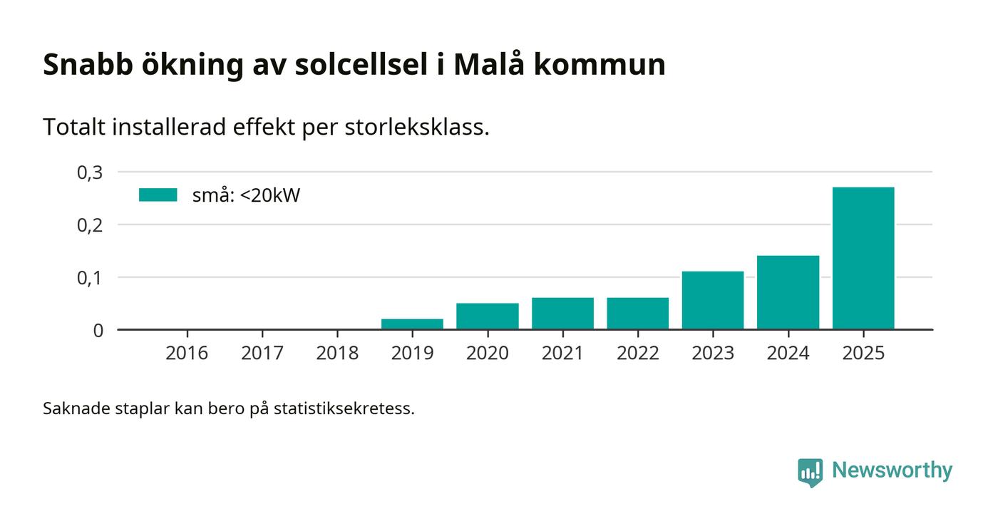 All solel i Malå kommer från småskaliga anläggningar, totalt 27 stycken. Det påminner om hur det ser ut i riket som helhet. I hela Sverige står anläggningar under 20 kilowatt för mer än hälften av den installerade effekten. Generellt är deras andel störst i kommuner med många villahushåll, medan större anläggningar dominerar i tätbefolkade kommuner med fler flerfamiljsbostäder – och förstås i de småkommuner som har någon av landets stora markanläggningar för solel.