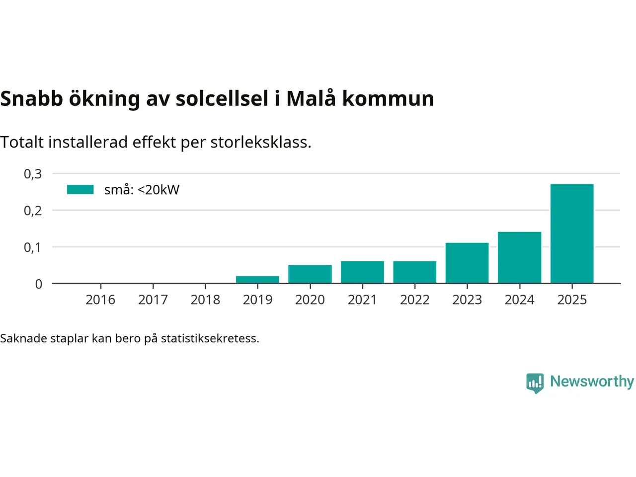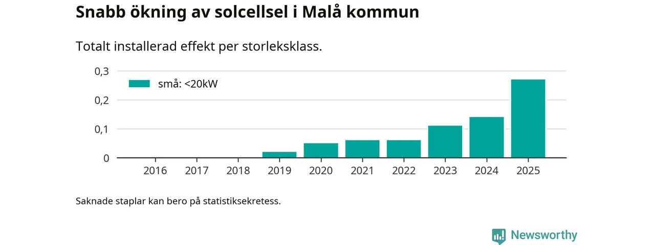 Under 2025 anslöts 130 kilowatt ny solel till elnätet i Malå kommun, en ökning med 93 procent jämfört med året innan.