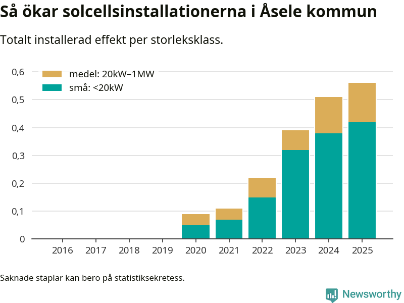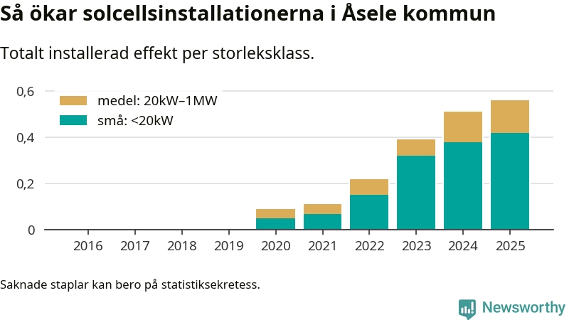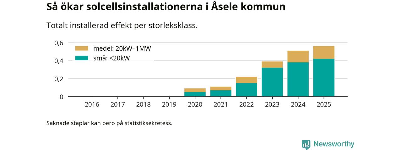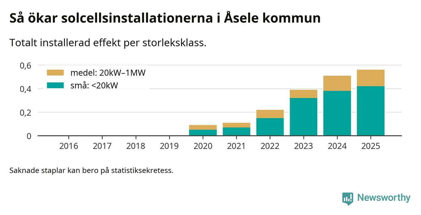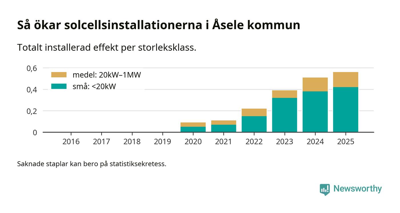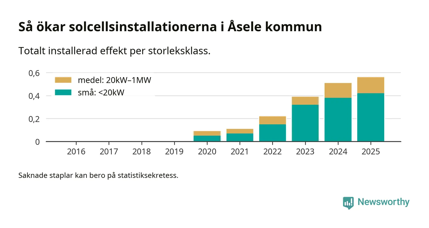 Den största delen av solelen i Åsele, 75 procent, kommer från småskaliga anläggningar, totalt 38 stycken. Det påminner om hur det ser ut i riket som helhet. I hela Sverige står anläggningar under 20 kilowatt för mer än hälften av den installerade effekten. Generellt är deras andel störst i kommuner med många villahushåll, medan större anläggningar dominerar i tätbefolkade kommuner med fler flerfamiljsbostäder – och förstås i de småkommuner som har någon av landets stora markanläggningar för solel.
