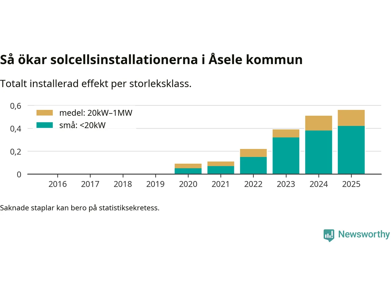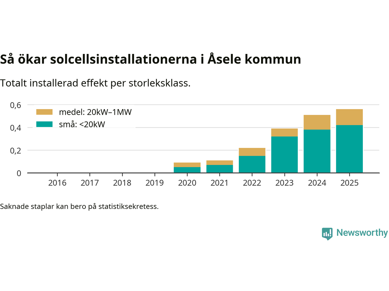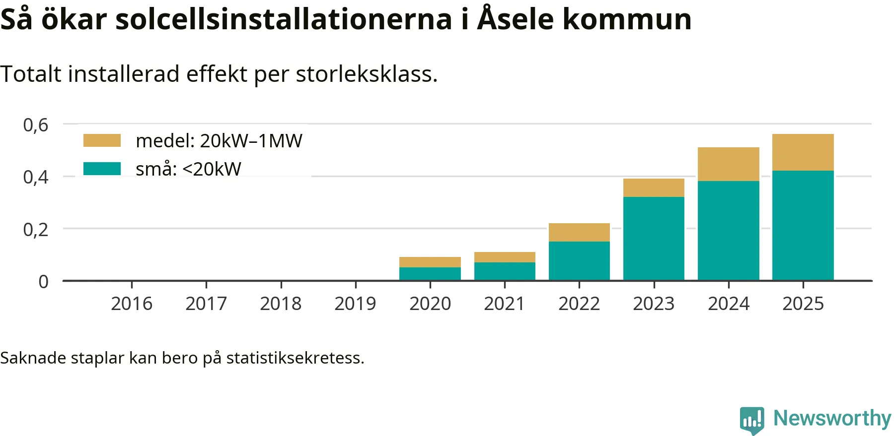Det är framför allt de stora anläggningarna som driver tillväxten. Småskalig solel dominerar fortfarande produktionen – mer än hälften av effekten finns i anläggningar under 20 kilowatt – men det är bland de stora anläggningarna vi ser den största ökningstakten.