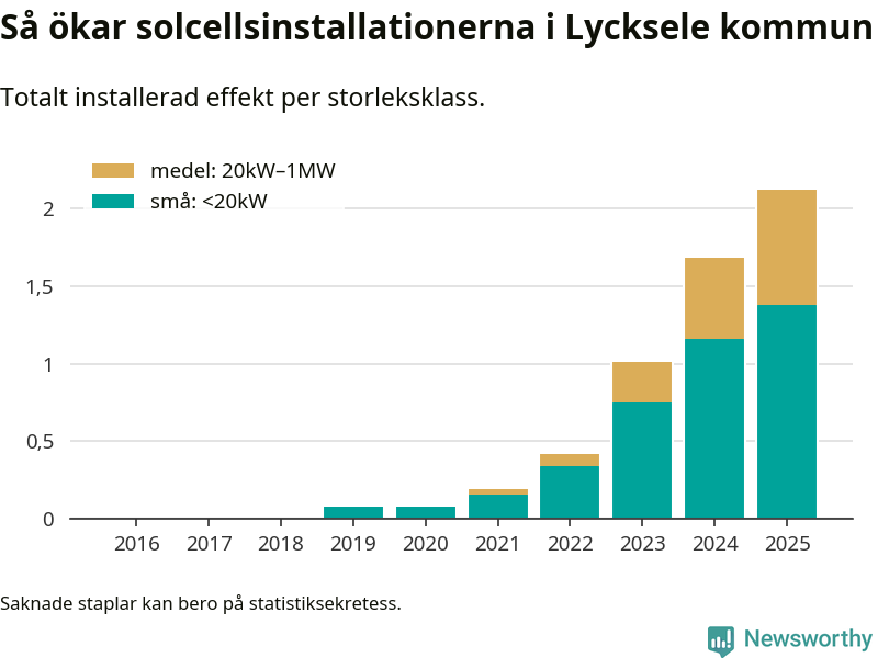 Den största delen av solelen i Lycksele, 65 procent, kommer från småskaliga anläggningar, totalt 128 stycken. Det påminner om hur det ser ut i riket som helhet. I hela Sverige står anläggningar under 20 kilowatt för mer än hälften av den installerade effekten. Generellt är deras andel störst i kommuner med många villahushåll, medan större anläggningar dominerar i tätbefolkade kommuner med fler flerfamiljsbostäder – och förstås i de småkommuner som har någon av landets stora markanläggningar för solel.