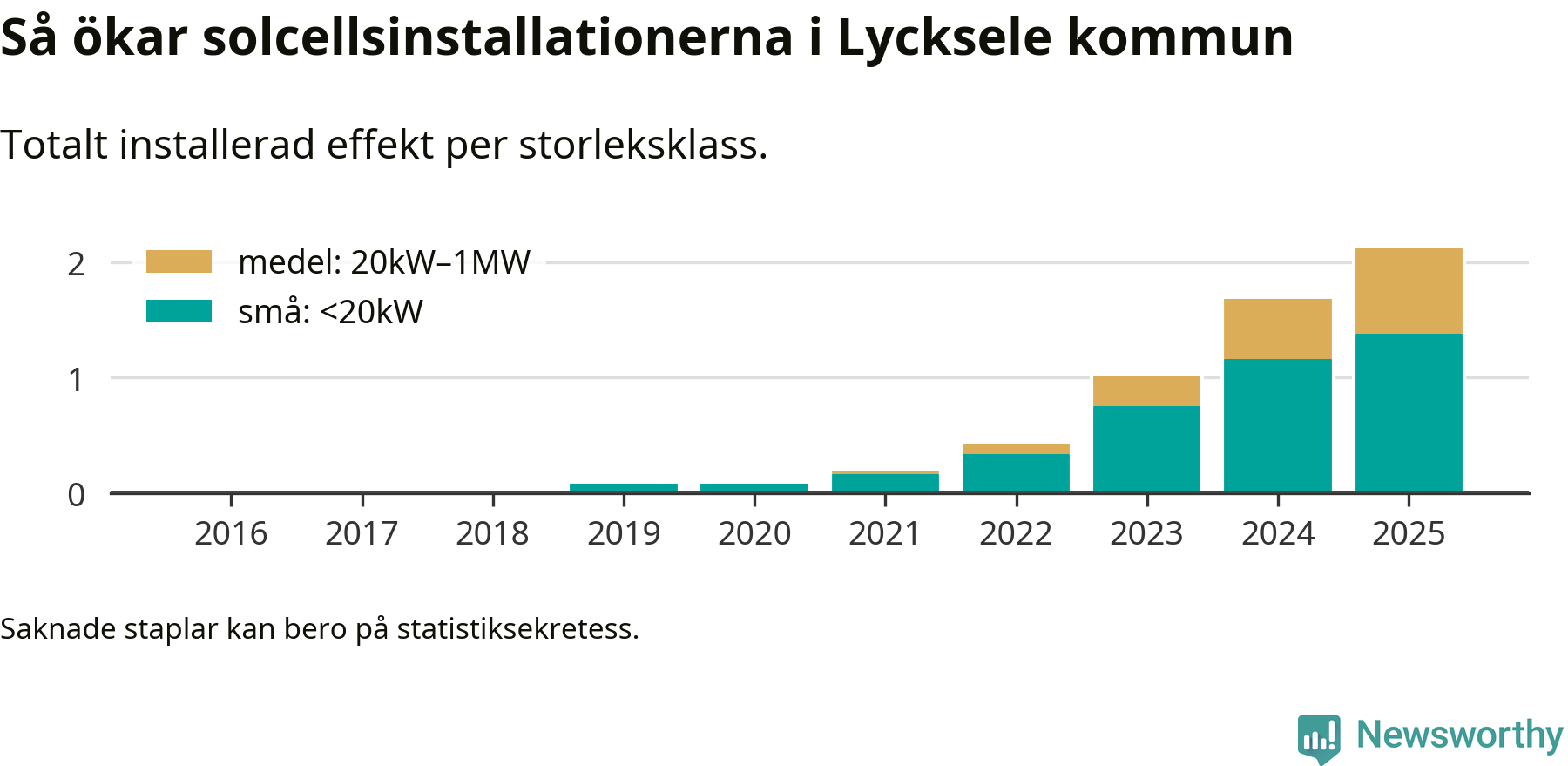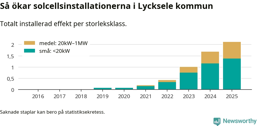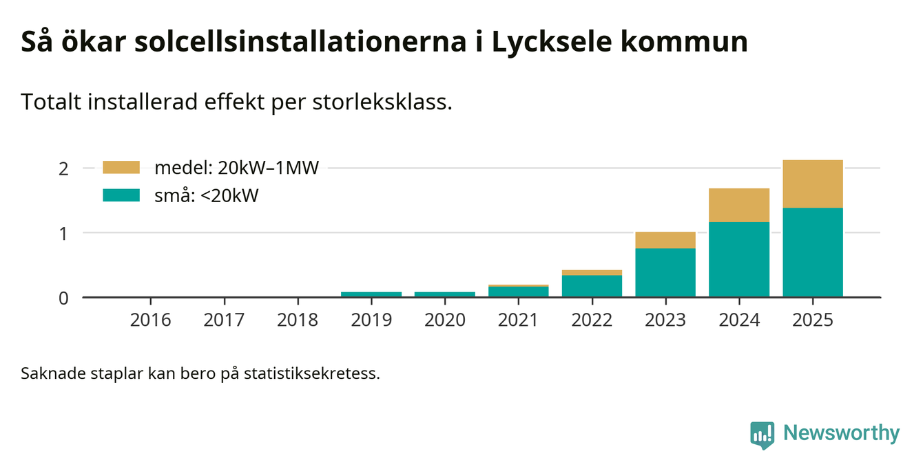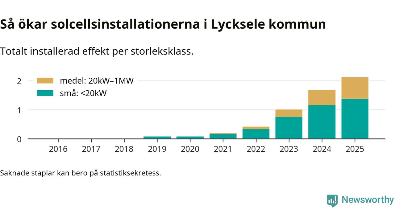 Totalt finns 140 nätanslutna anläggningar, om sammanlagt 2,1 megawatt i kommunen. Det motsvarar, i runda tal, en elproduktion på någonstans mellan två och tre procent av vad hushållen i Lycksele förbrukar per år.1