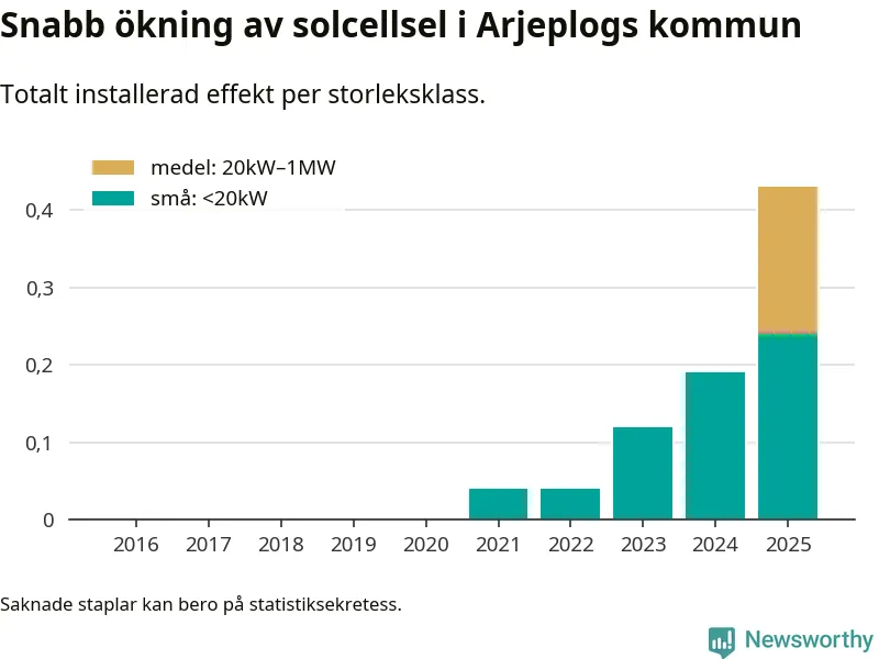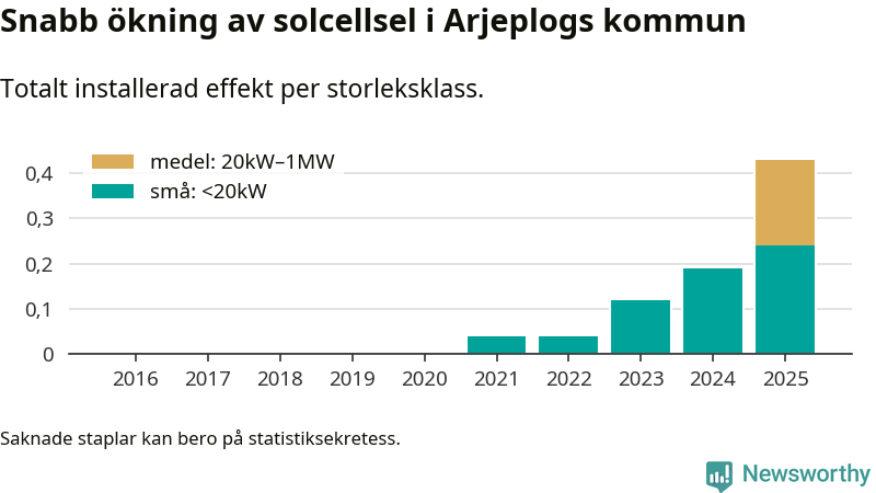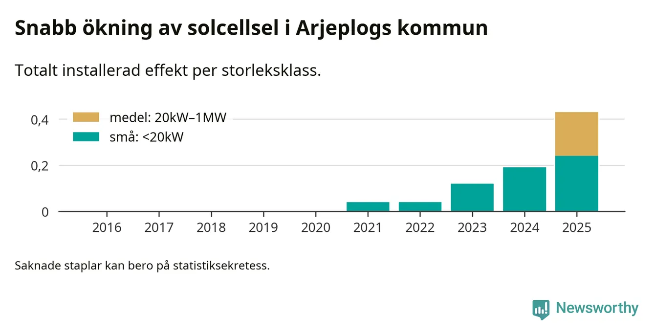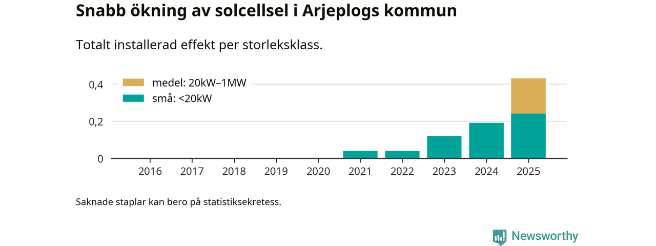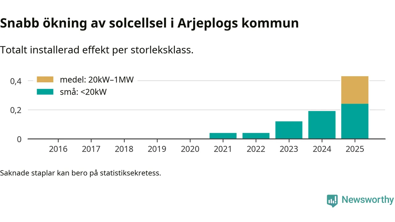 Under 2025 anslöts 240 kilowatt ny solel till elnätet i Arjeplogs kommun, vilket innebar mer än en fördubbling jämfört med året innan.