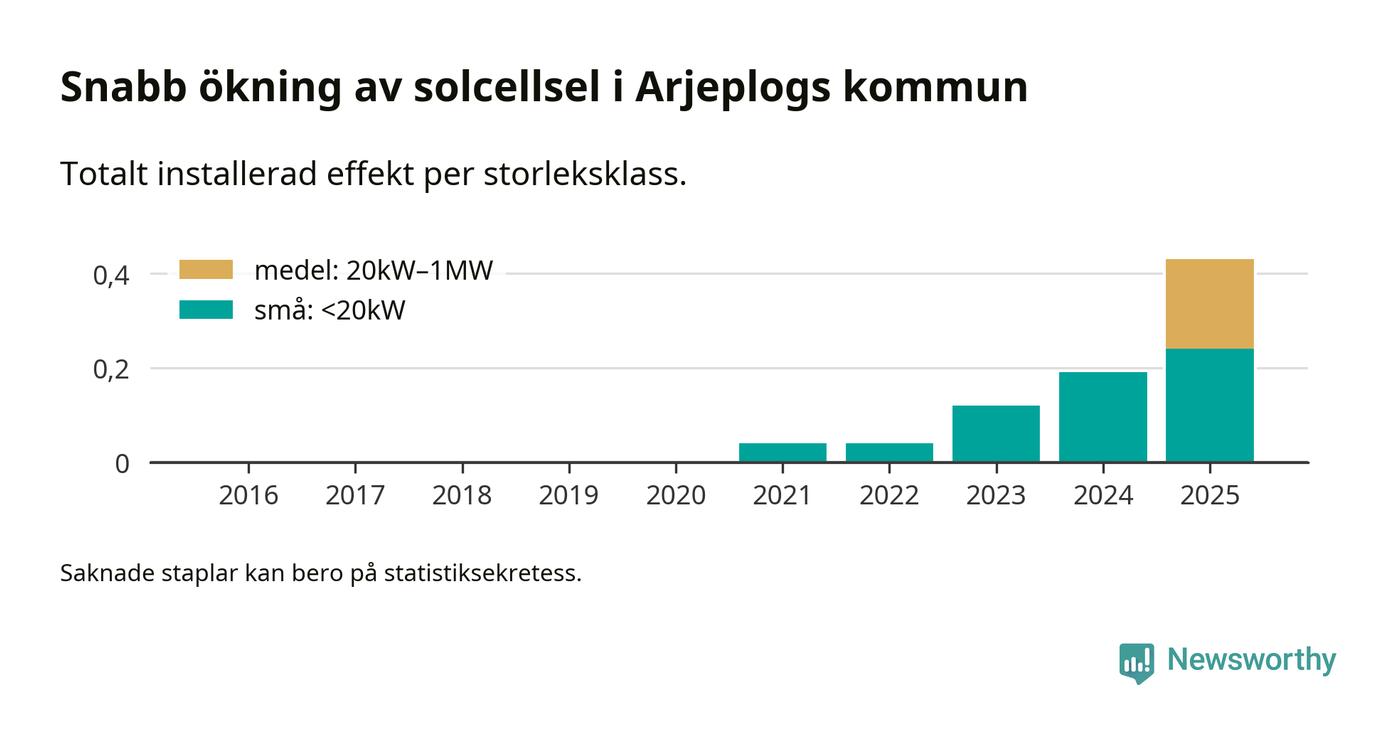 Den största delen av solelen i Arjeplog, 56 procent, kommer från småskaliga anläggningar, totalt 26 stycken. Det påminner om hur det ser ut i riket som helhet. I hela Sverige står anläggningar under 20 kilowatt för mer än hälften av den installerade effekten. Generellt är deras andel störst i kommuner med många villahushåll, medan större anläggningar dominerar i tätbefolkade kommuner med fler flerfamiljsbostäder – och förstås i de småkommuner som har någon av landets stora markanläggningar för solel.