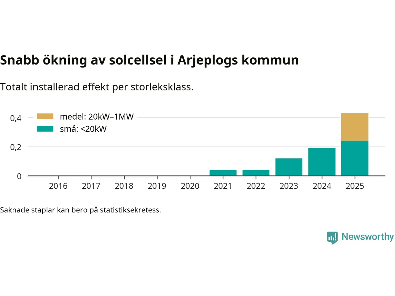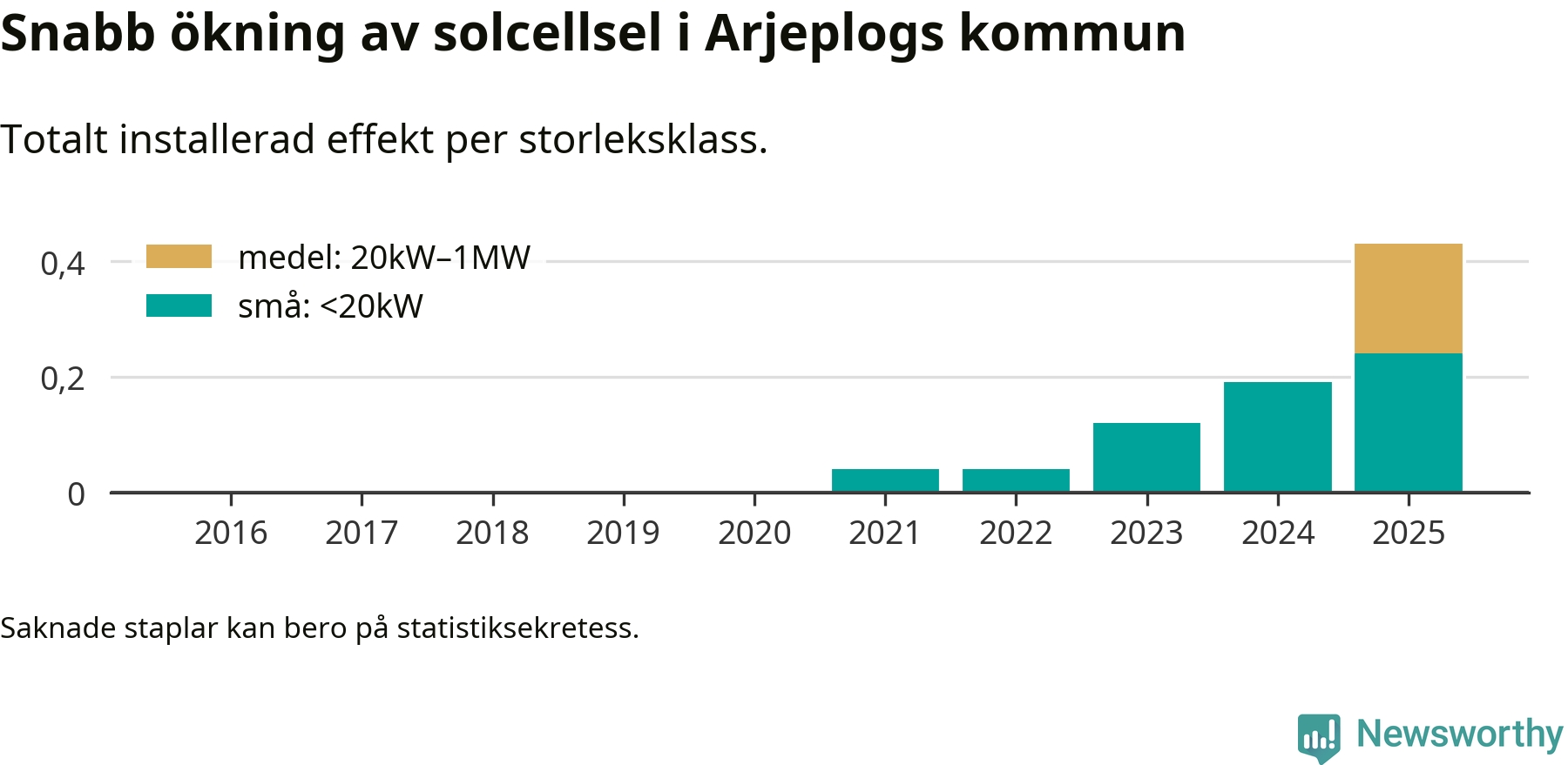 Det är framför allt de stora anläggningarna som driver tillväxten. Småskalig solel dominerar fortfarande produktionen – mer än hälften av effekten finns i anläggningar under 20 kilowatt – men det är bland de stora anläggningarna vi ser den största ökningstakten.