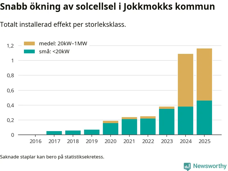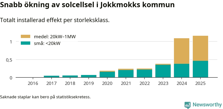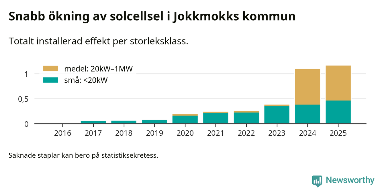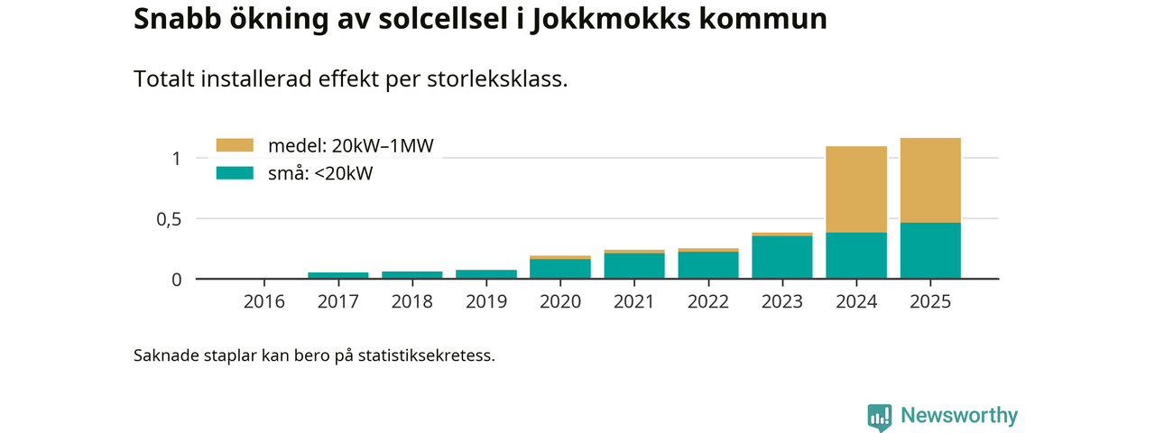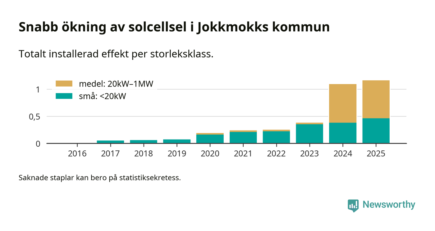 Den största delen av solelen i Jokkmokk, 60 procent, kommer från medelstora anläggningar, totalt fem stycken. Det skiljer Jokkmokk från de flesta andra delar av landet, där de småskaliga installationerna dominerar. I hela Sverige står anläggningar under 20 kilowatt för mer än hälften av den installerade effekten. Generellt är deras andel störst i kommuner med många villahushåll, medan större anläggningar dominerar i tätbefolkade kommuner med fler flerfamiljsbostäder – och förstås i de småkommuner som har någon av landets stora markanläggningar för solel.