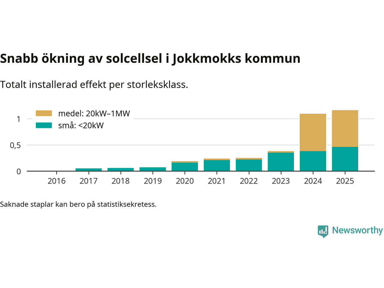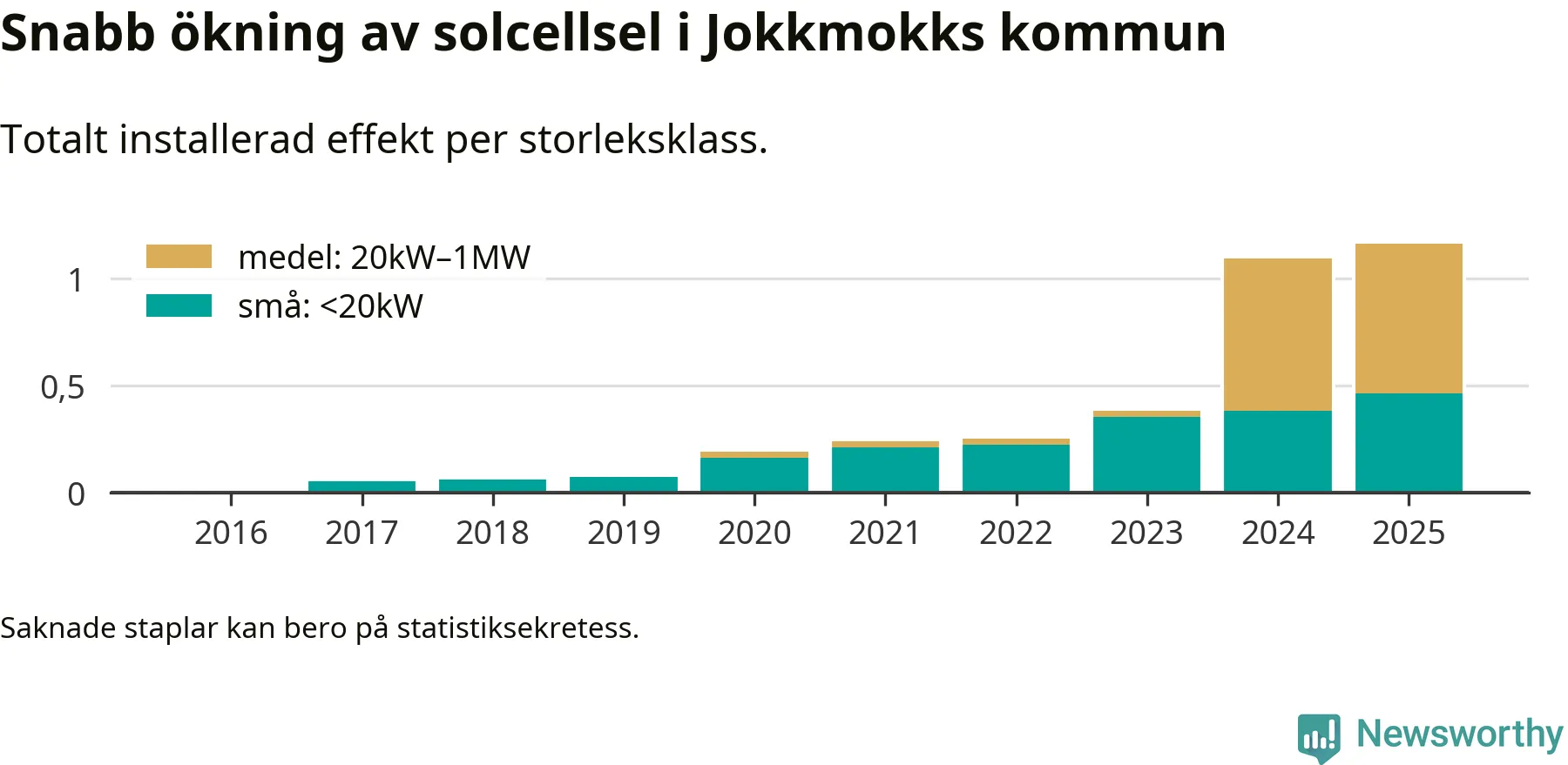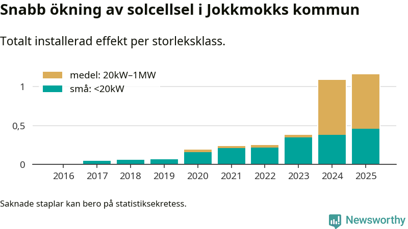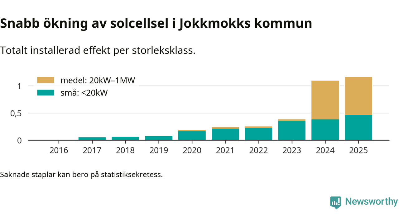 Den största delen av solelen i Jokkmokk, 60 procent, kommer från medelstora anläggningar, totalt fem stycken. Det skiljer Jokkmokk från de flesta andra delar av landet, där de småskaliga installationerna dominerar. I hela Sverige står anläggningar under 20 kilowatt för mer än hälften av den installerade effekten. Generellt är deras andel störst i kommuner med många villahushåll, medan större anläggningar dominerar i tätbefolkade kommuner med fler flerfamiljsbostäder – och förstås i de småkommuner som har någon av landets stora markanläggningar för solel.