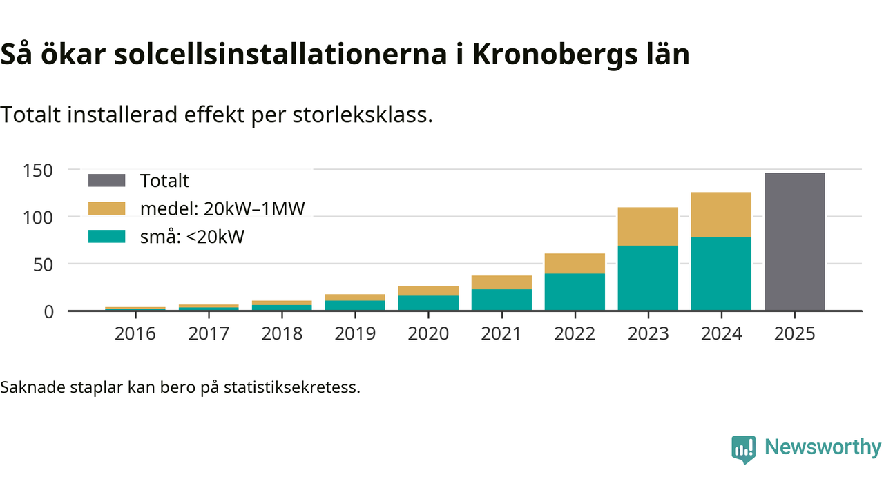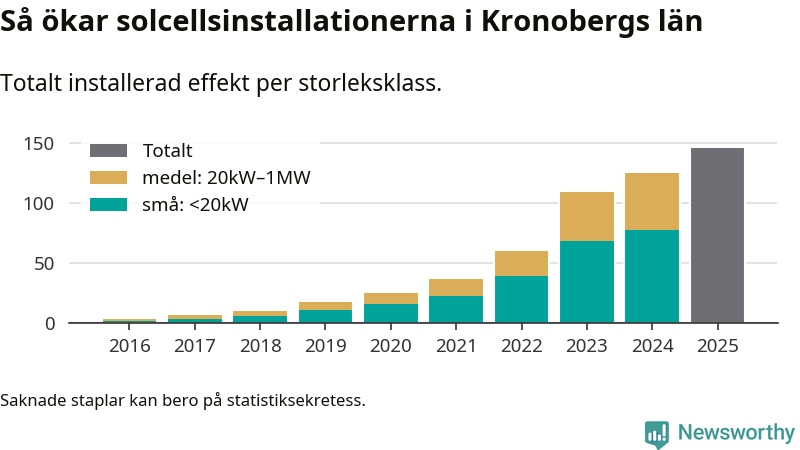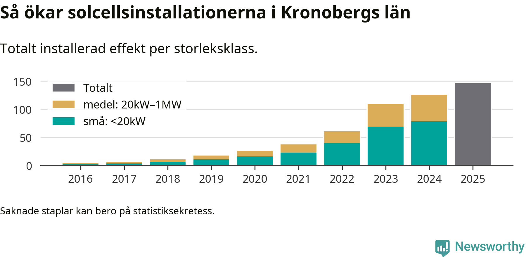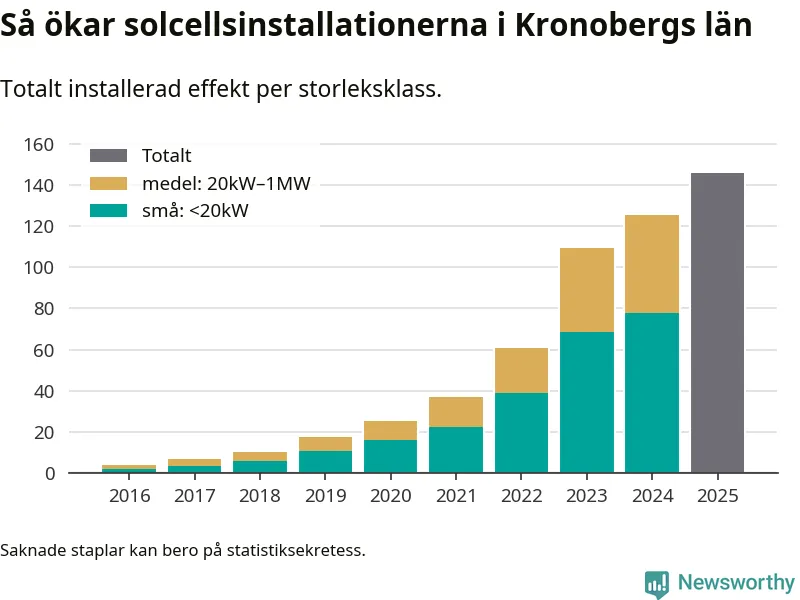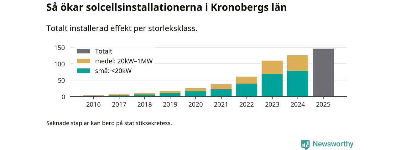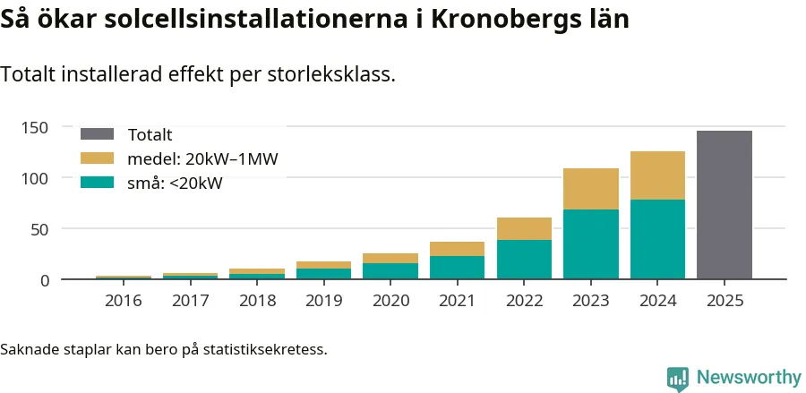 Det är framför allt de stora anläggningarna som driver tillväxten. Småskalig solel dominerar fortfarande produktionen – mer än hälften av effekten finns i anläggningar under 20 kilowatt – men det är bland de stora anläggningarna vi ser den största ökningstakten.