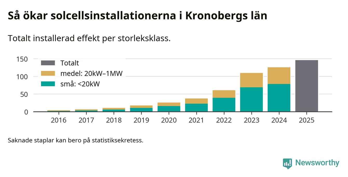 Under 2025 anslöts 20,5 megawatt ny solel till elnätet i Kronobergs län, en ökning med 16 procent jämfört med året innan.