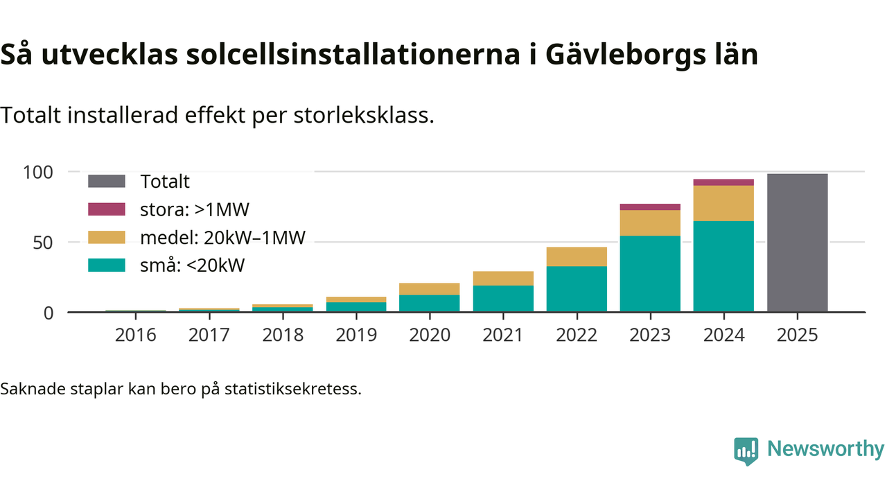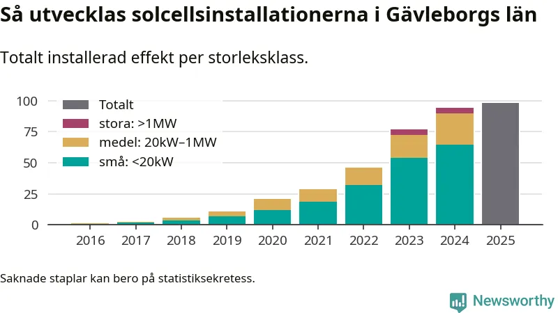 Det är framför allt de stora anläggningarna som driver tillväxten. Småskalig solel dominerar fortfarande produktionen – mer än hälften av effekten finns i anläggningar under 20 kilowatt – men det är bland de stora anläggningarna vi ser den största ökningstakten.