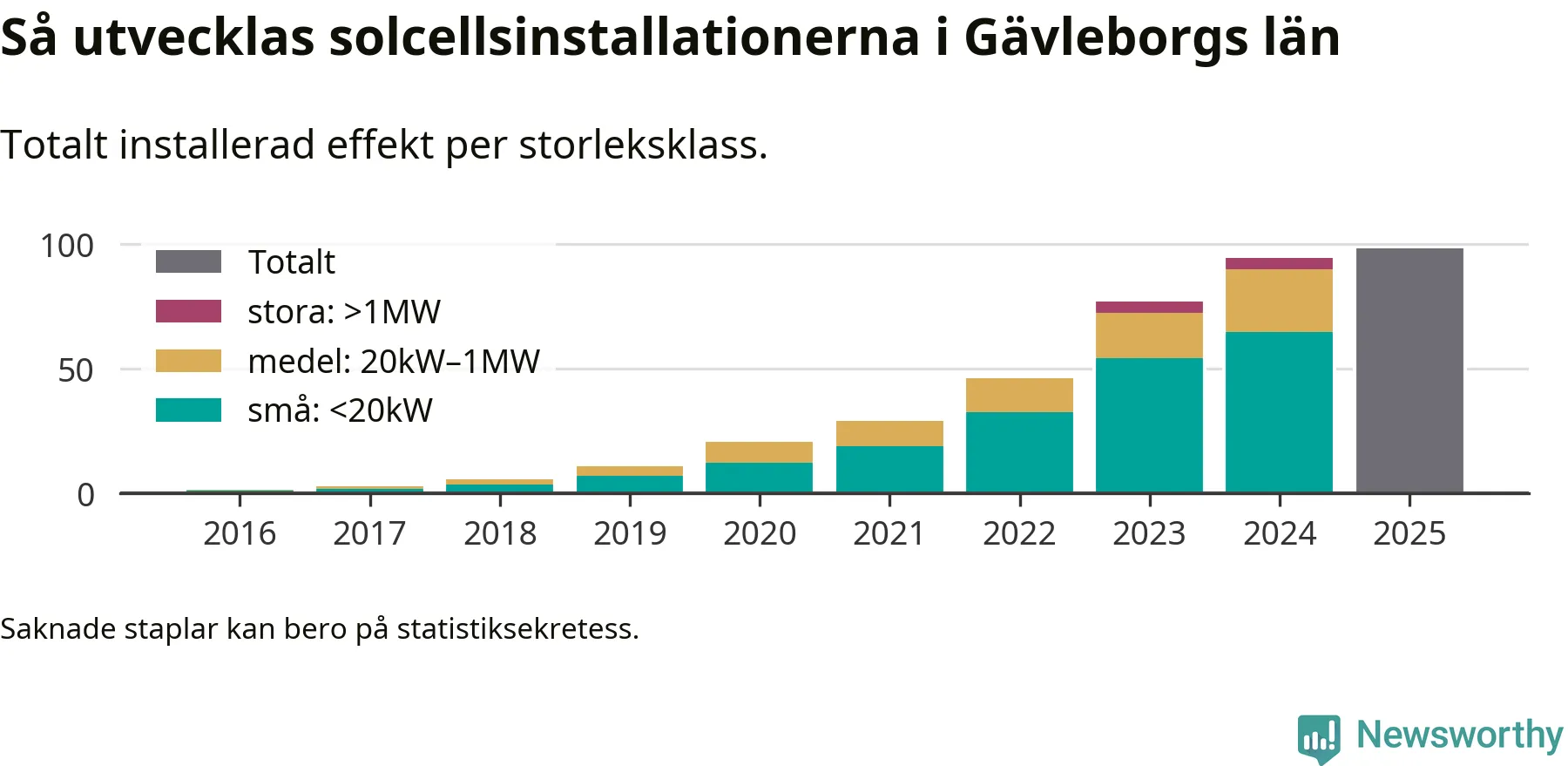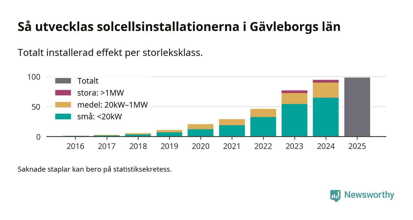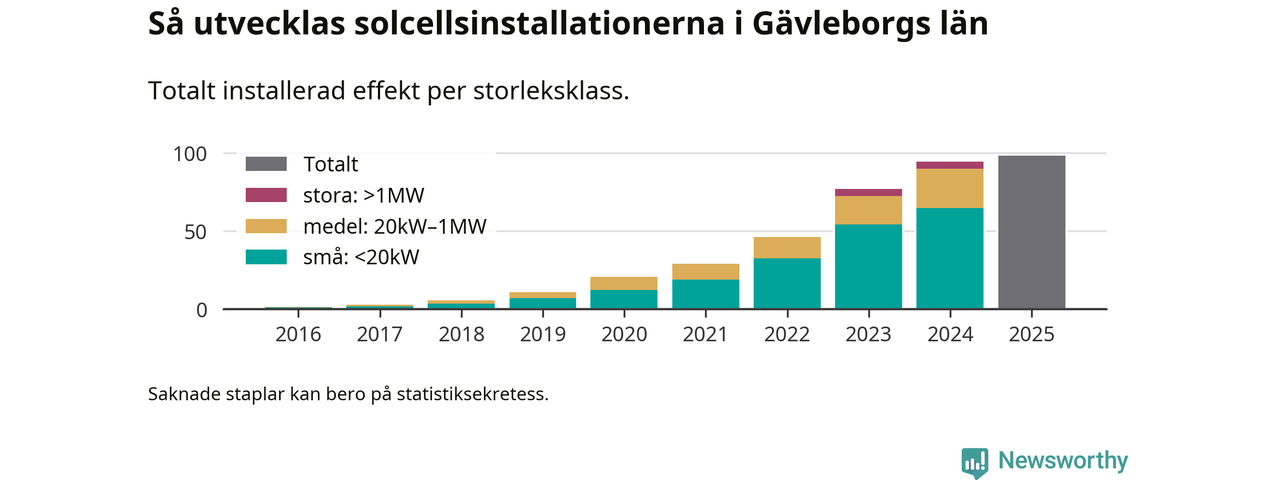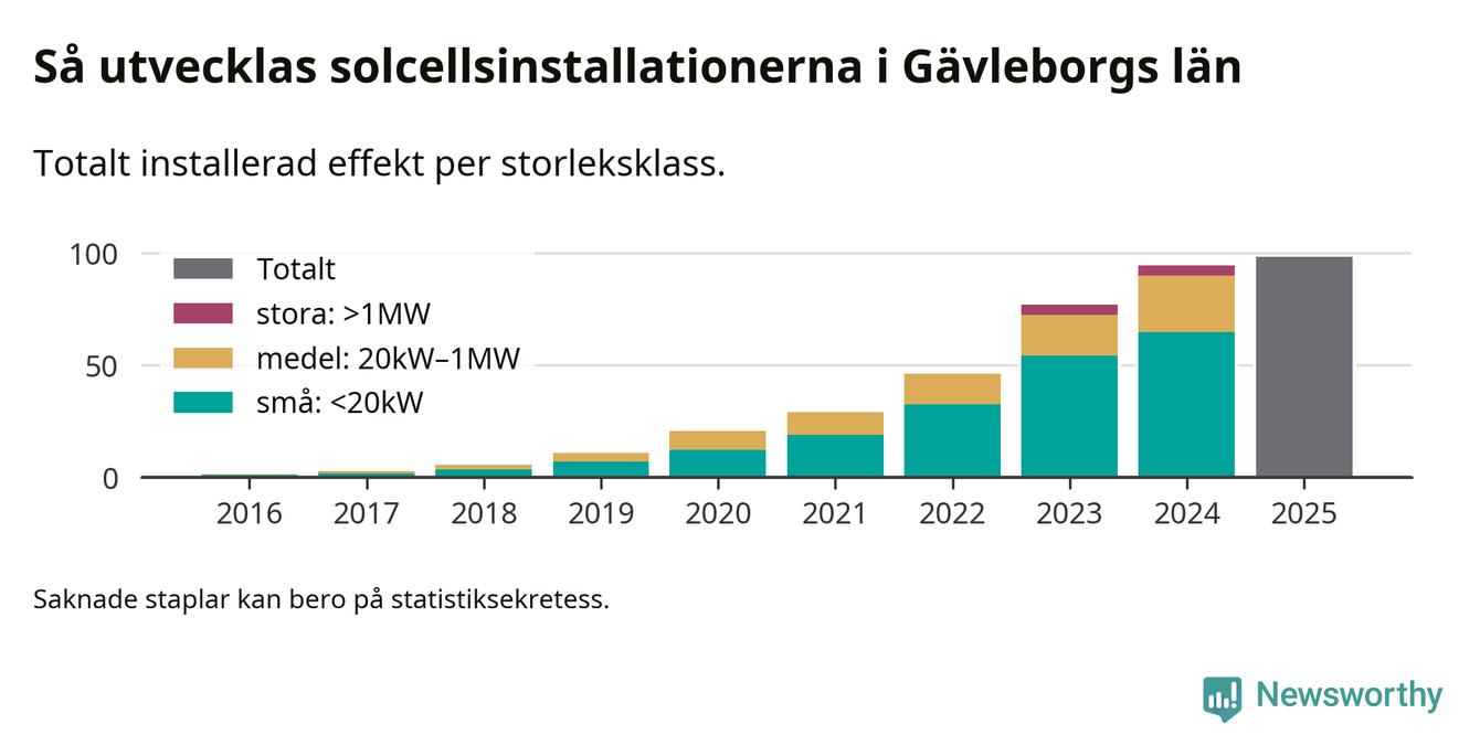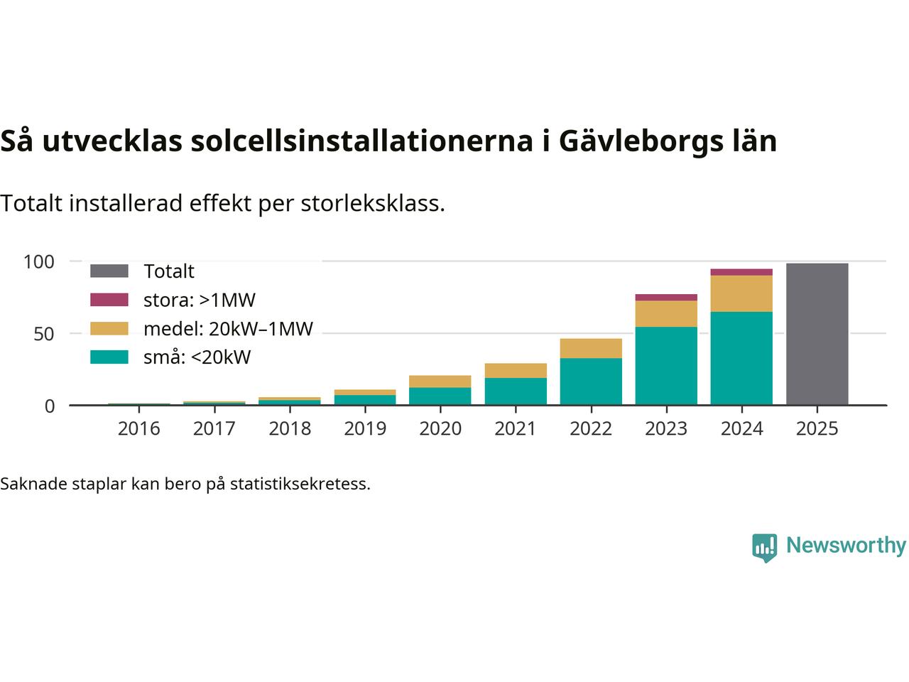 Totalt finns 7 095 nätanslutna anläggningar, om sammanlagt 98,1 megawatt i länet. Det motsvarar, i runda tal, en elproduktion på någonstans mellan sju och åtta procent av vad hushållen i Gävleborg förbrukar per år.1
