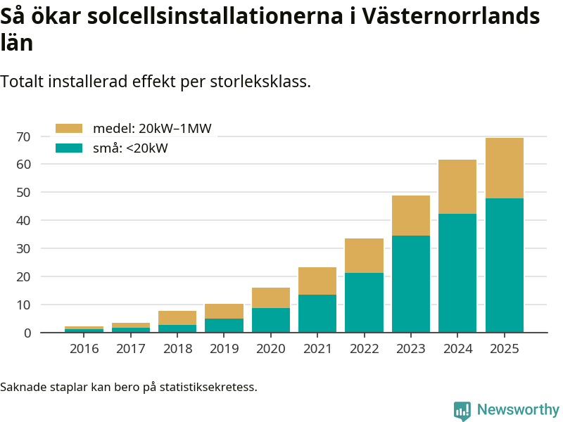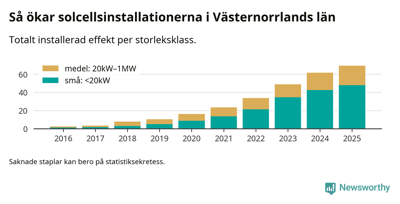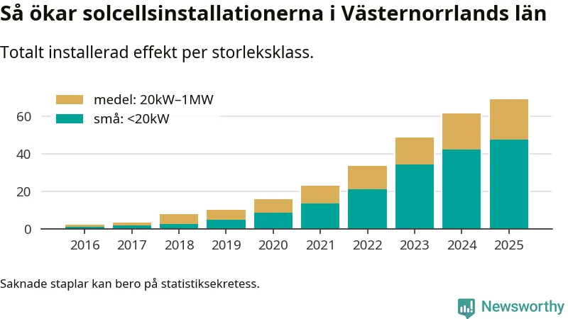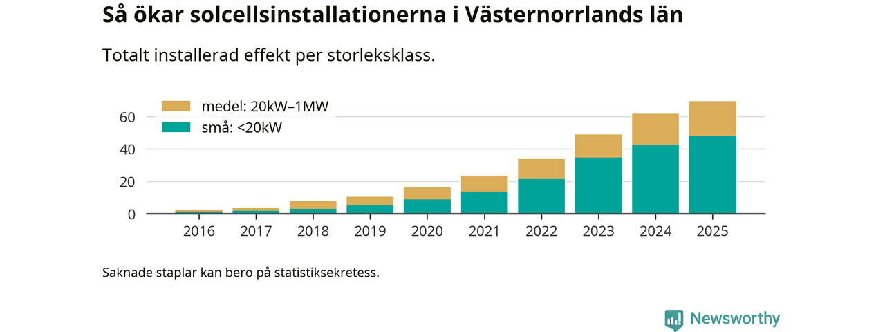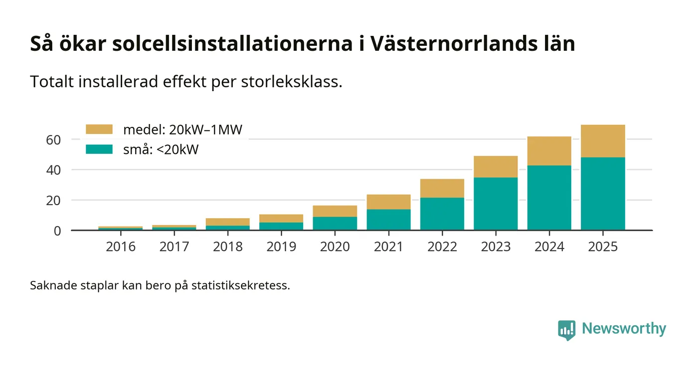 Den största delen av solelen i Västernorrland, 69 procent, kommer från småskaliga anläggningar, totalt 4 477 stycken. Det påminner om hur det ser ut i riket som helhet. I hela Sverige står anläggningar under 20 kilowatt för mer än hälften av den installerade effekten. Generellt är deras andel störst i kommuner med många villahushåll, medan större anläggningar dominerar i tätbefolkade kommuner med fler flerfamiljsbostäder – och förstås i de småkommuner som har någon av landets stora markanläggningar för solel.
