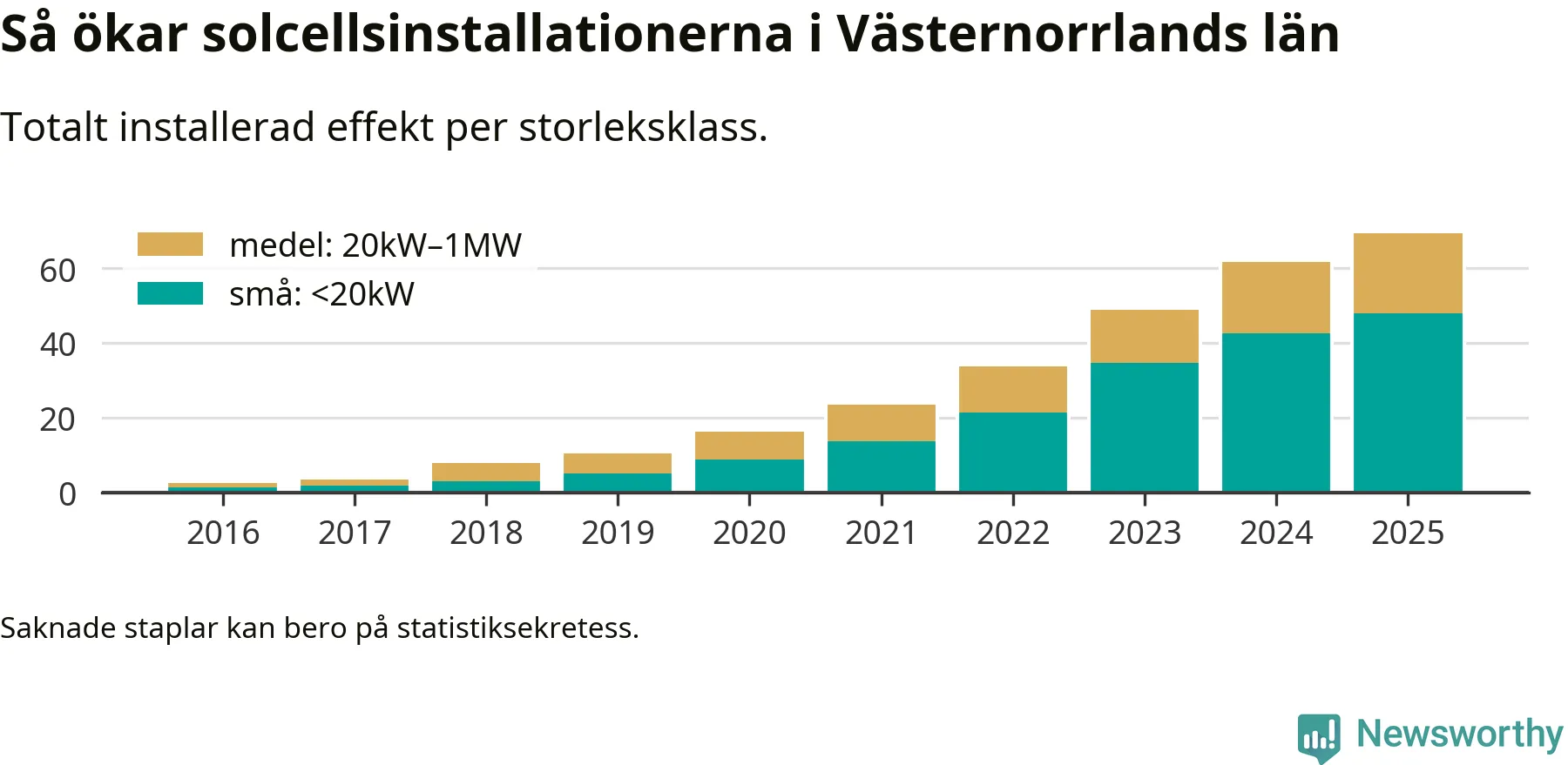 Totalt finns 4 863 nätanslutna anläggningar, om sammanlagt 69,3 megawatt i länet. Det motsvarar, i runda tal, en elproduktion på någonstans mellan fem och sex procent av vad hushållen i Västernorrland förbrukar per år.1