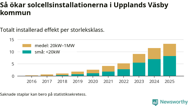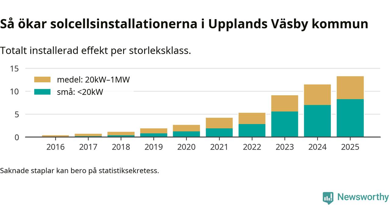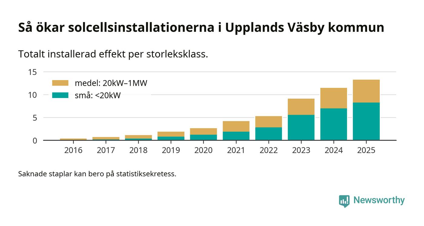 Totalt finns 858 nätanslutna anläggningar, om sammanlagt 13,2 megawatt i kommunen. Det motsvarar, i runda tal, en elproduktion på någonstans mellan åtta och tio procent av vad hushållen i Upplands Väsby förbrukar per år.1