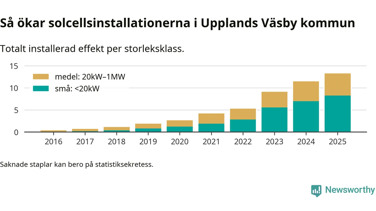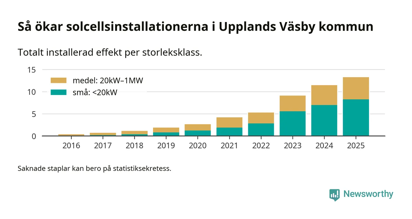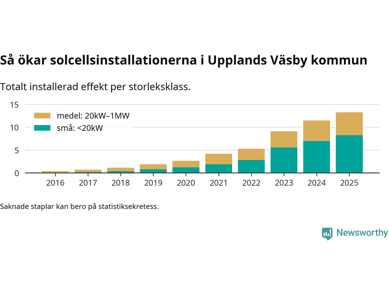 Under 2025 anslöts 1,8 megawatt ny solel till elnätet i Upplands Väsby kommun, en ökning med 16 procent jämfört med året innan.
