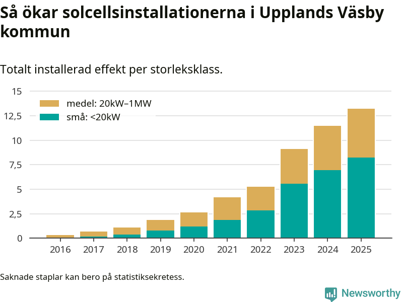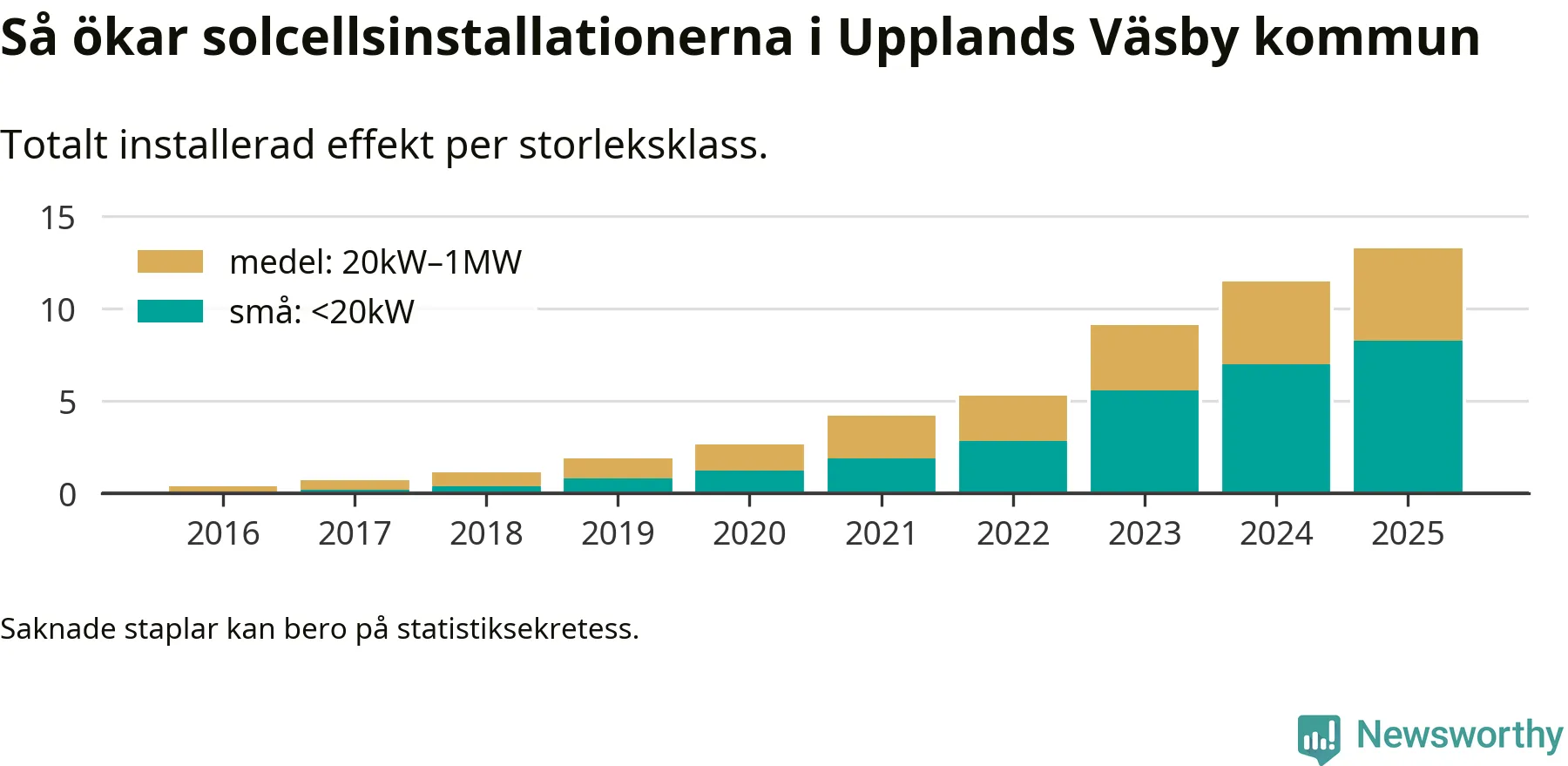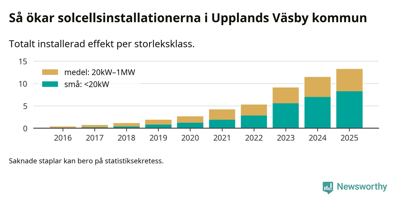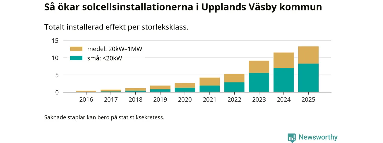 Under 2025 anslöts 1,8 megawatt ny solel till elnätet i Upplands Väsby kommun, en ökning med 16 procent jämfört med året innan.