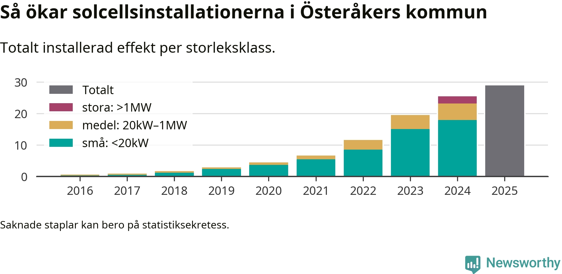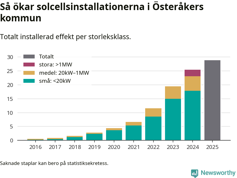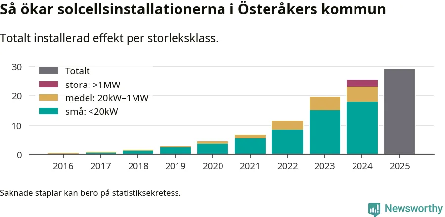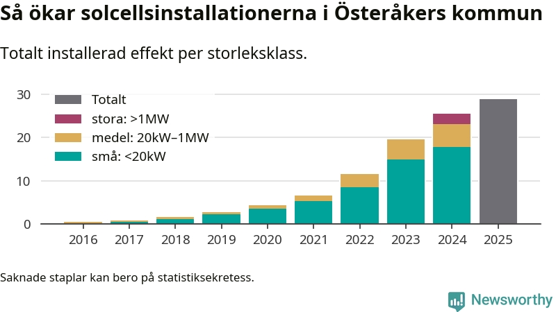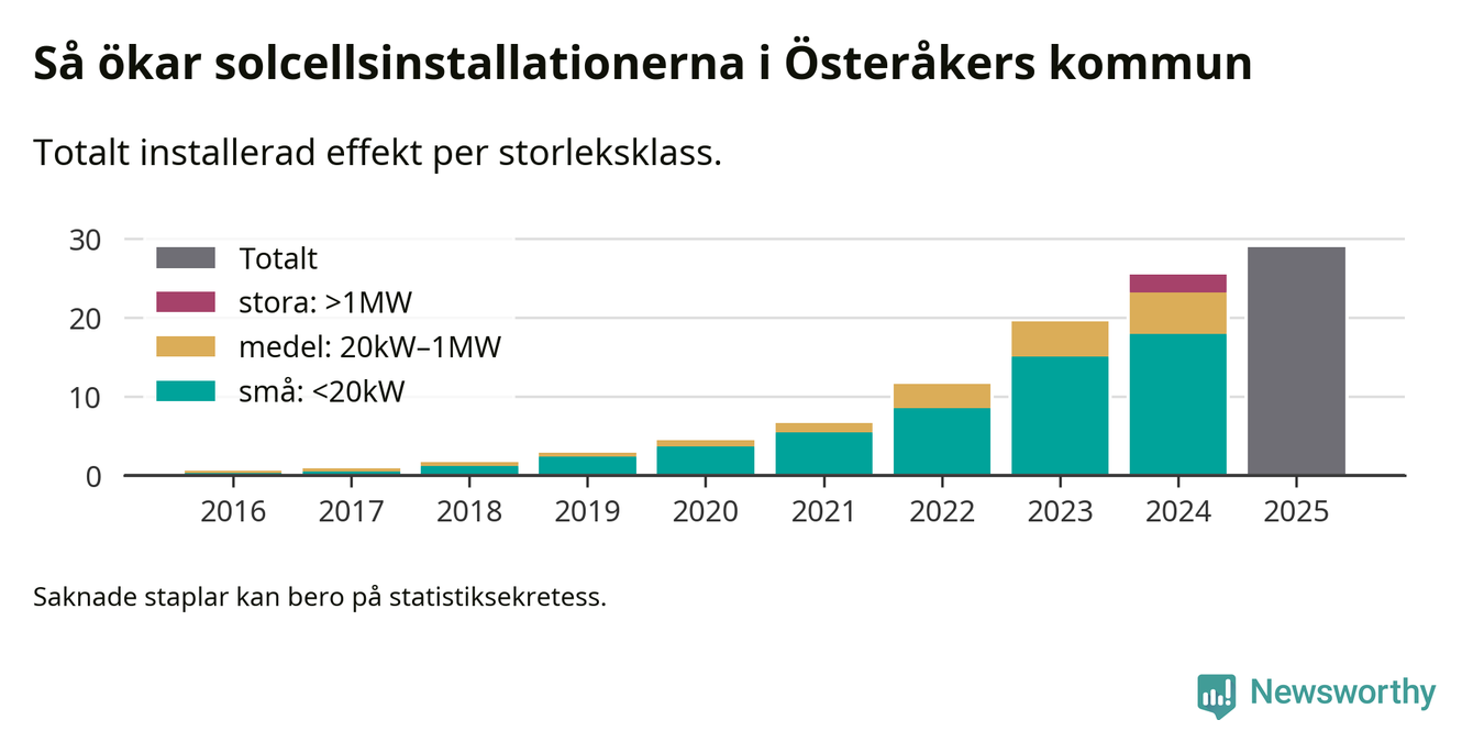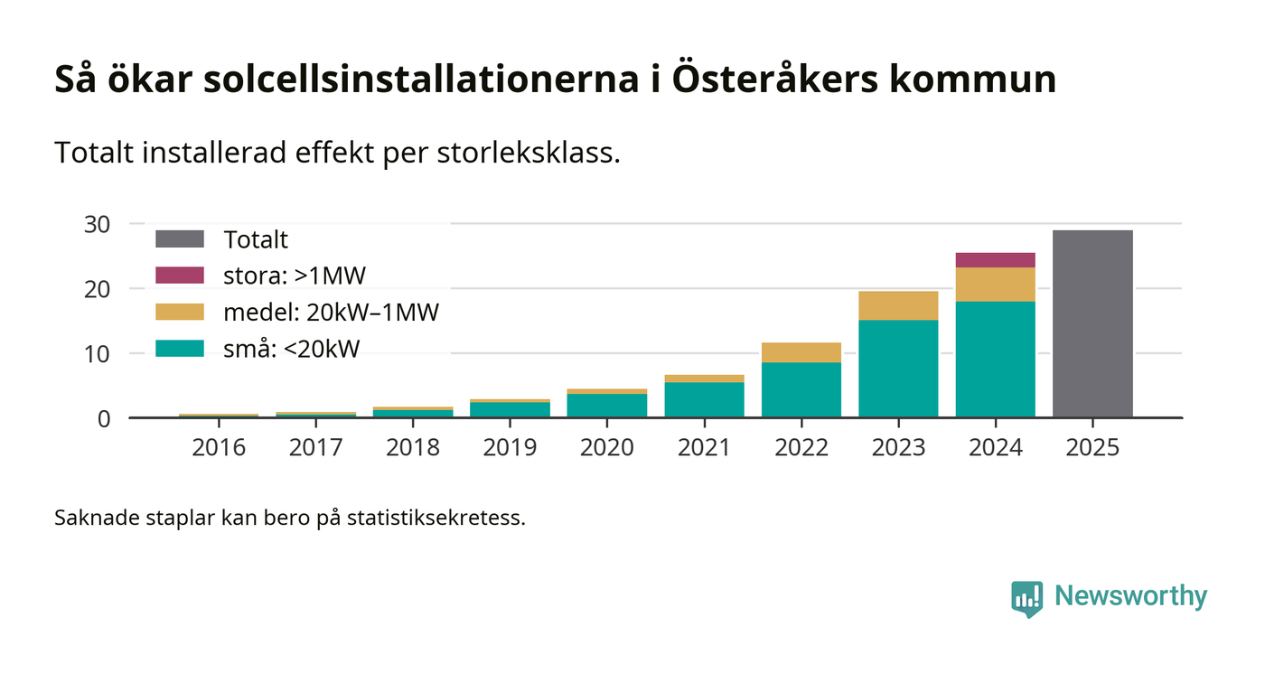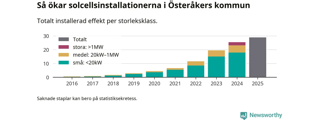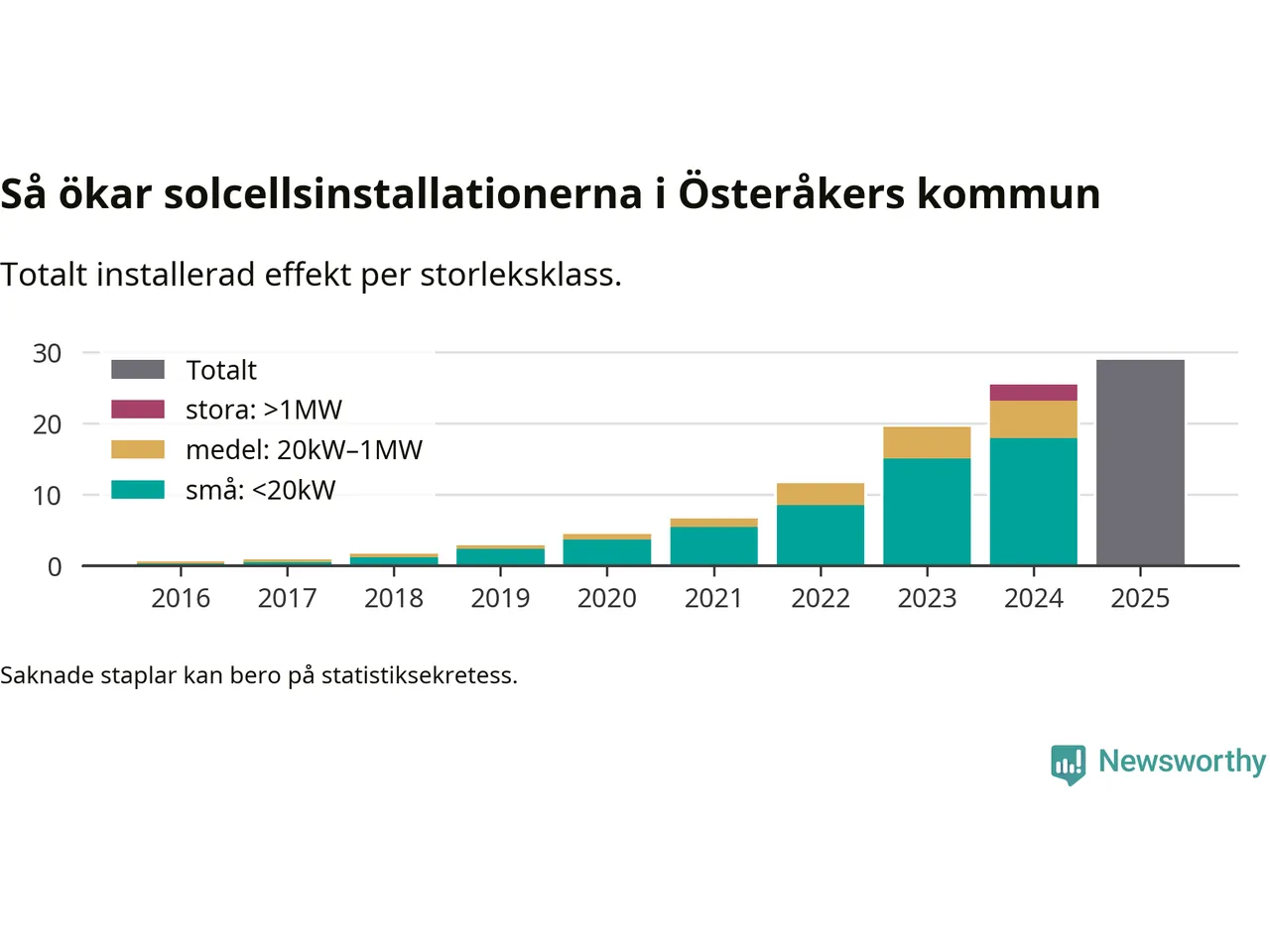 Under 2025 anslöts 3,5 megawatt ny solel till elnätet i Österåkers kommun, en ökning med 14 procent jämfört med året innan.