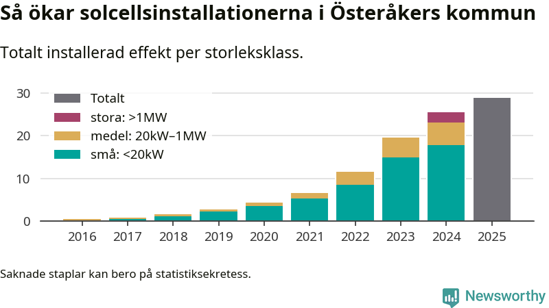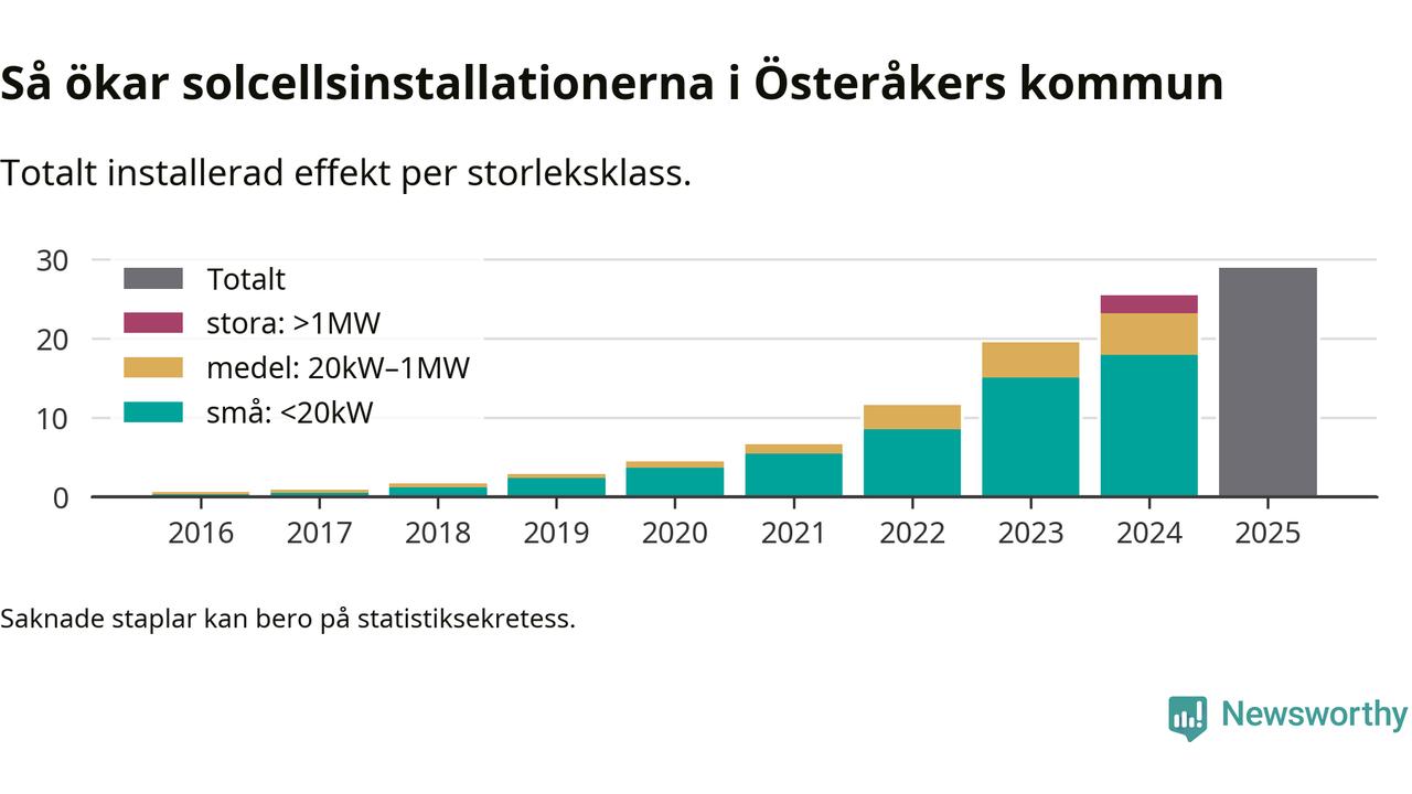 Totalt finns 2 101 nätanslutna anläggningar, om sammanlagt 28,9 megawatt i kommunen. Det motsvarar, i runda tal, en elproduktion på någonstans mellan tio och tolv procent av vad hushållen i Österåker förbrukar per år.1