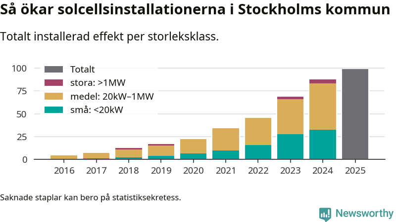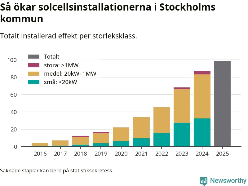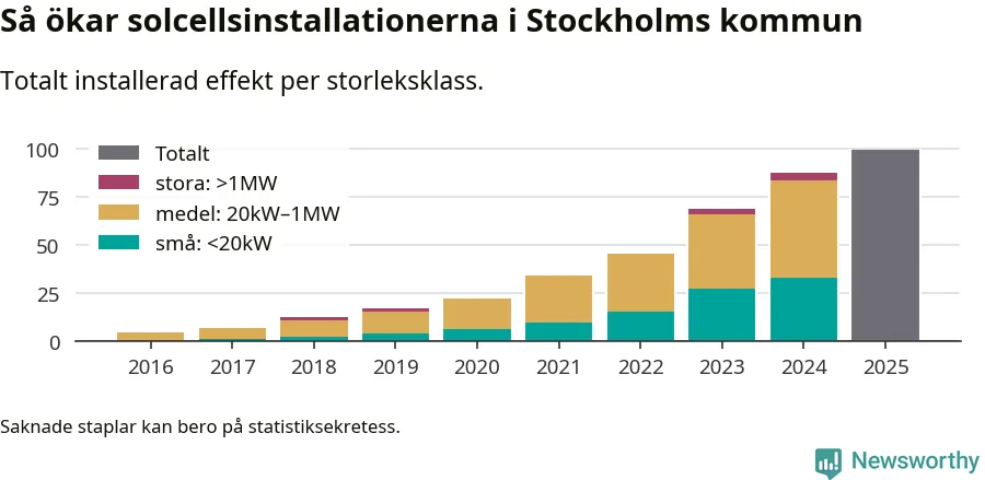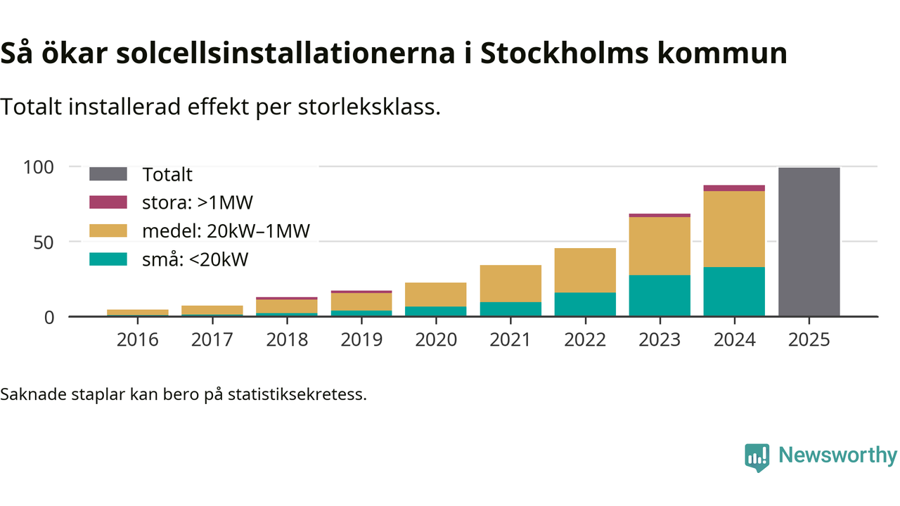 Det är framför allt de stora anläggningarna som driver tillväxten. Småskalig solel dominerar fortfarande produktionen – mer än hälften av effekten finns i anläggningar under 20 kilowatt – men det är bland de stora anläggningarna vi ser den största ökningstakten.