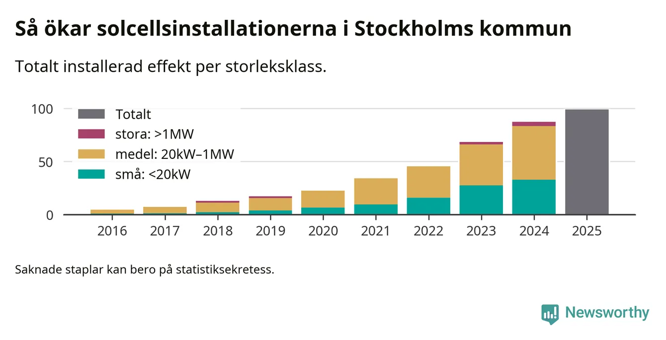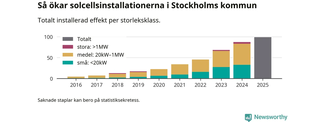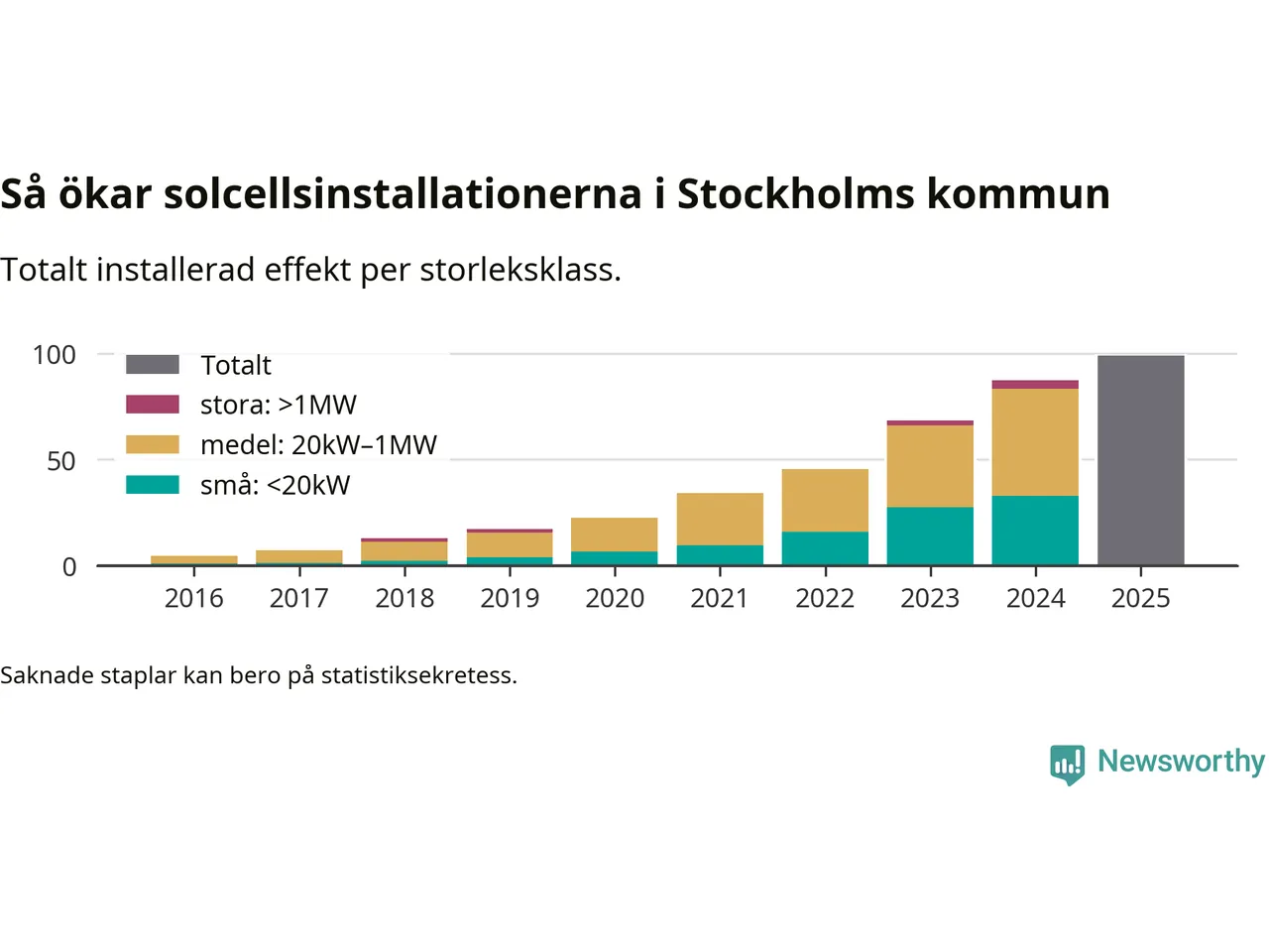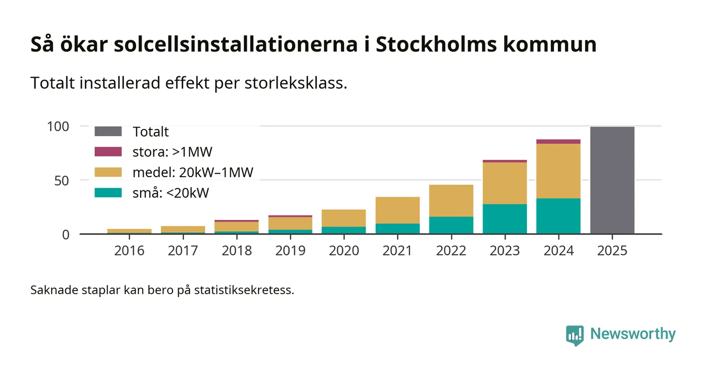 Under 2025 anslöts 11,7 megawatt ny solel till elnätet i Stockholms kommun, en ökning med 13 procent jämfört med året innan.