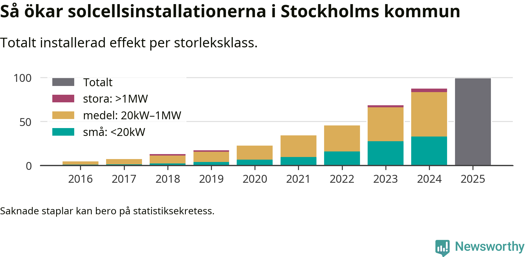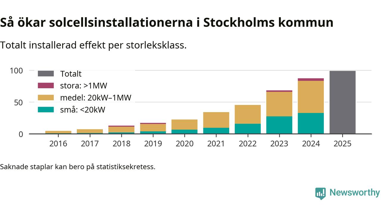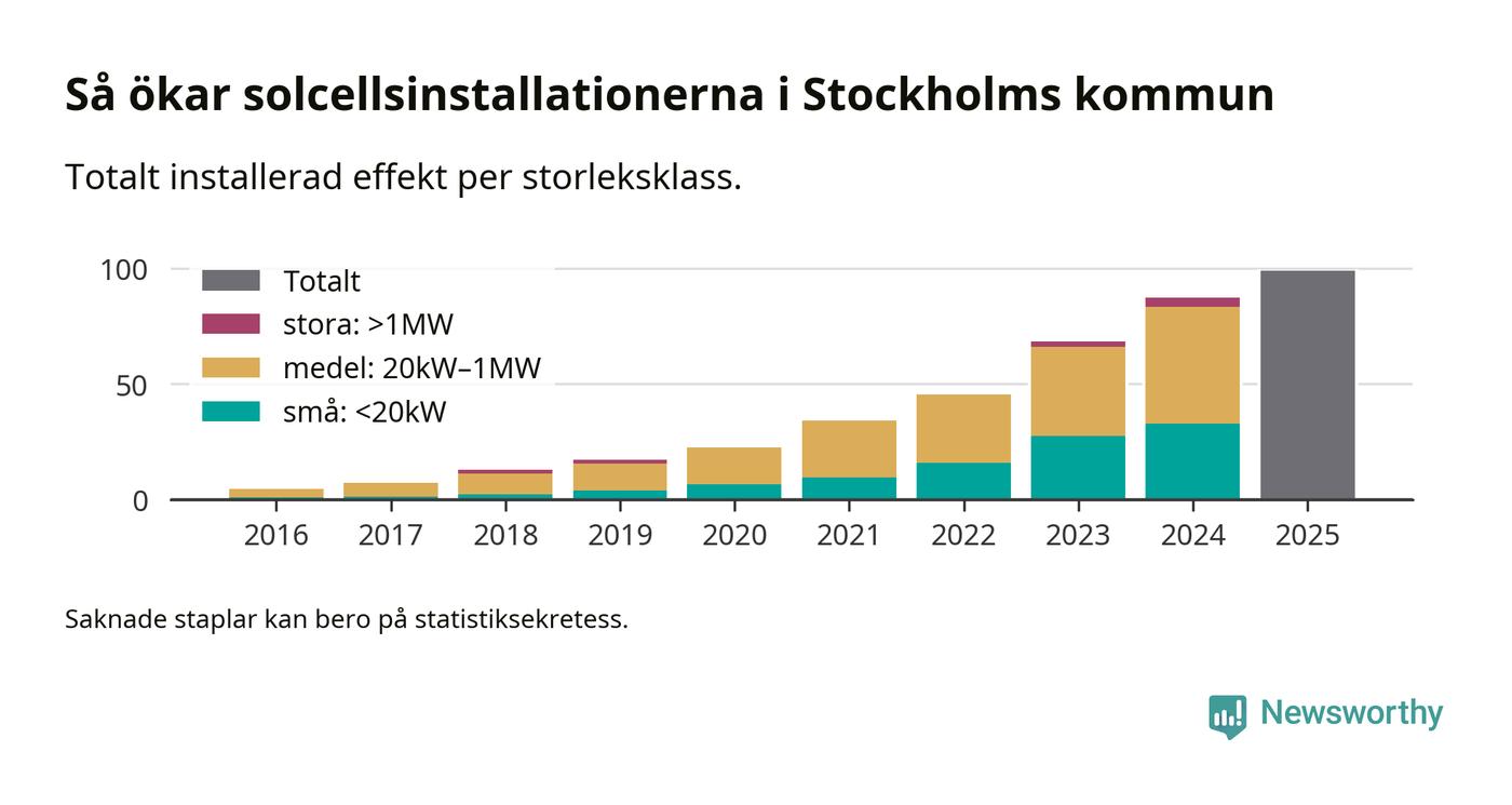 Totalt finns 4 607 nätanslutna anläggningar, om sammanlagt 99 megawatt i kommunen – femte mest i hela landet. Det motsvarar, i runda tal, en elproduktion på någonstans mellan fem och sex procent av vad hushållen i Stockholms kommun förbrukar per år.1