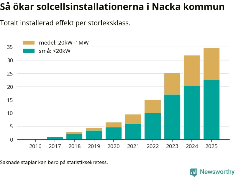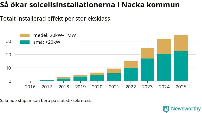 Den största delen av solelen i Nacka, 65 procent, kommer från småskaliga anläggningar, totalt 2 084 stycken. Det påminner om hur det ser ut i riket som helhet. I hela Sverige står anläggningar under 20 kilowatt för mer än hälften av den installerade effekten. Generellt är deras andel störst i kommuner med många villahushåll, medan större anläggningar dominerar i tätbefolkade kommuner med fler flerfamiljsbostäder – och förstås i de småkommuner som har någon av landets stora markanläggningar för solel.