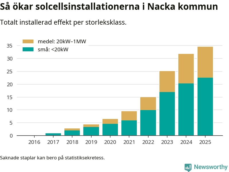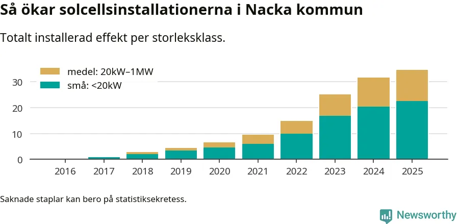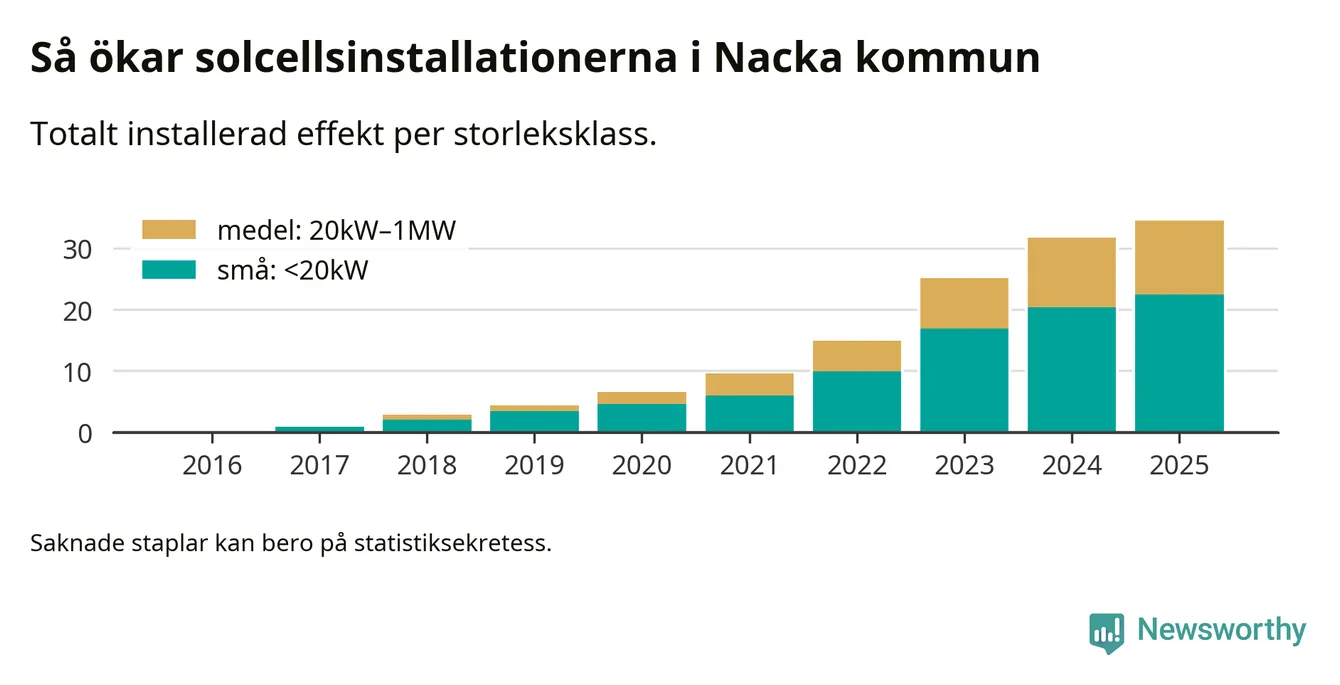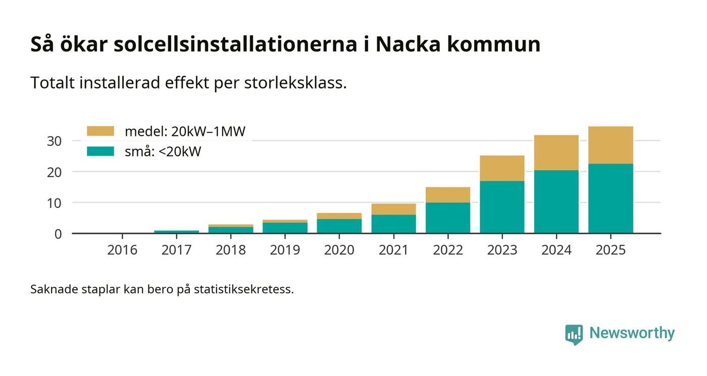 Under 2025 anslöts 2,8 megawatt ny solel till elnätet i Nacka kommun, en ökning med 9 procent jämfört med året innan.