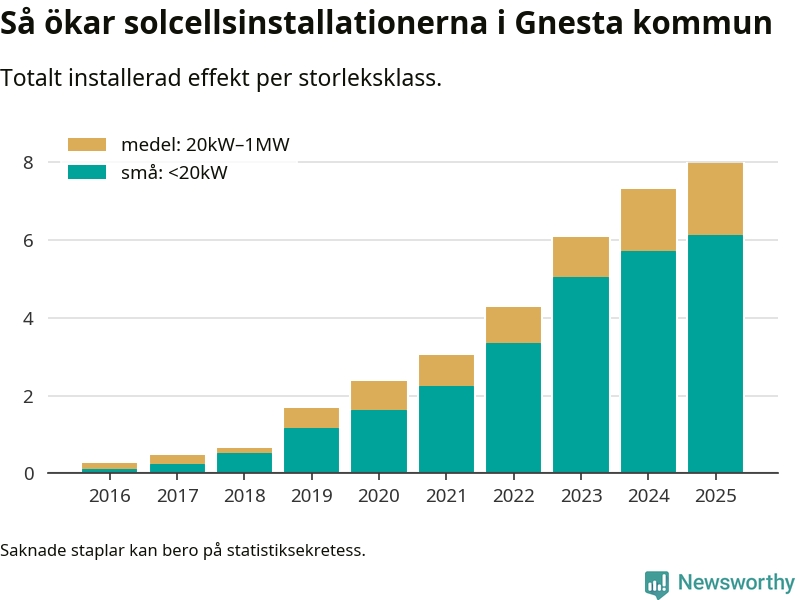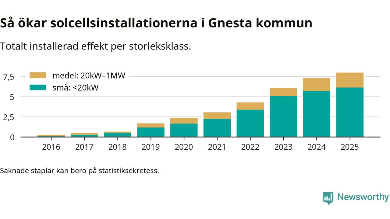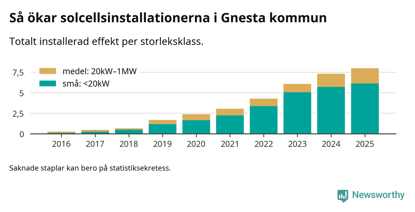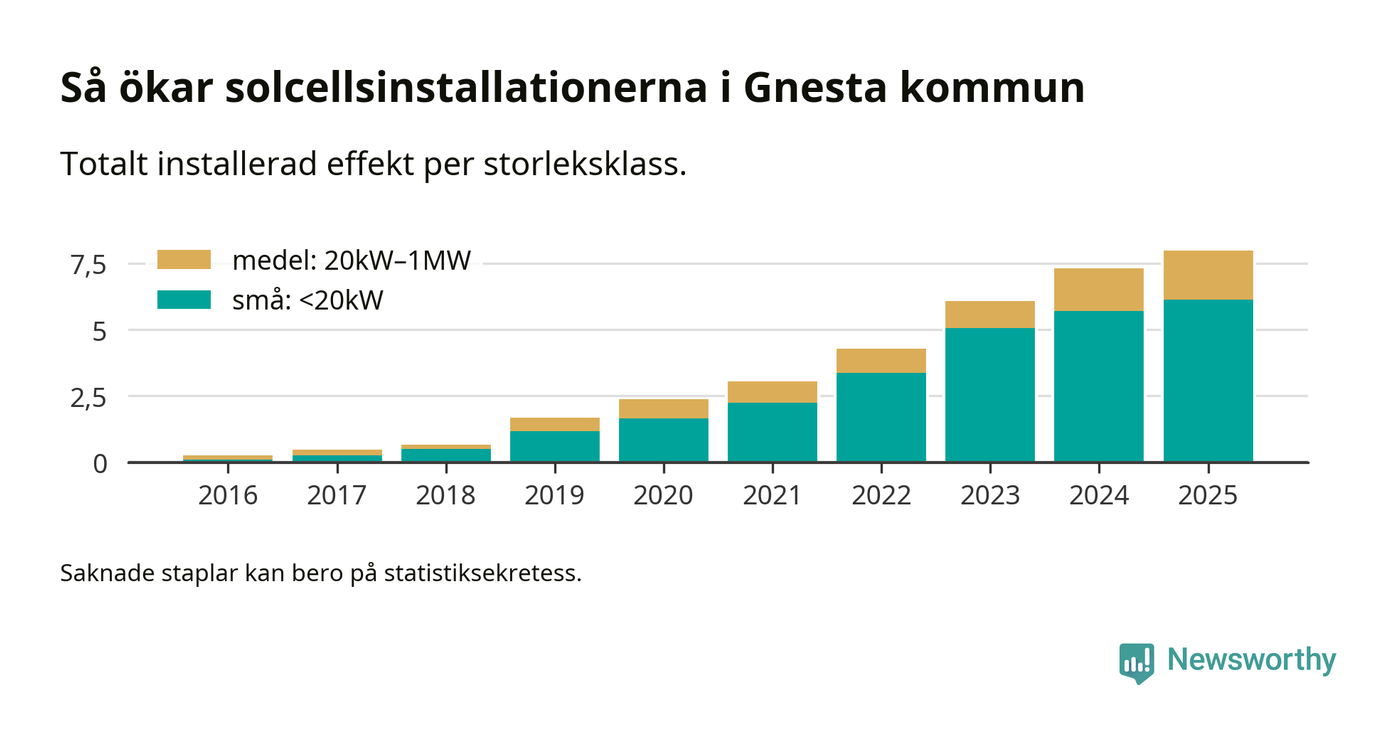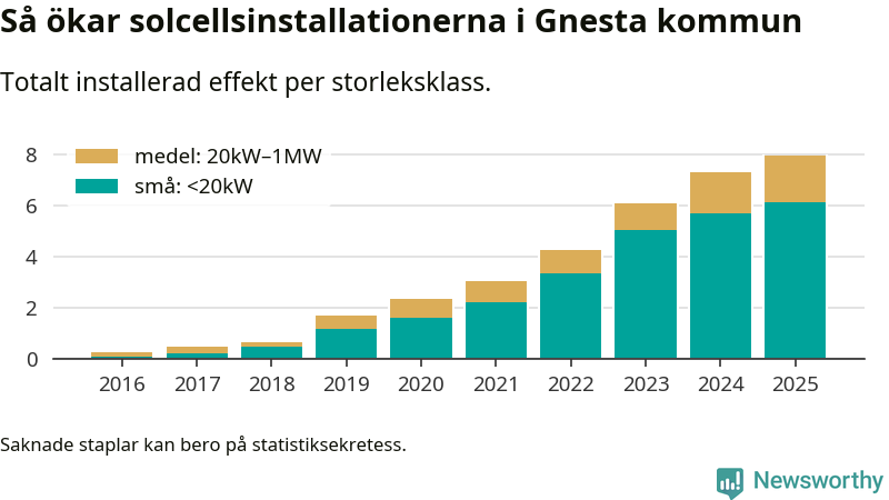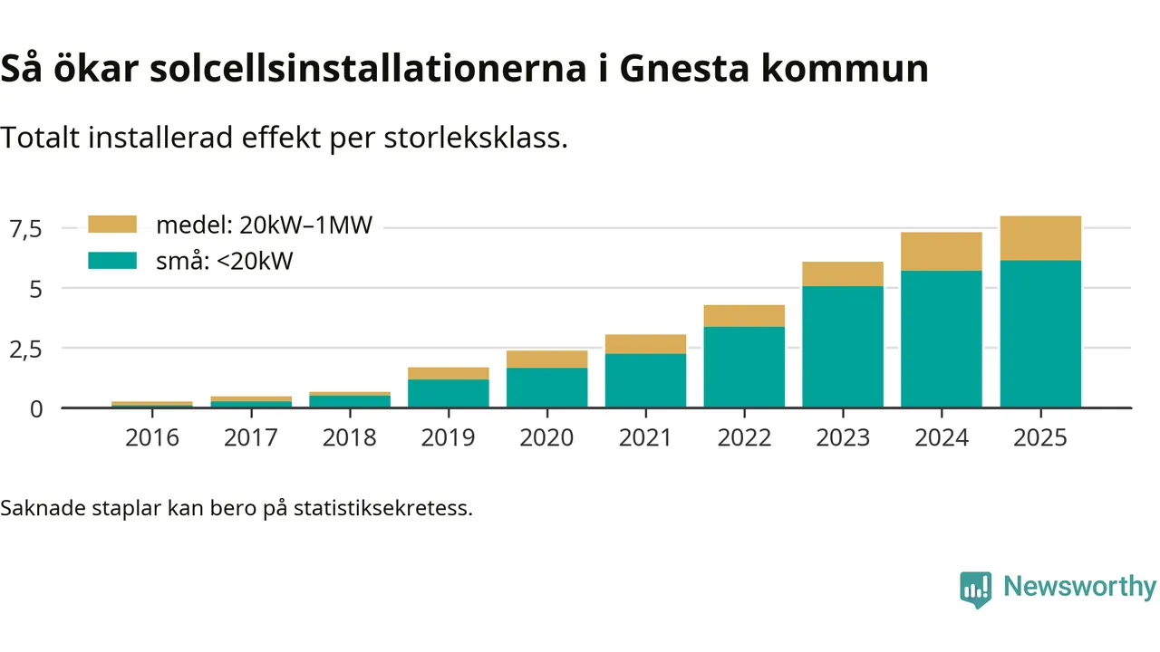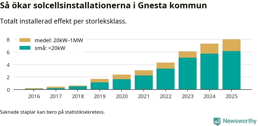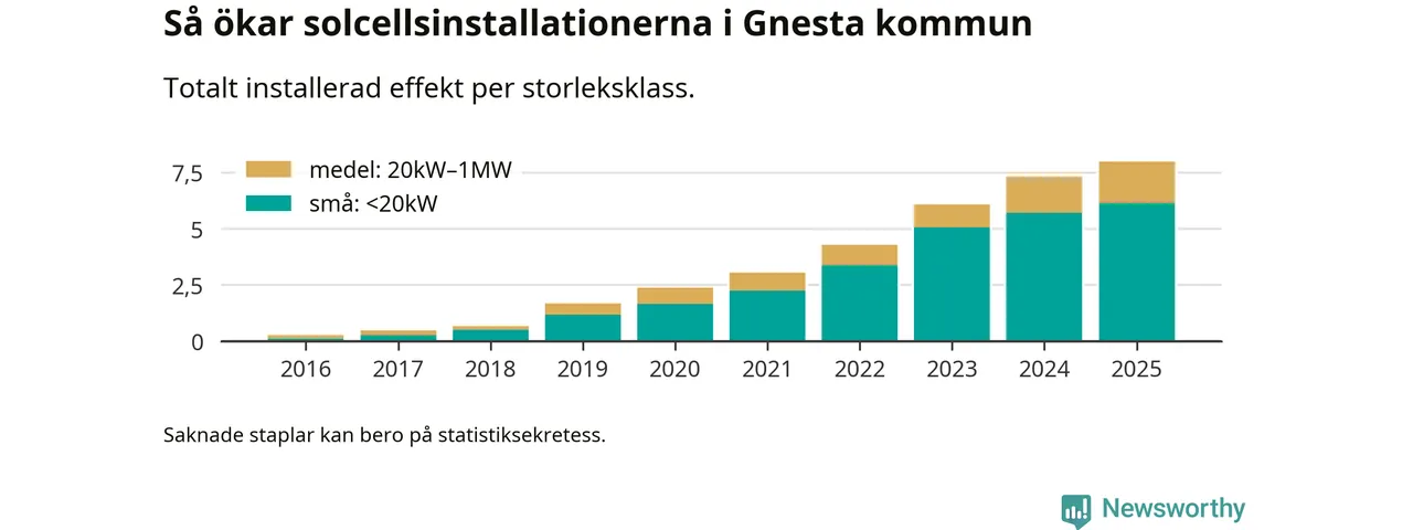 Under 2025 anslöts 0,7 megawatt ny solel till elnätet i Gnesta kommun, en ökning med 9 procent jämfört med året innan.