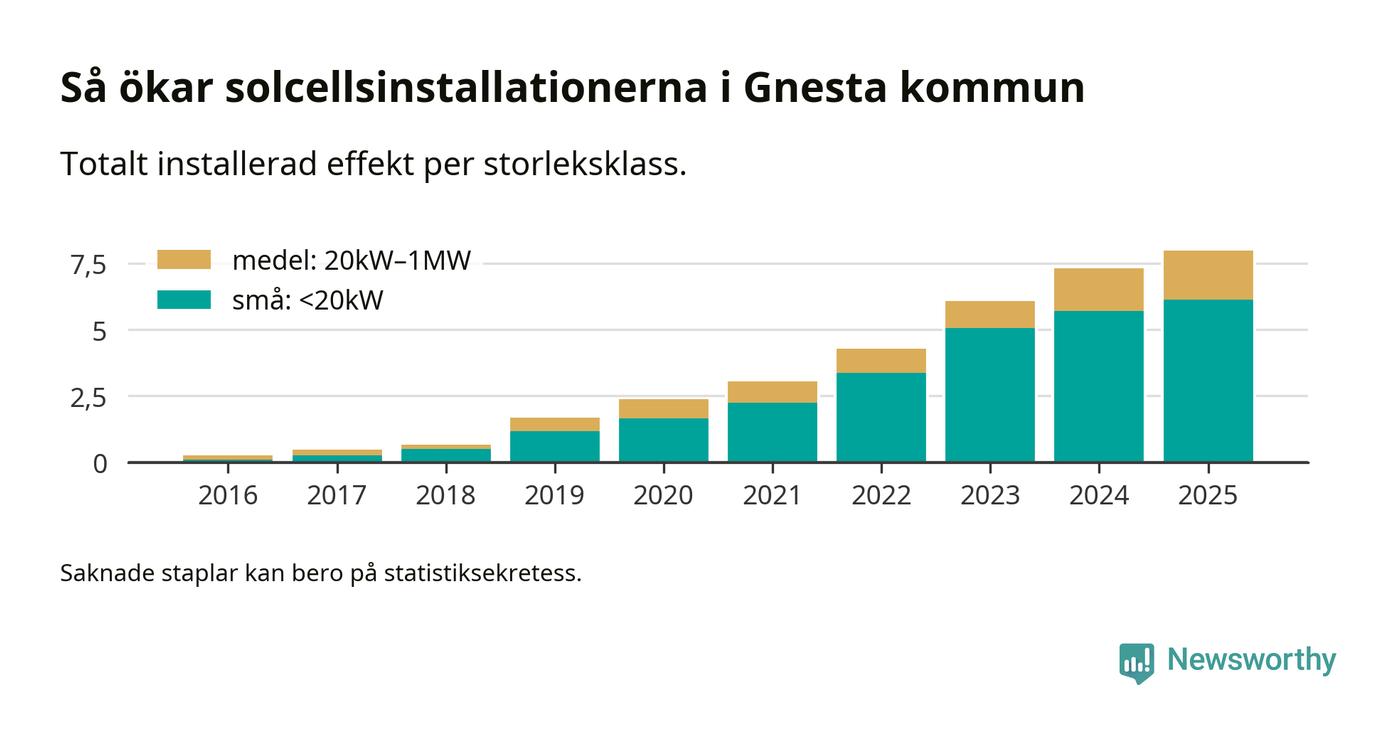 Totalt finns 612 nätanslutna anläggningar, om sammanlagt 8 megawatt i kommunen. Det motsvarar, i runda tal, en elproduktion på någonstans mellan 18 och 21 procent av vad hushållen i Gnesta förbrukar per år.1