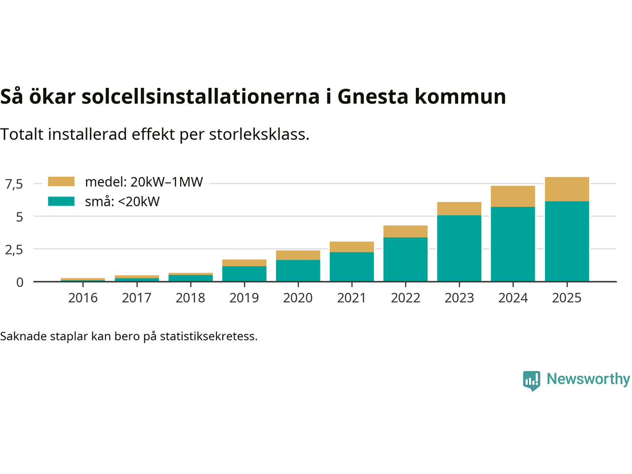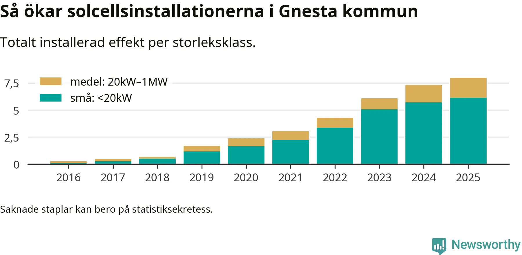 Det är framför allt de stora anläggningarna som driver tillväxten. Småskalig solel dominerar fortfarande produktionen – mer än hälften av effekten finns i anläggningar under 20 kilowatt – men det är bland de stora anläggningarna vi ser den största ökningstakten.