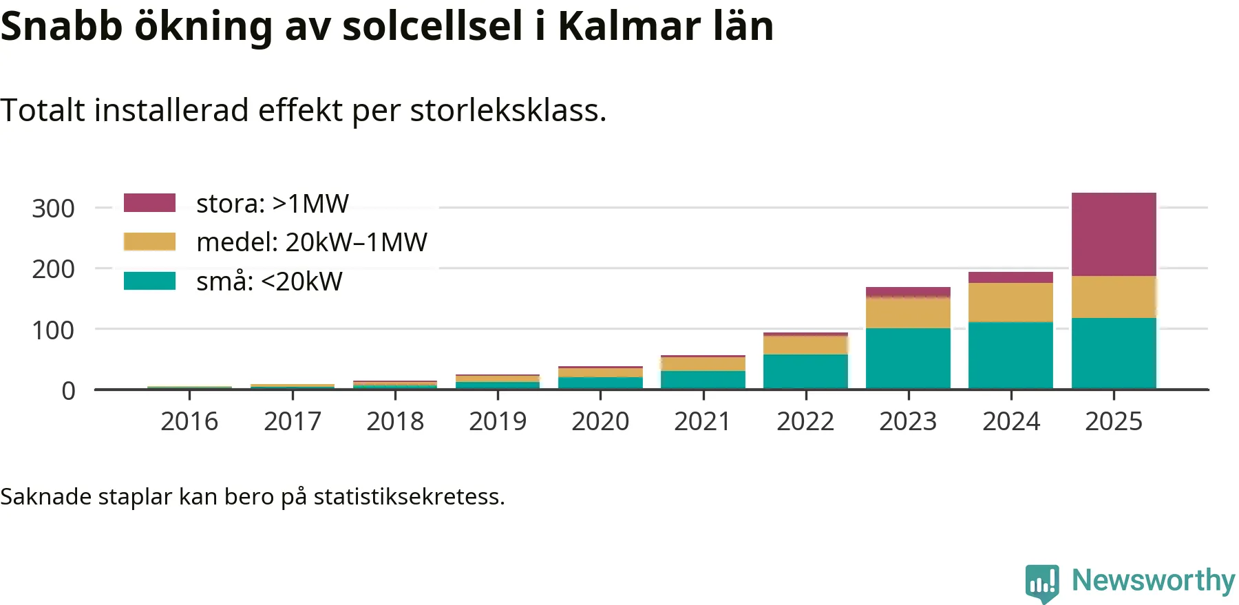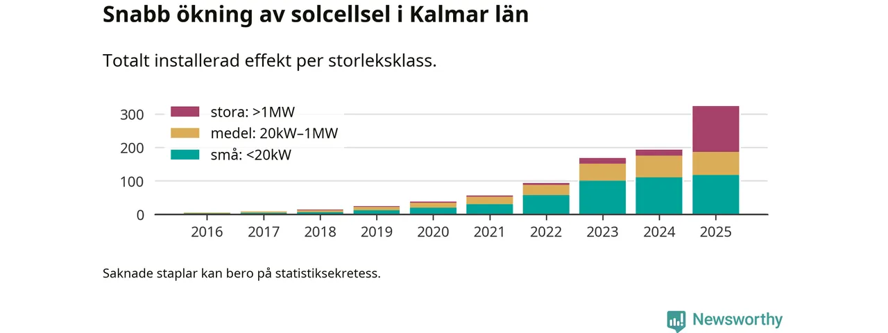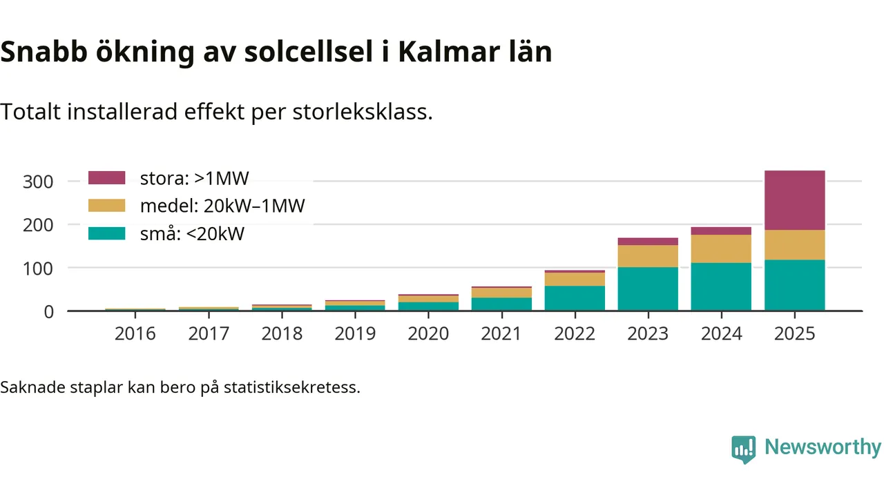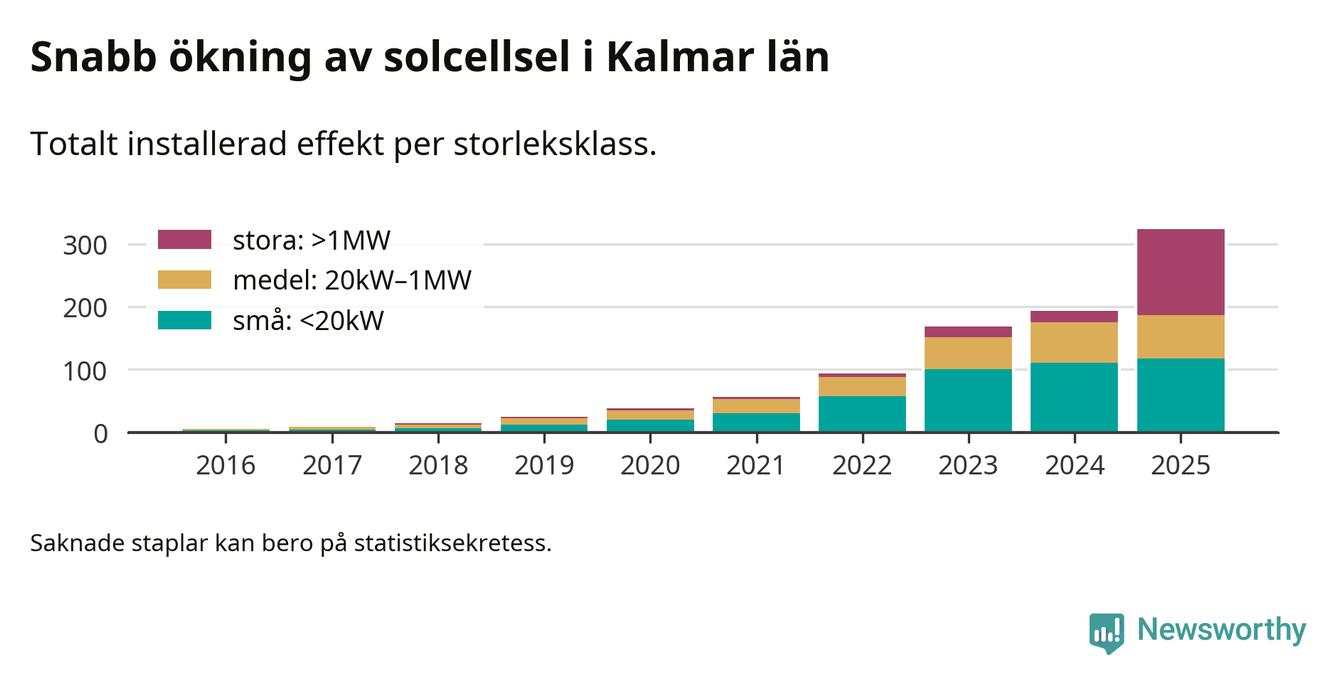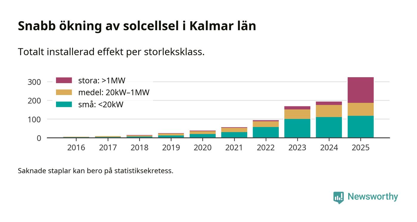 Det är framför allt de stora anläggningarna som driver tillväxten. Småskalig solel dominerar fortfarande produktionen – mer än hälften av effekten finns i anläggningar under 20 kilowatt – men det är bland de stora anläggningarna vi ser den största ökningstakten.