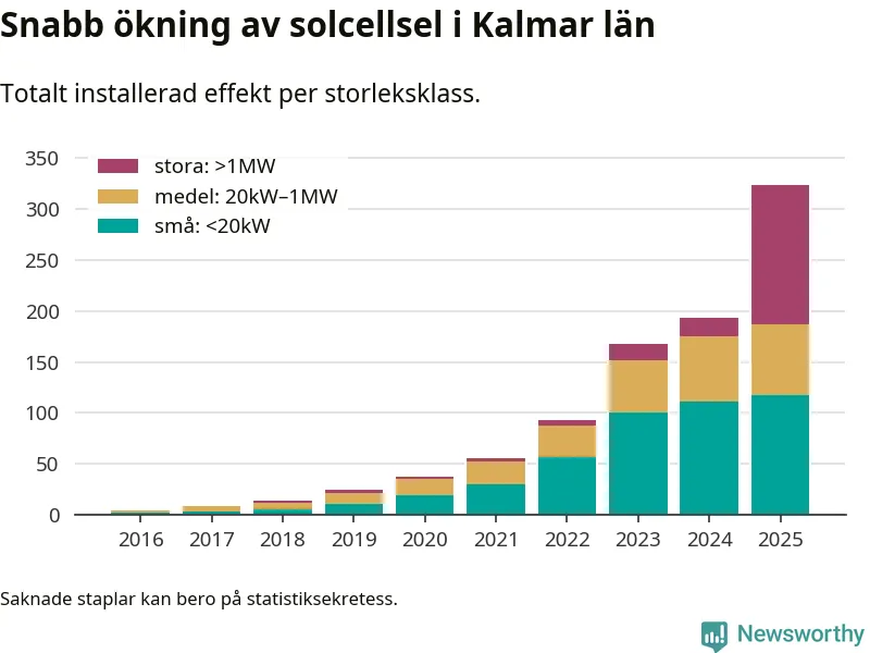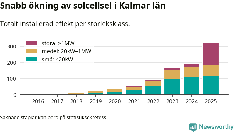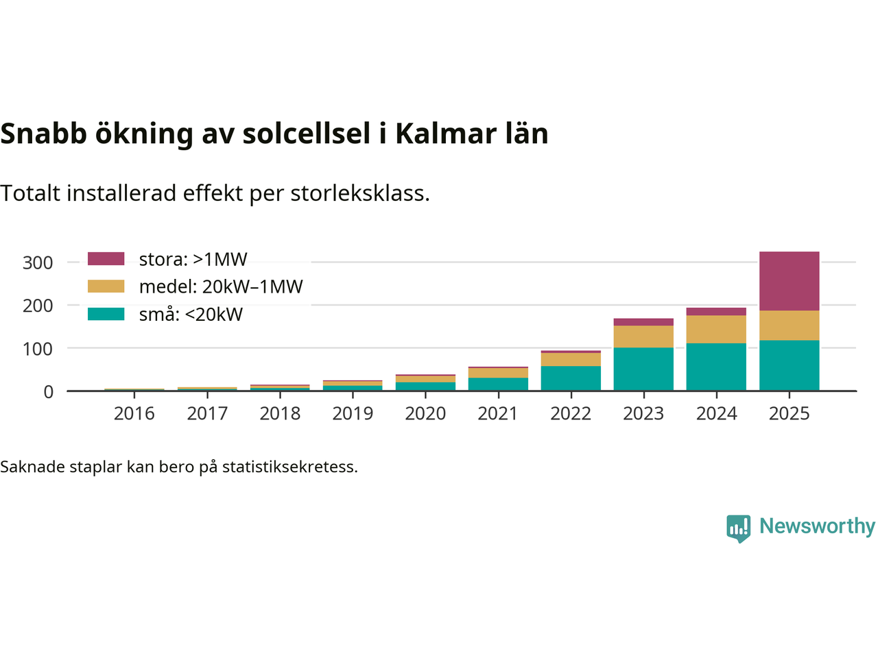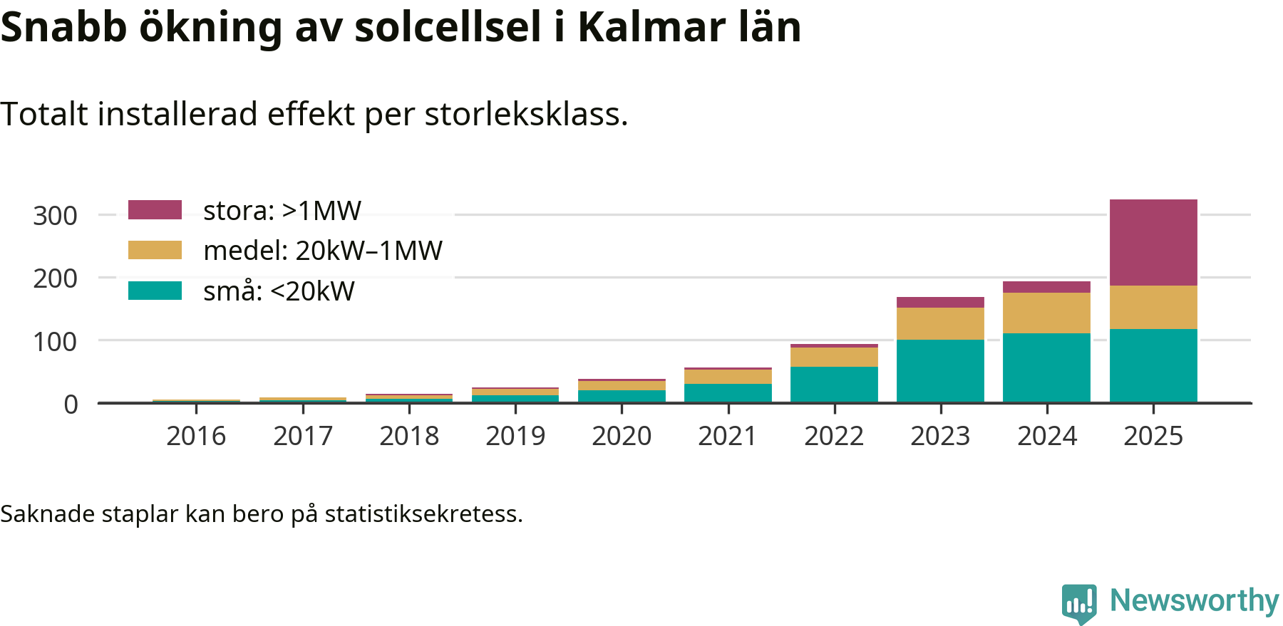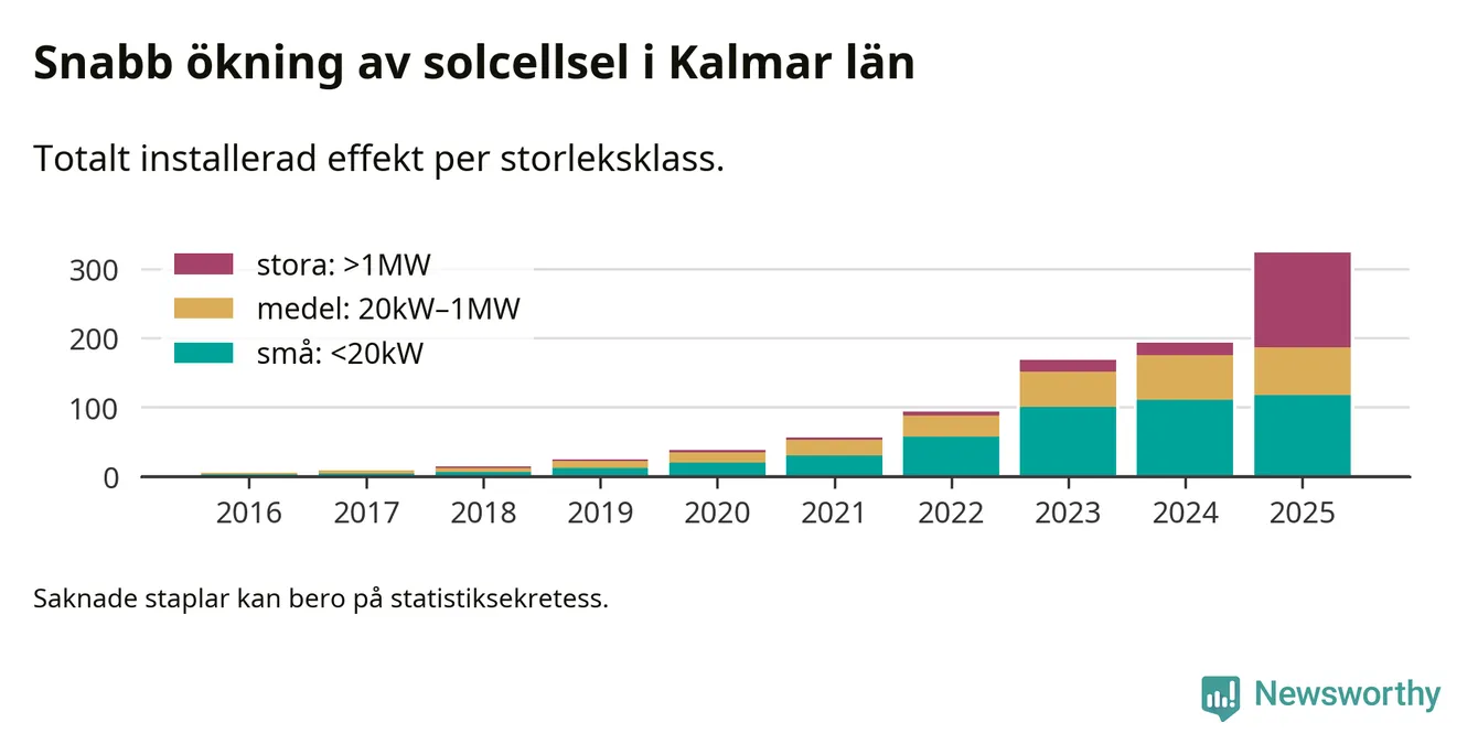 Det är framför allt de stora anläggningarna som driver tillväxten. Småskalig solel dominerar fortfarande produktionen – mer än hälften av effekten finns i anläggningar under 20 kilowatt – men det är bland de stora anläggningarna vi ser den största ökningstakten.
