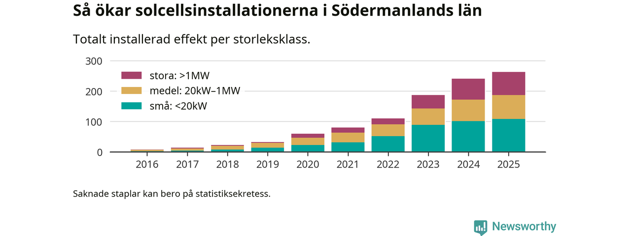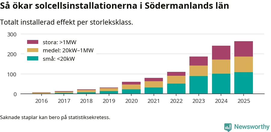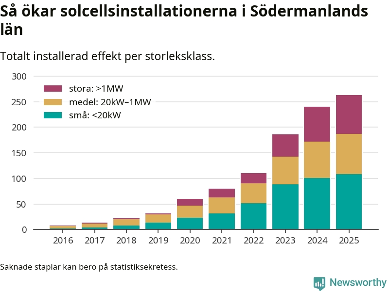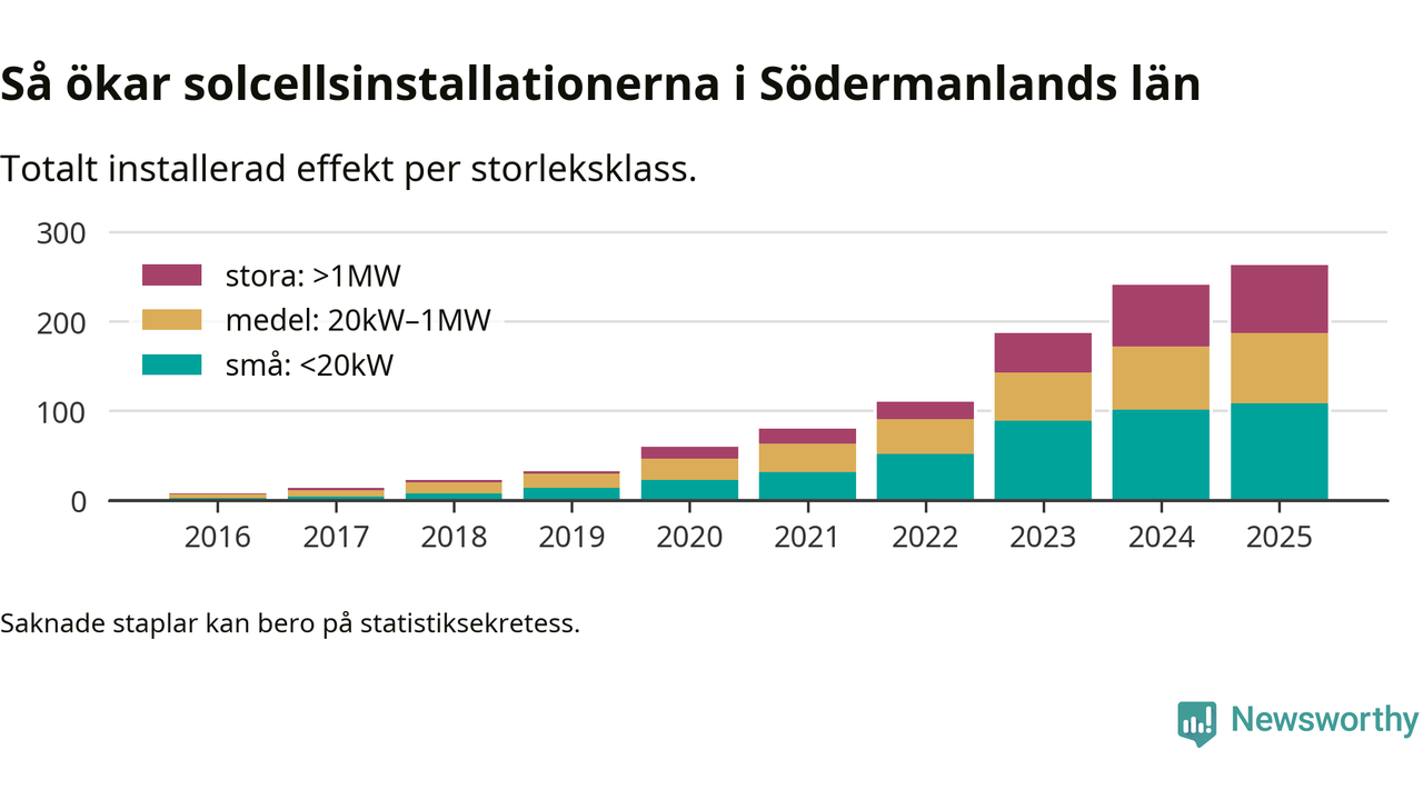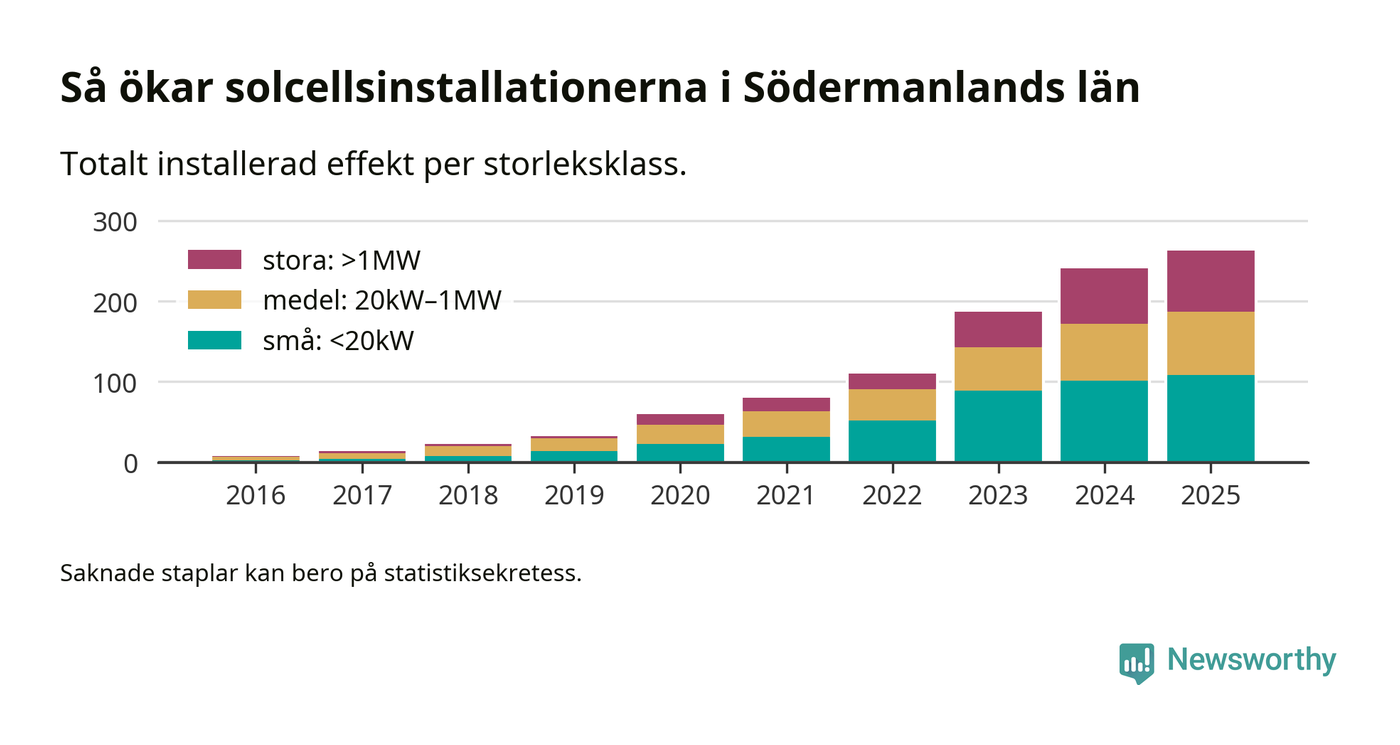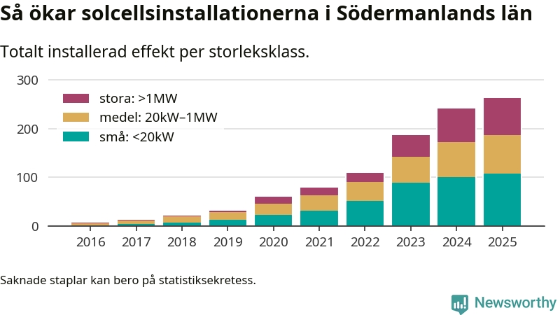 Det är framför allt de stora anläggningarna som driver tillväxten. Småskalig solel dominerar fortfarande produktionen – mer än hälften av effekten finns i anläggningar under 20 kilowatt – men det är bland de stora anläggningarna vi ser den största ökningstakten.